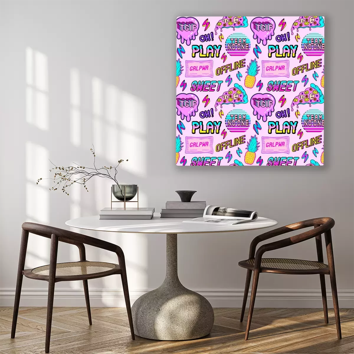 Bild: Colorful seamless pattern with vaporware style patches, stickers with pineapples, pizza slices, hearts, words and abbreviations "TGIF", "team no one", "offline", "play", etc. Pink background.