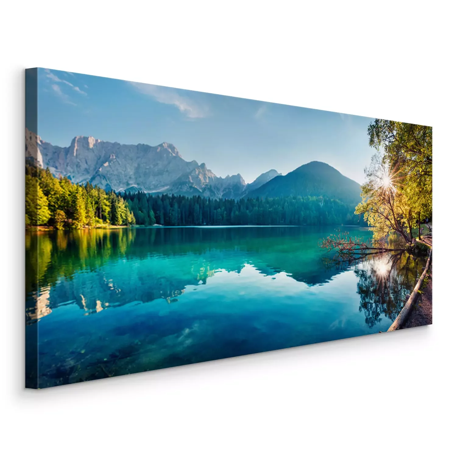 Bild Colorful summer view of Fusine lake. Bright morning scene of Julian Alps with Mangart peak on background, Province of Udine, Italy, Europe. Traveling concept background.