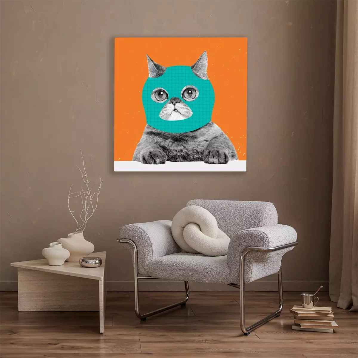 Bild: Creative portrait of cute cat wearing drawn balaclava isolated on bright neon background. Inspirative art, pets, animal, humor and fashion concept.