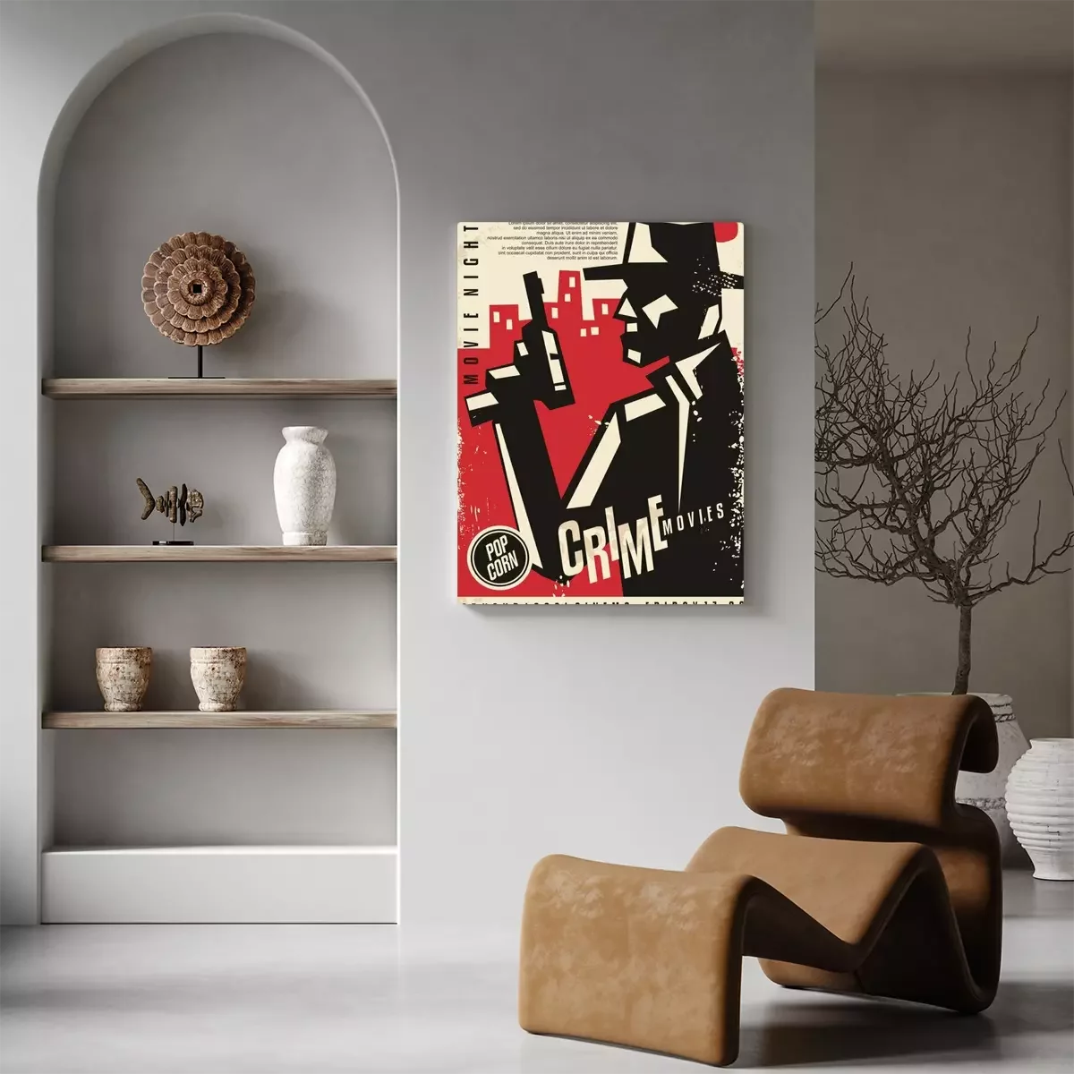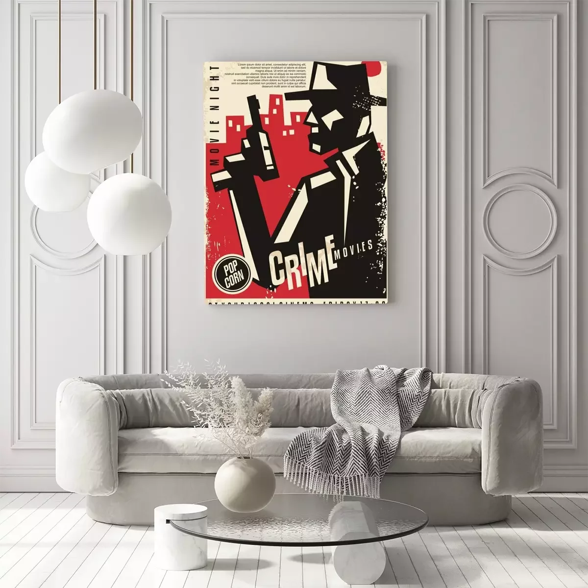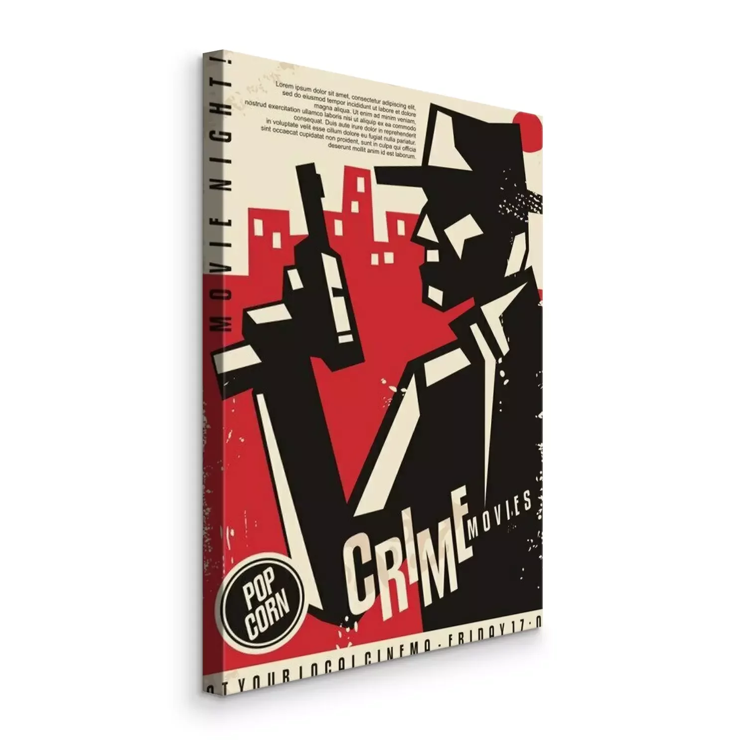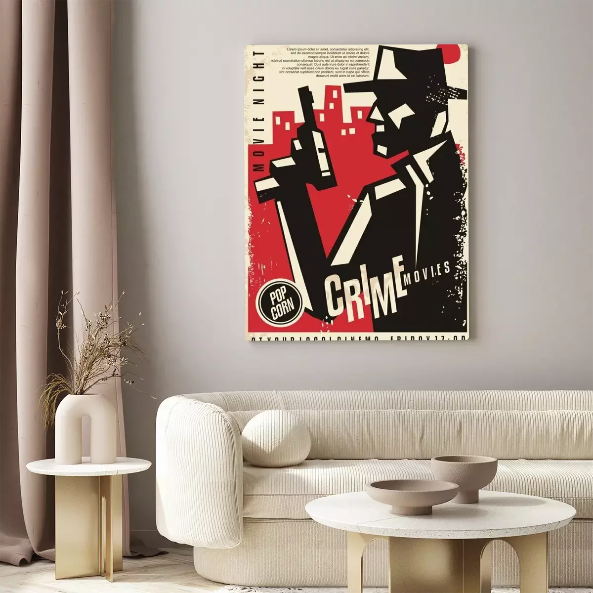 Bild Crime and noir films vintage cinema poster design with gangster graphic and city skyline. Retro secret agents movies flyer template. Vector graphic.