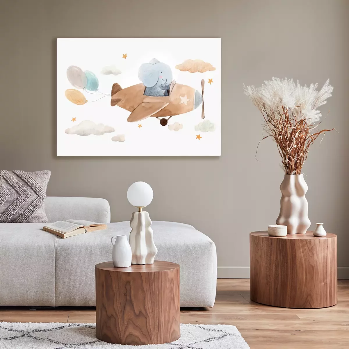 Bild: Cute watercolor artwork with baby elephant on the plane with air baloons, clouds and stars. Stock illustration.