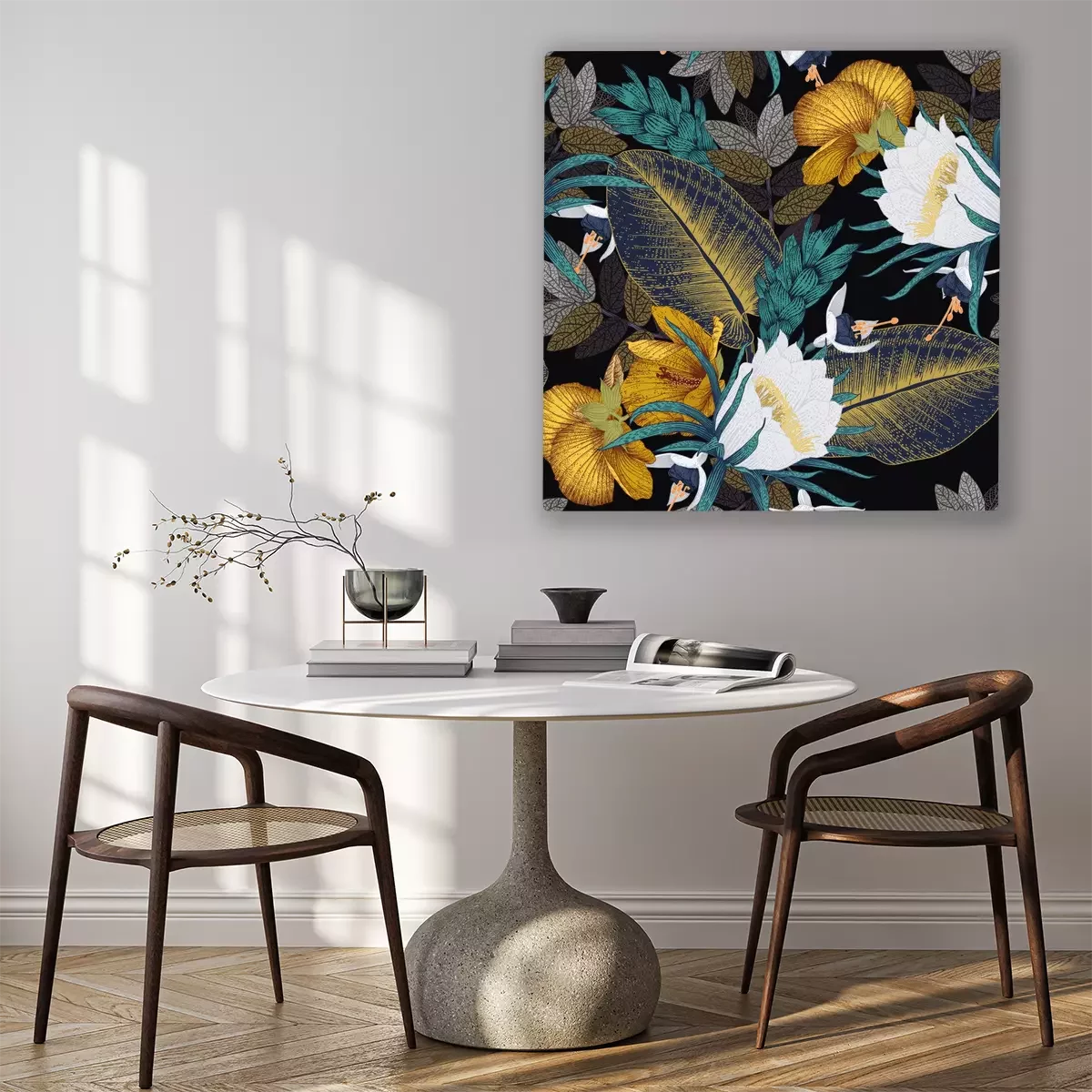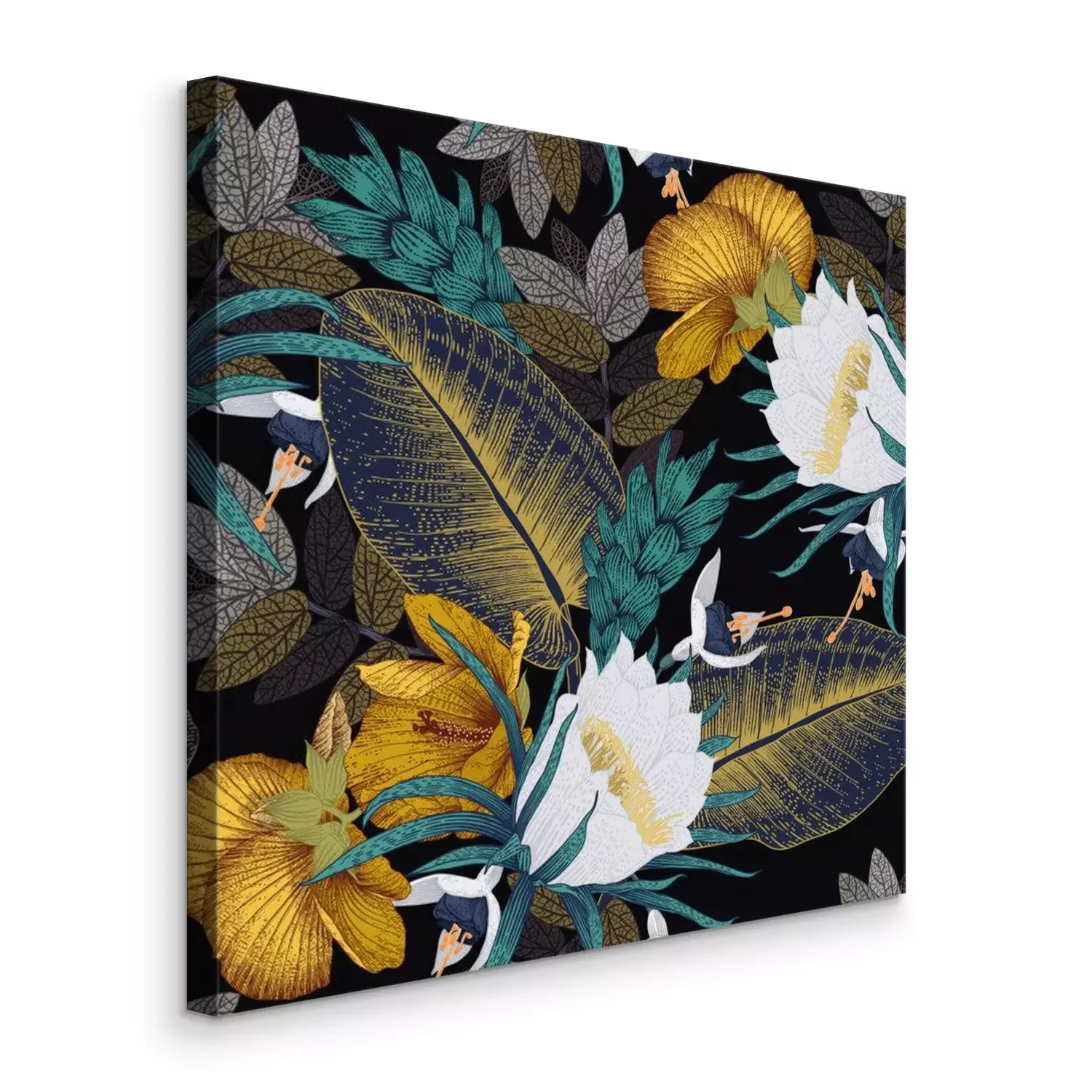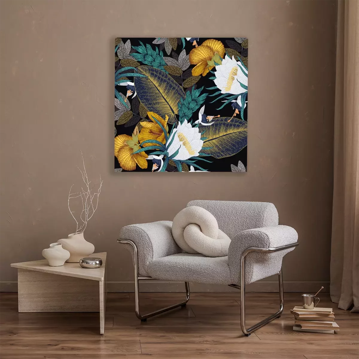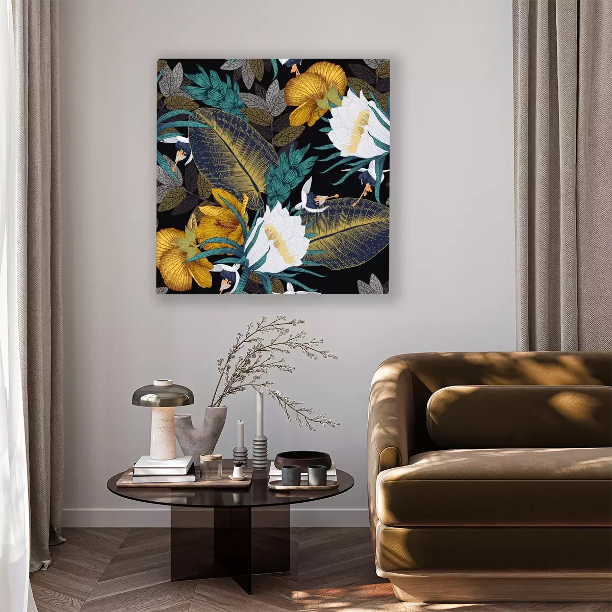 Abstrakte Flamingos inmitten von tropischen Blumen auf dunklem Hintergrund