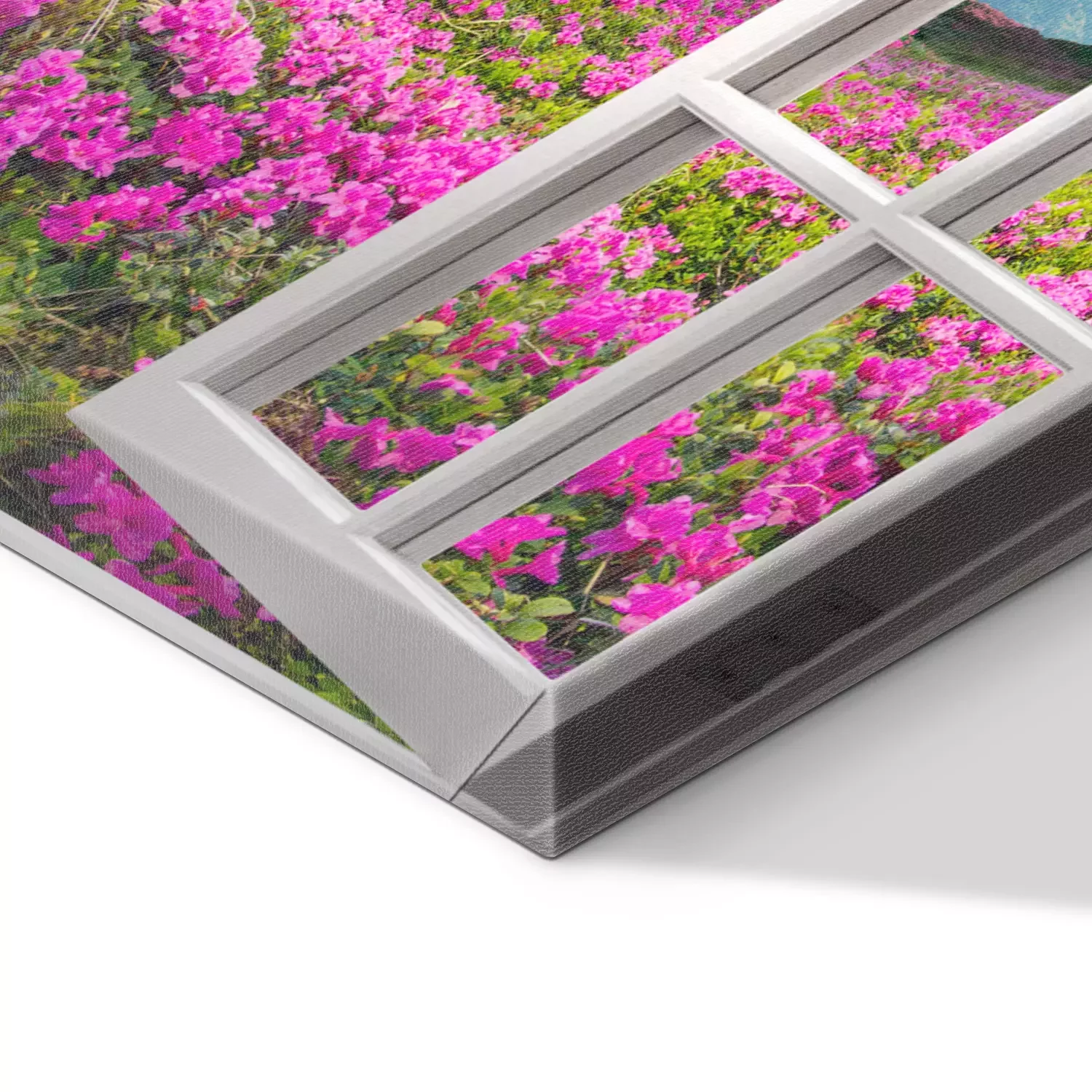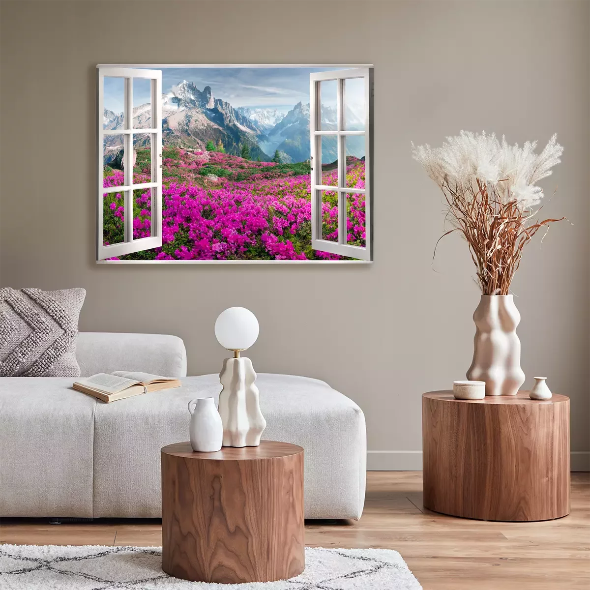 Der blick aus dem offenen fenster auf azaleen und berggipfel