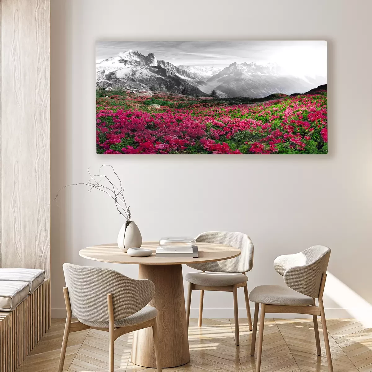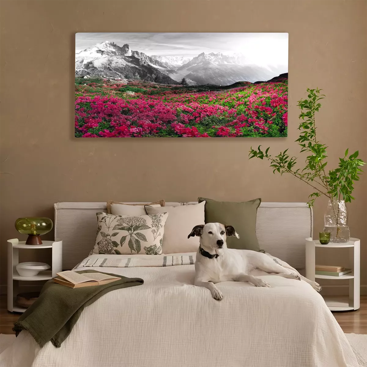 Der kontrast zwischen rosa azaleen und schwarz-weißen bergen