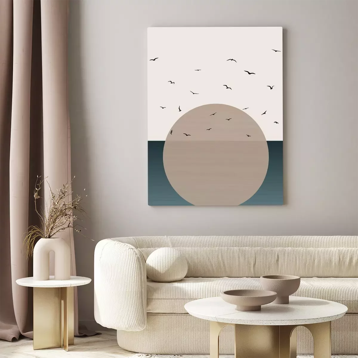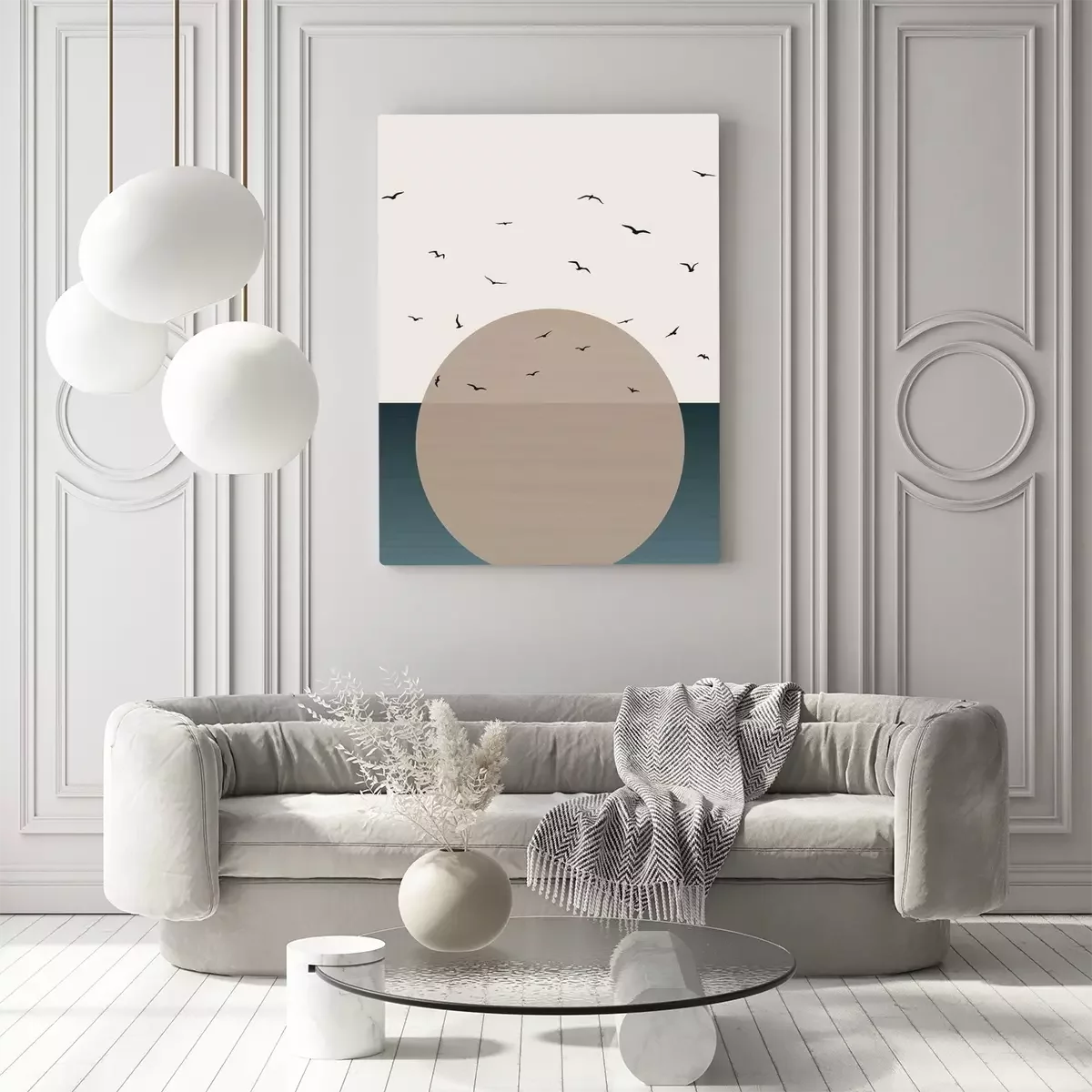 Der vollmond spiegelt sich im meer, umgeben von vögeln.