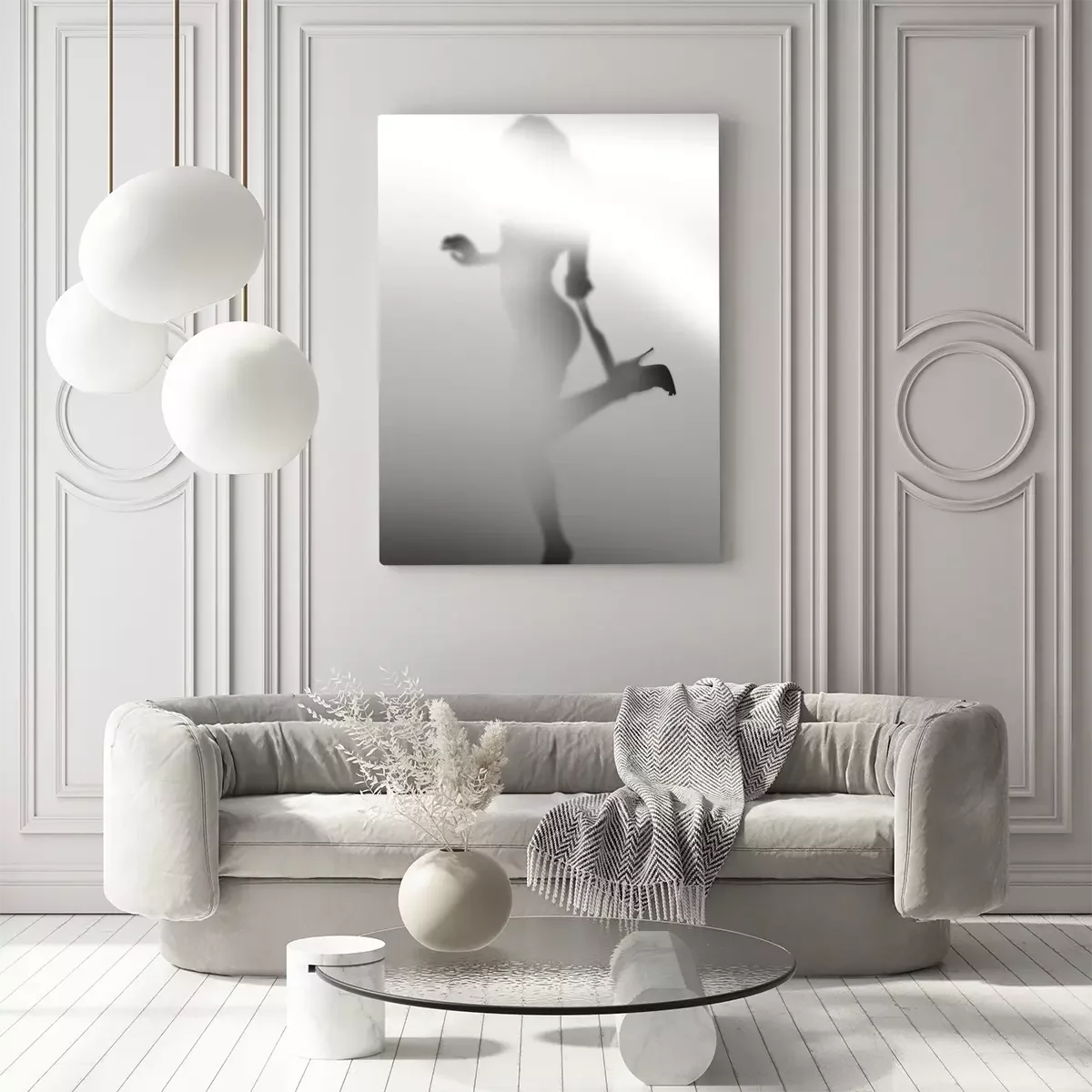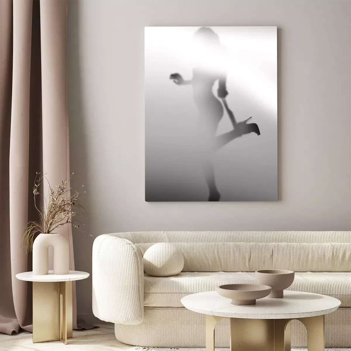 Die beleuchteten umrisse einer frau vor nebligem hintergrund