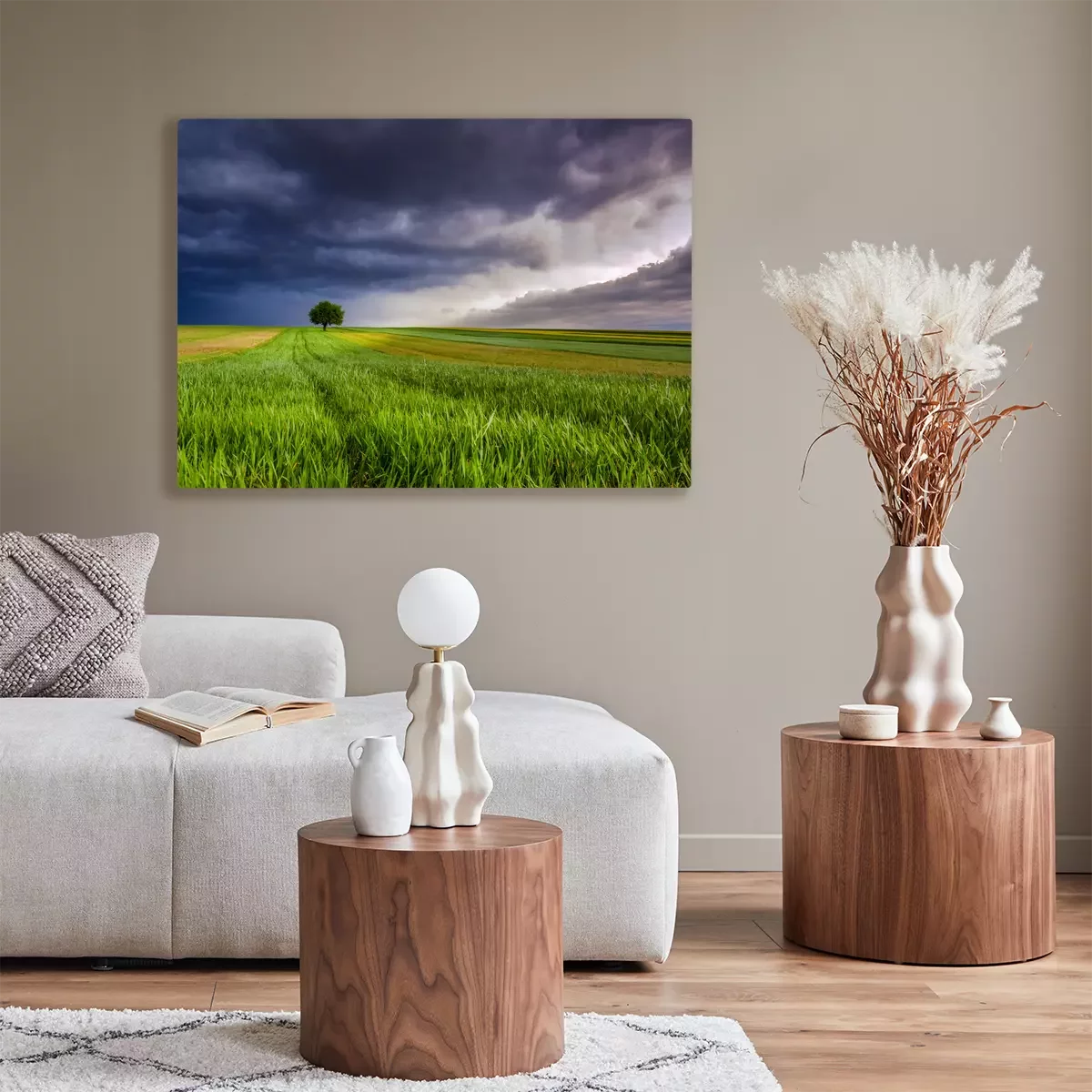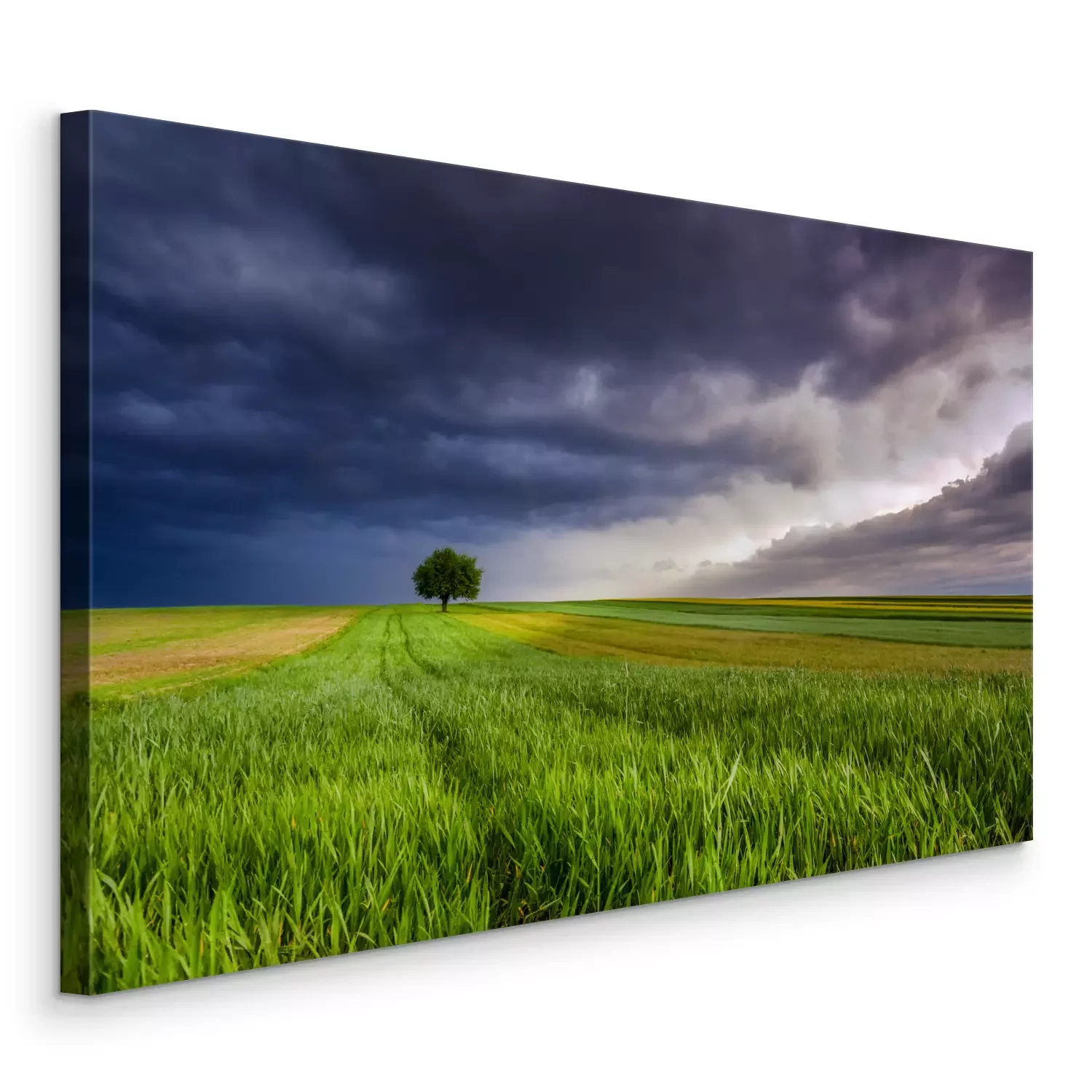 Ein baum auf einem feld unter einem dunklen, stürmischen himmel