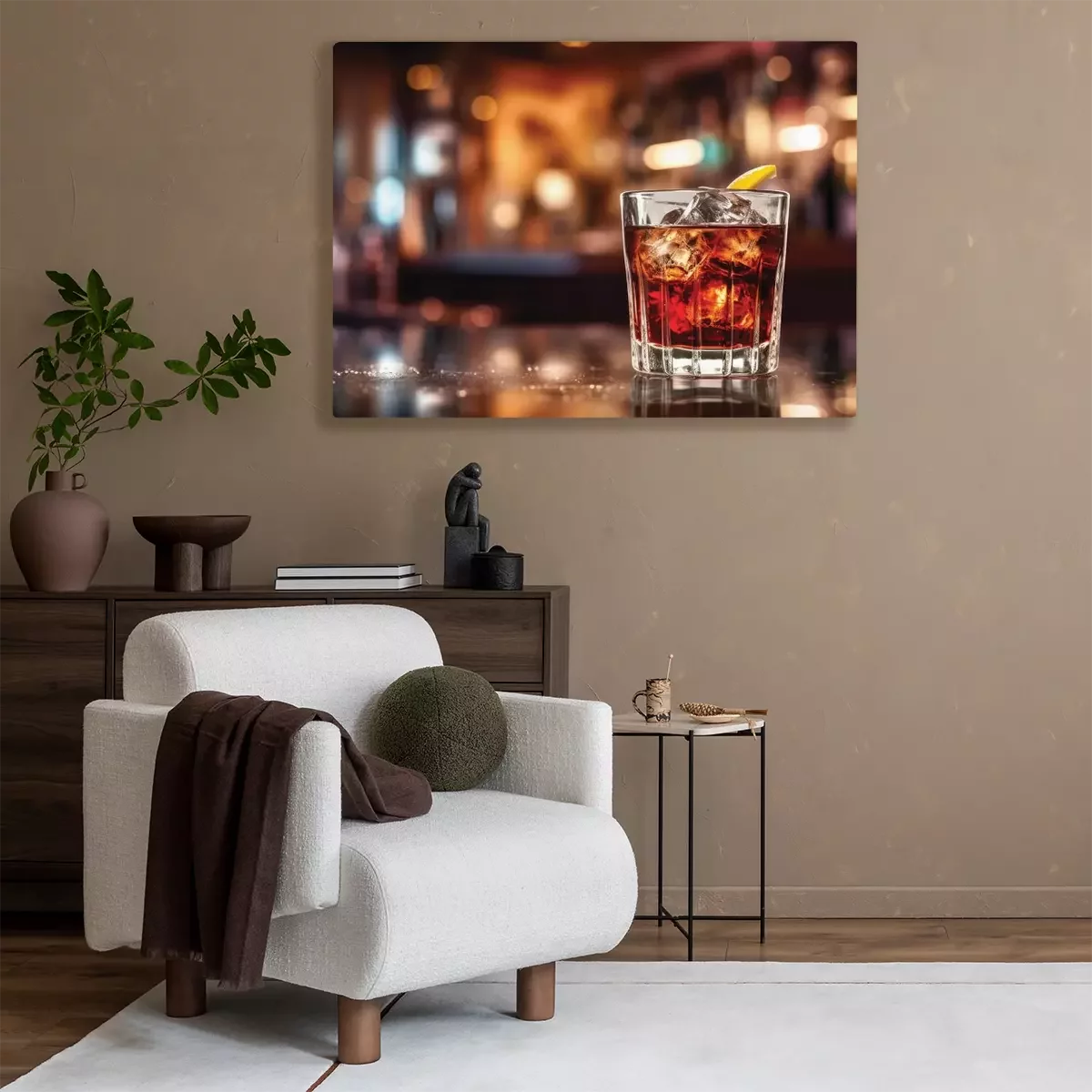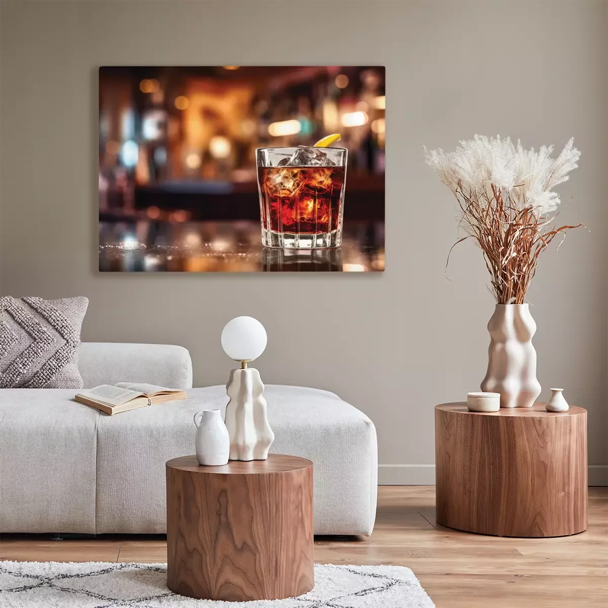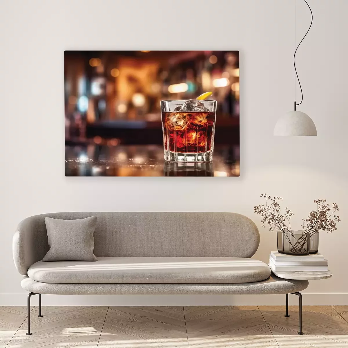 Ein glas whisky mit eiswürfeln vor dem hintergrund einer bar