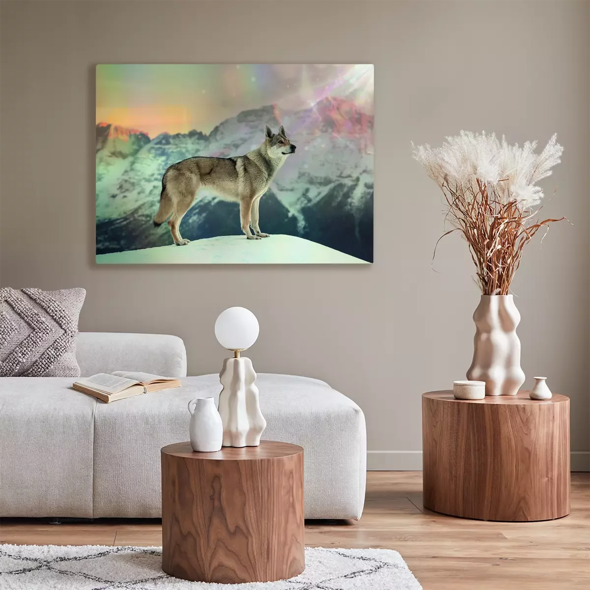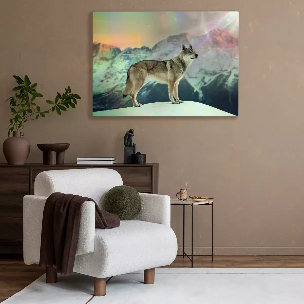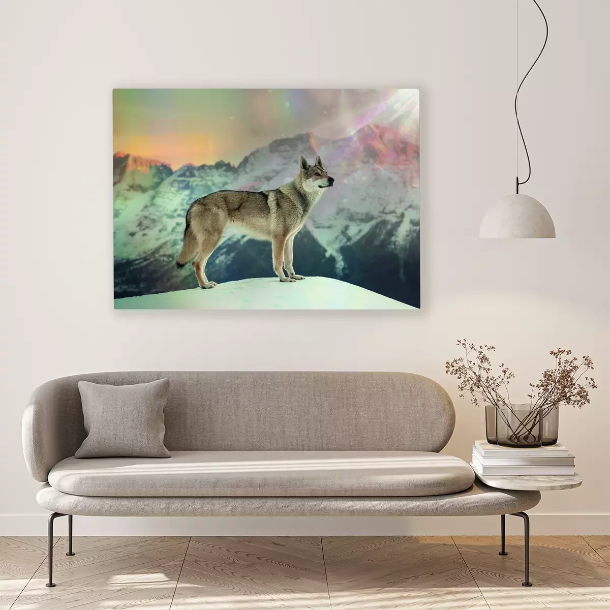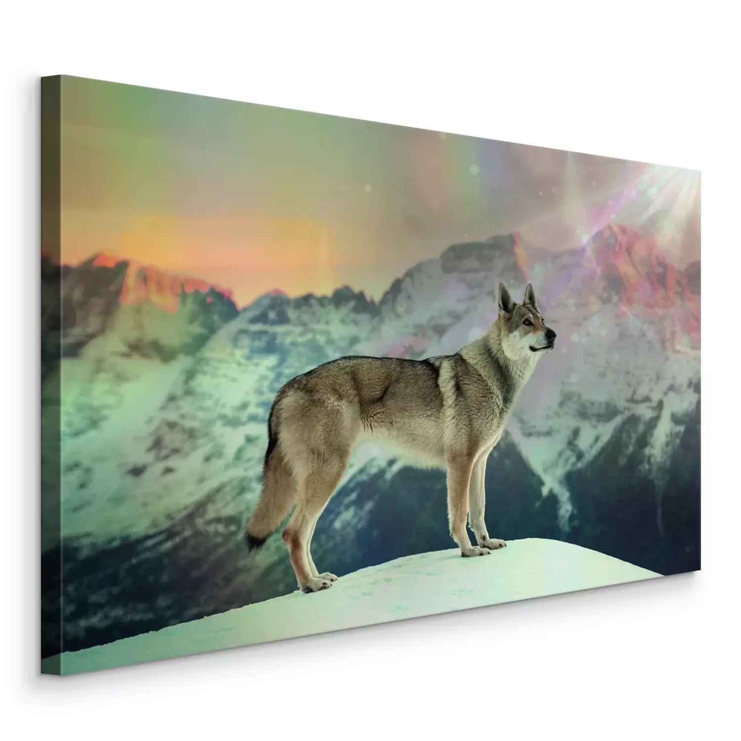 Ein majestätischer wolf vor einem sonnenuntergang in den bergen