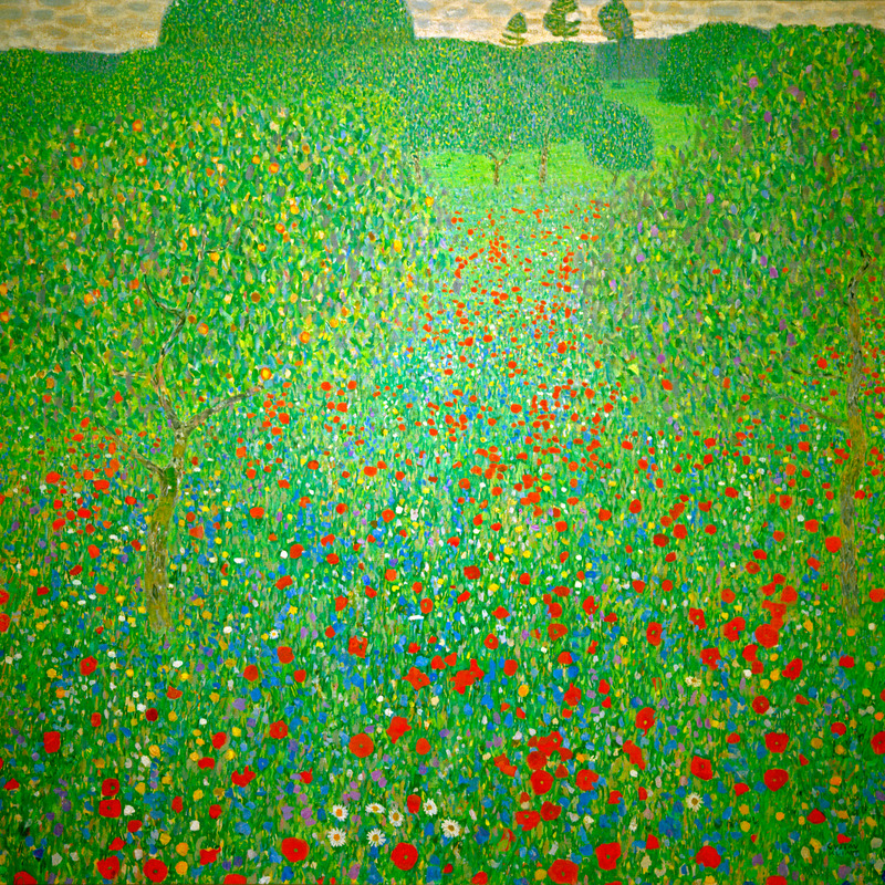 Bild: Ein malerisches Mohnfeld mit Obstbäumen
