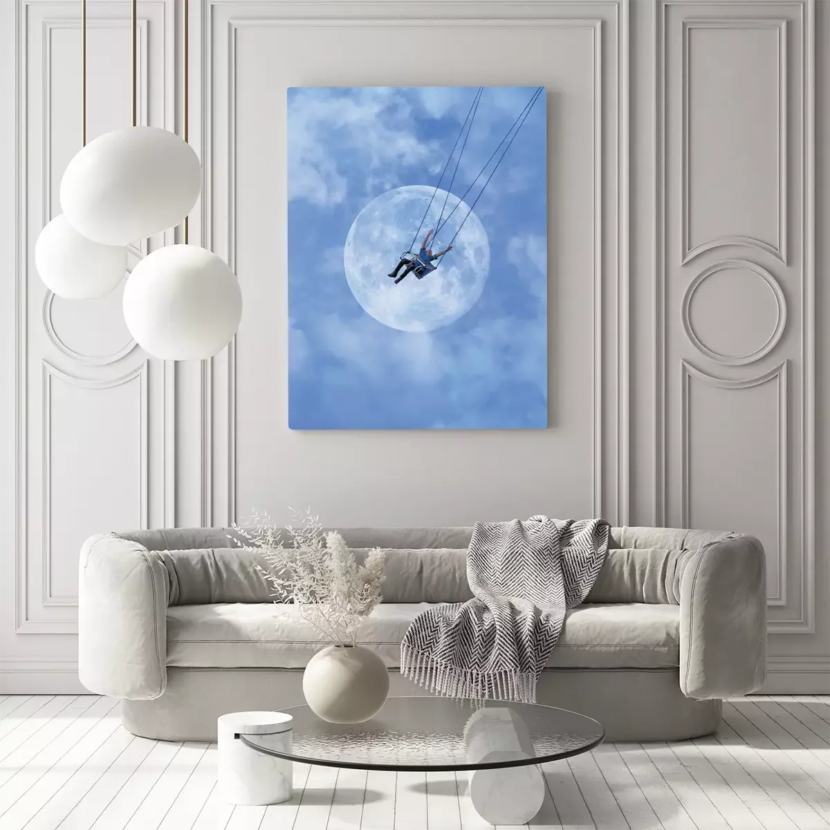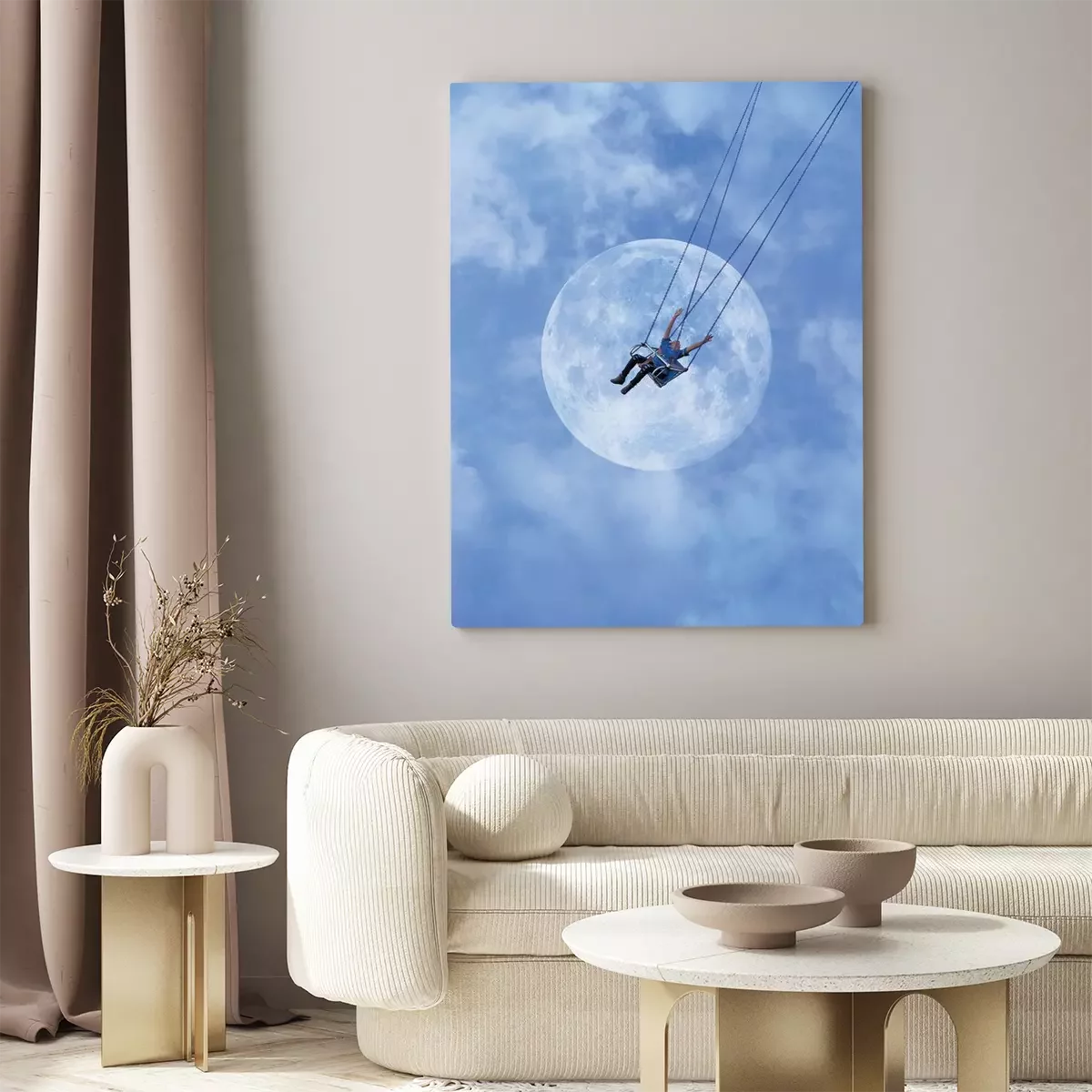 Ein mann auf einer schaukel vor blauem himmel mit mond
