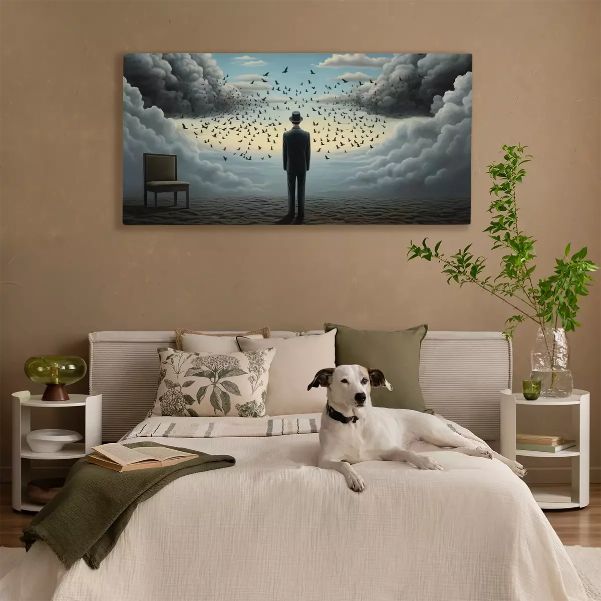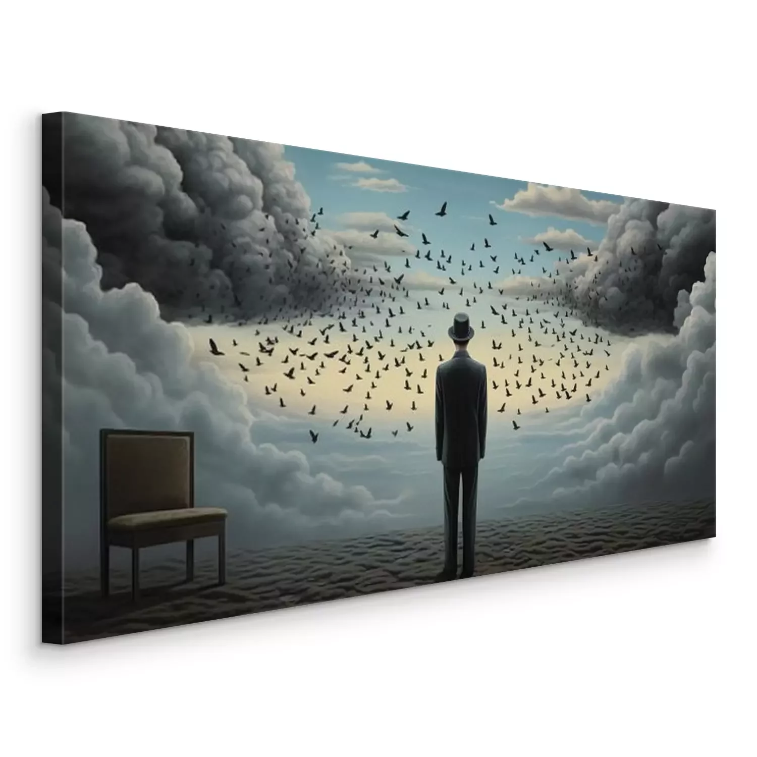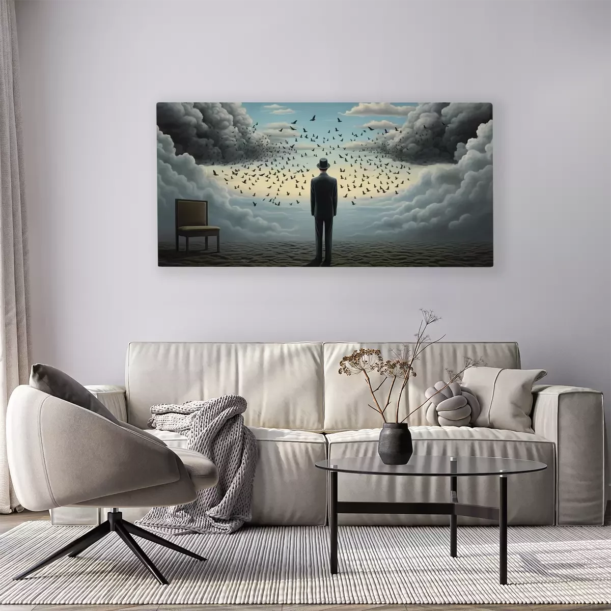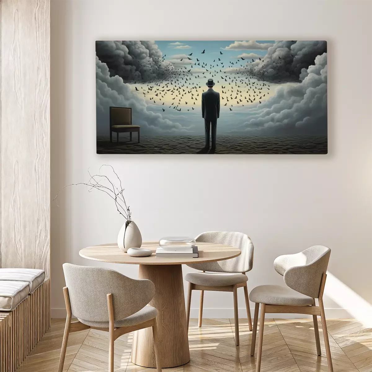 Ein mann mit einem vogelschwarm und einem stuhl im hintergrund