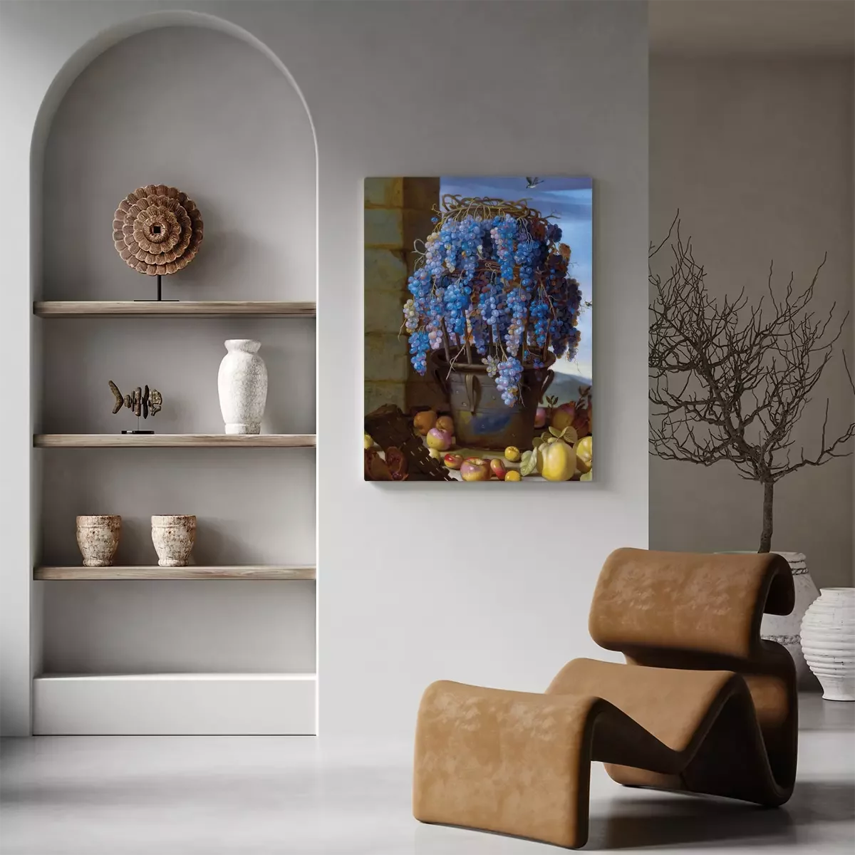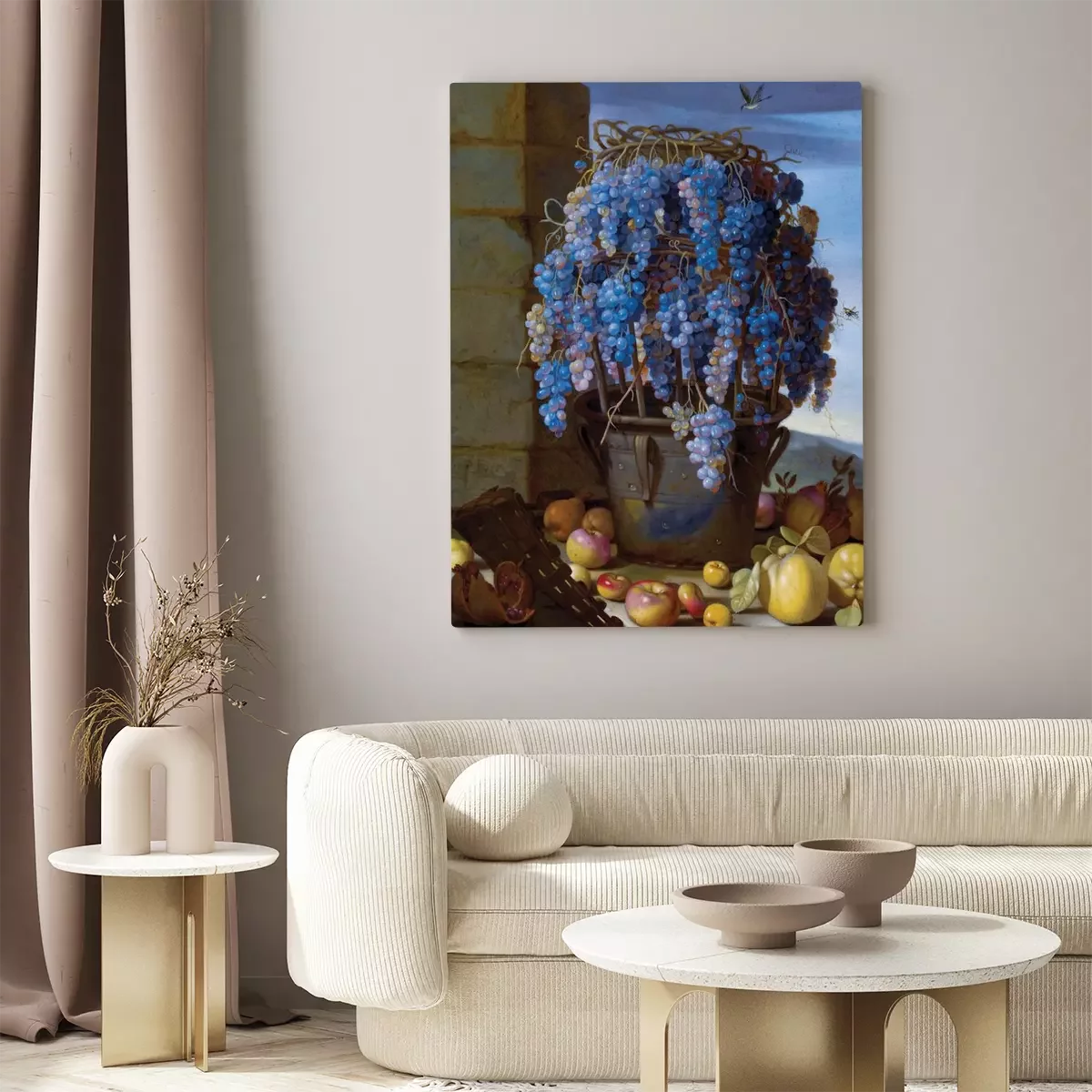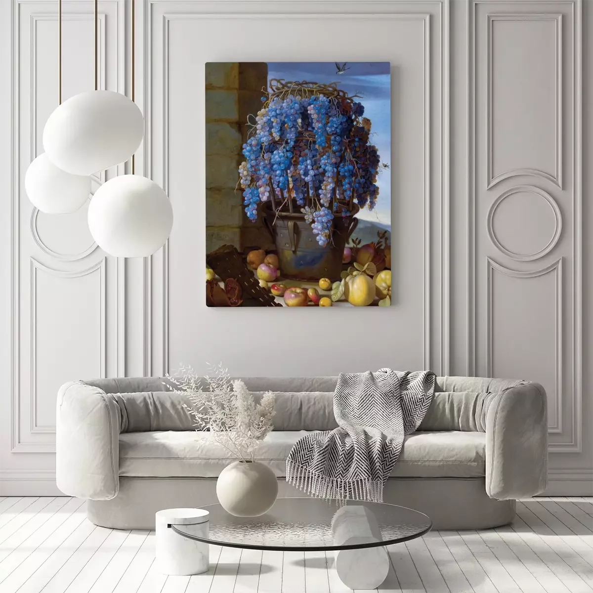 Ein mit weintrauben gefüllter metalleimer, umgeben von äpfeln.