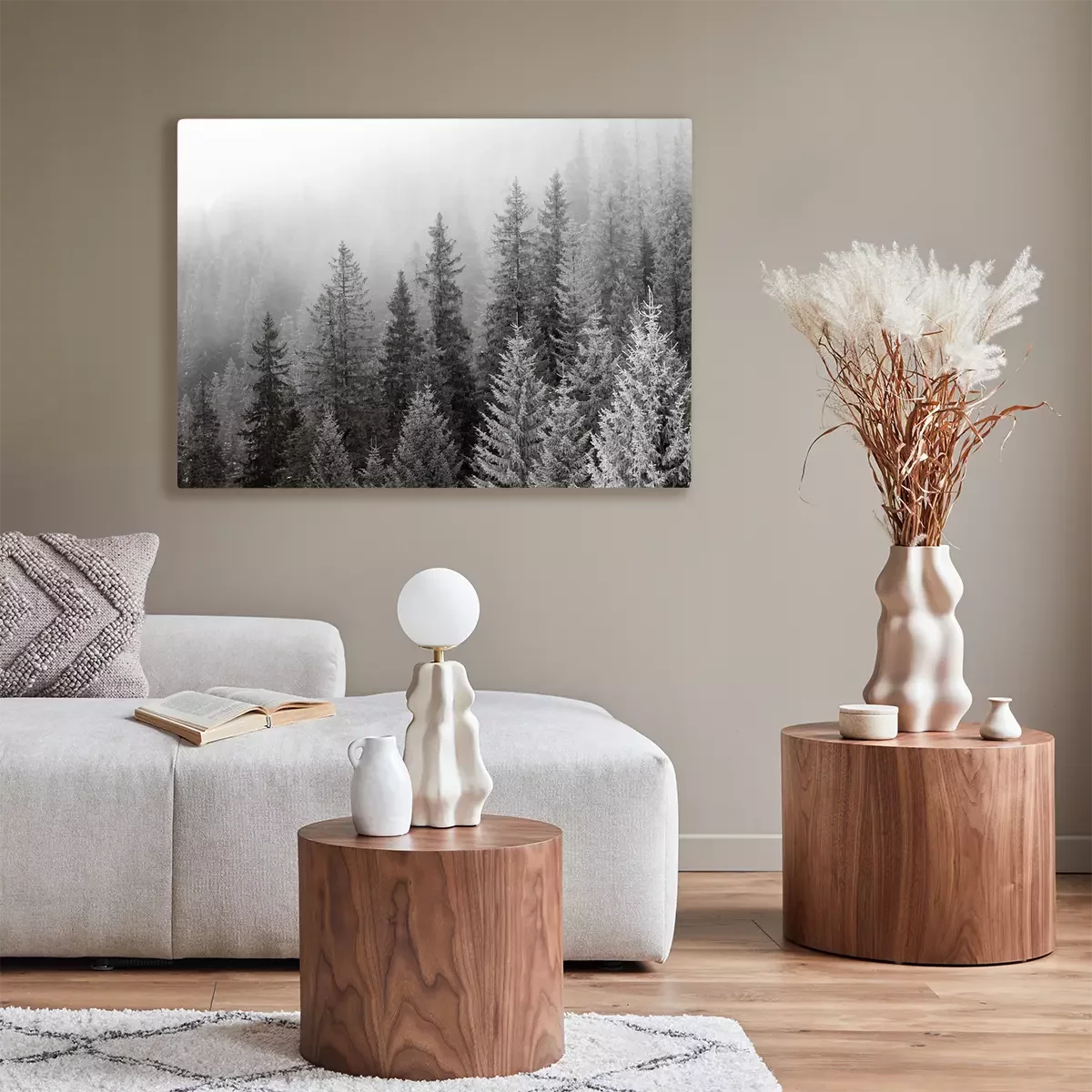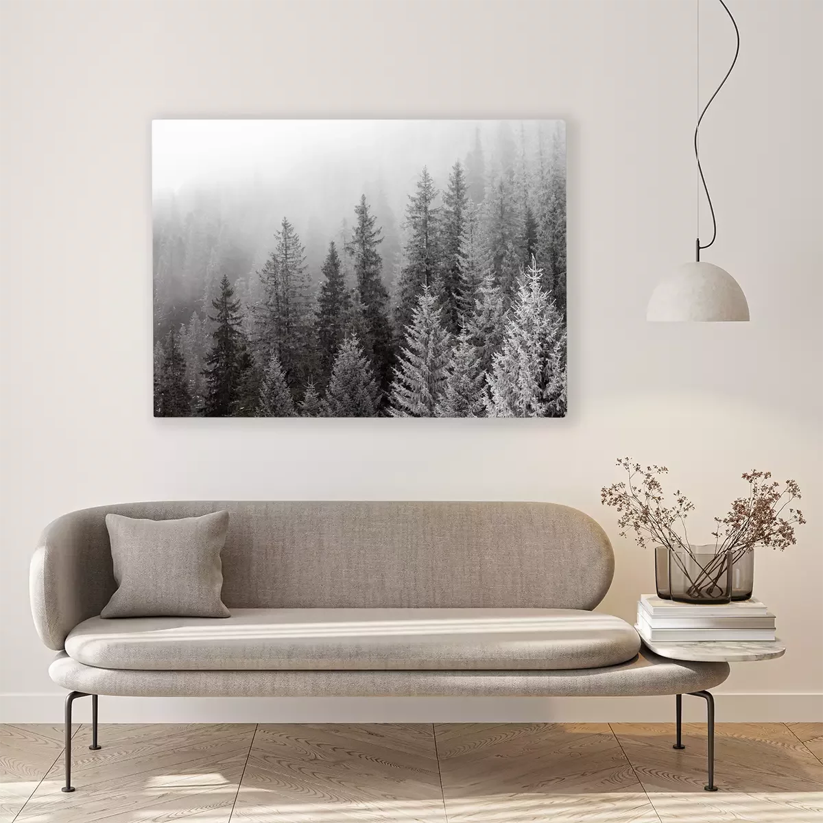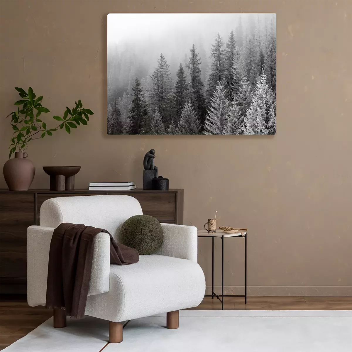 Bild Ein nebliger Winterwald mit schneebedeckten Fichten