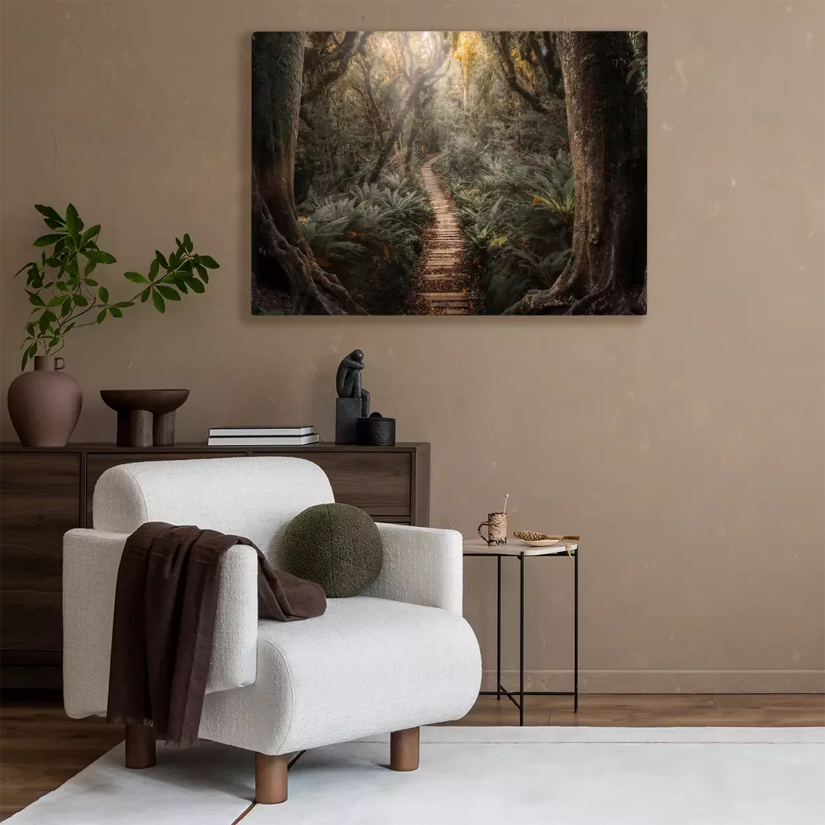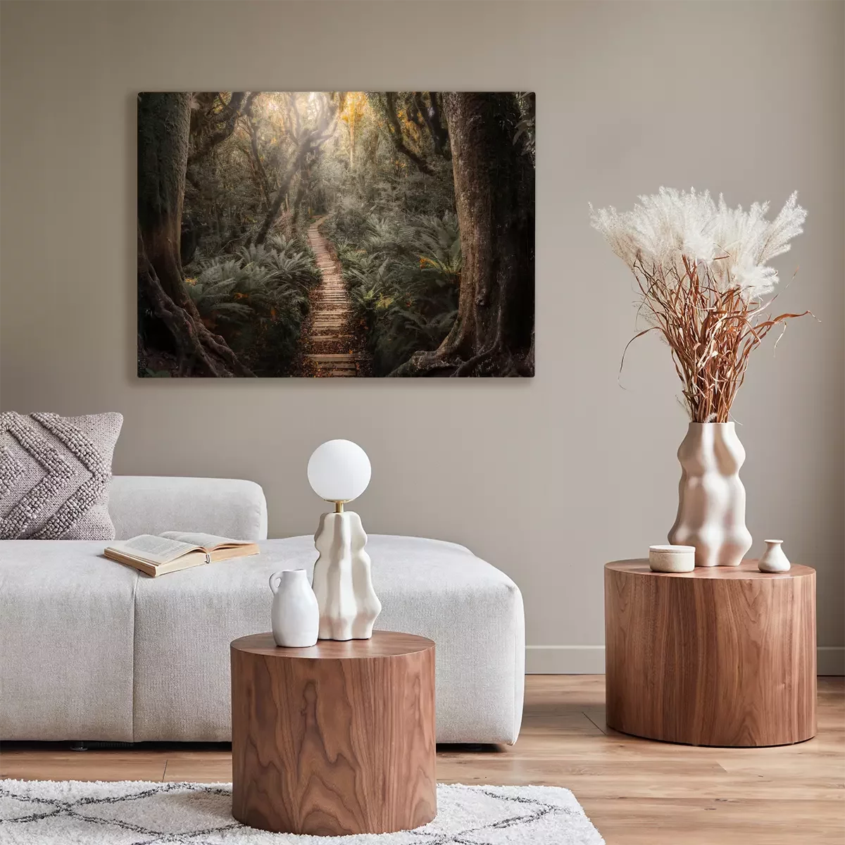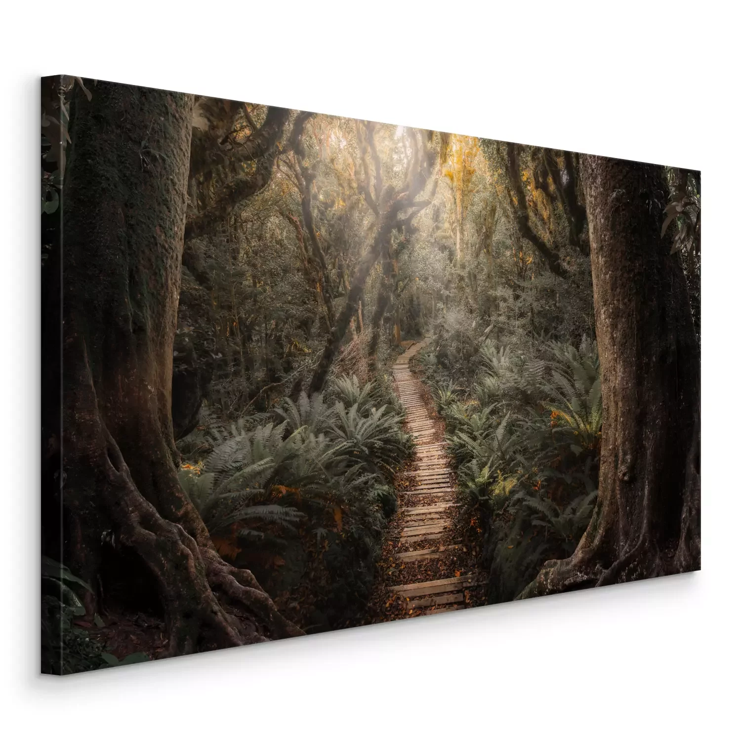 Ein pfad aus holzplanken in einem dichten wald