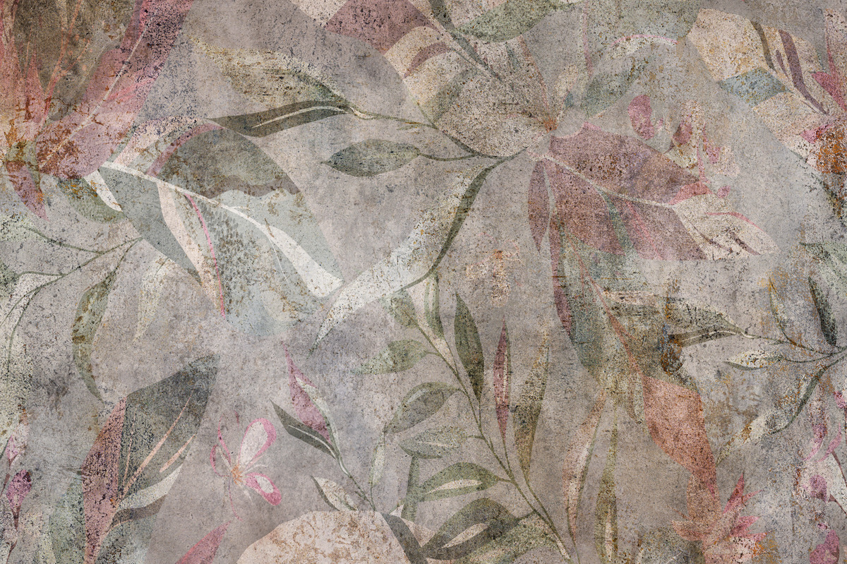 Bild: Ein Pflanzenmuster auf einem Hintergrund, der Beton imitiert.