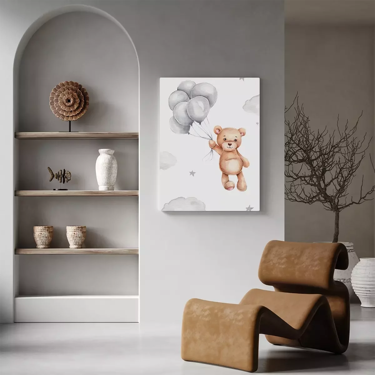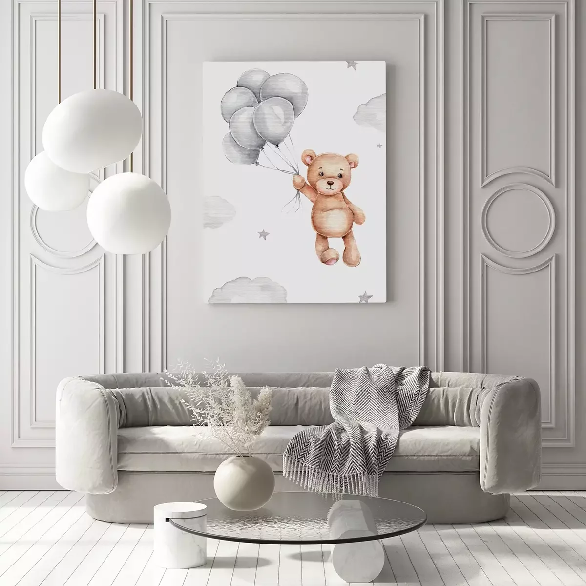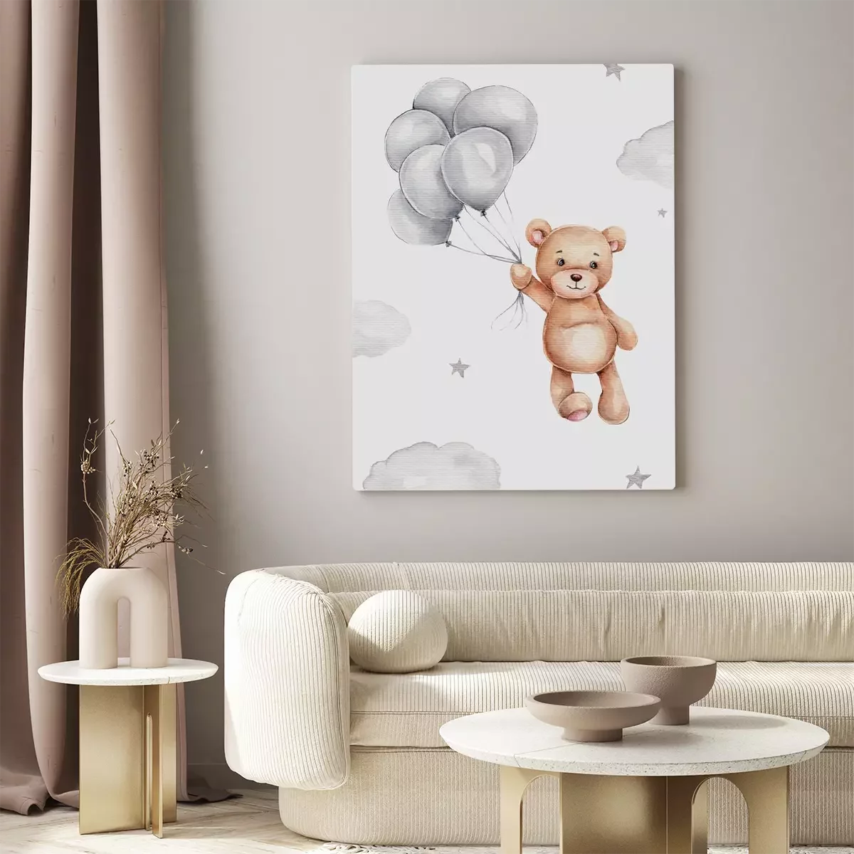 Ein teddybär, der mit luftballons in der hand zwischen den wolken schwebt