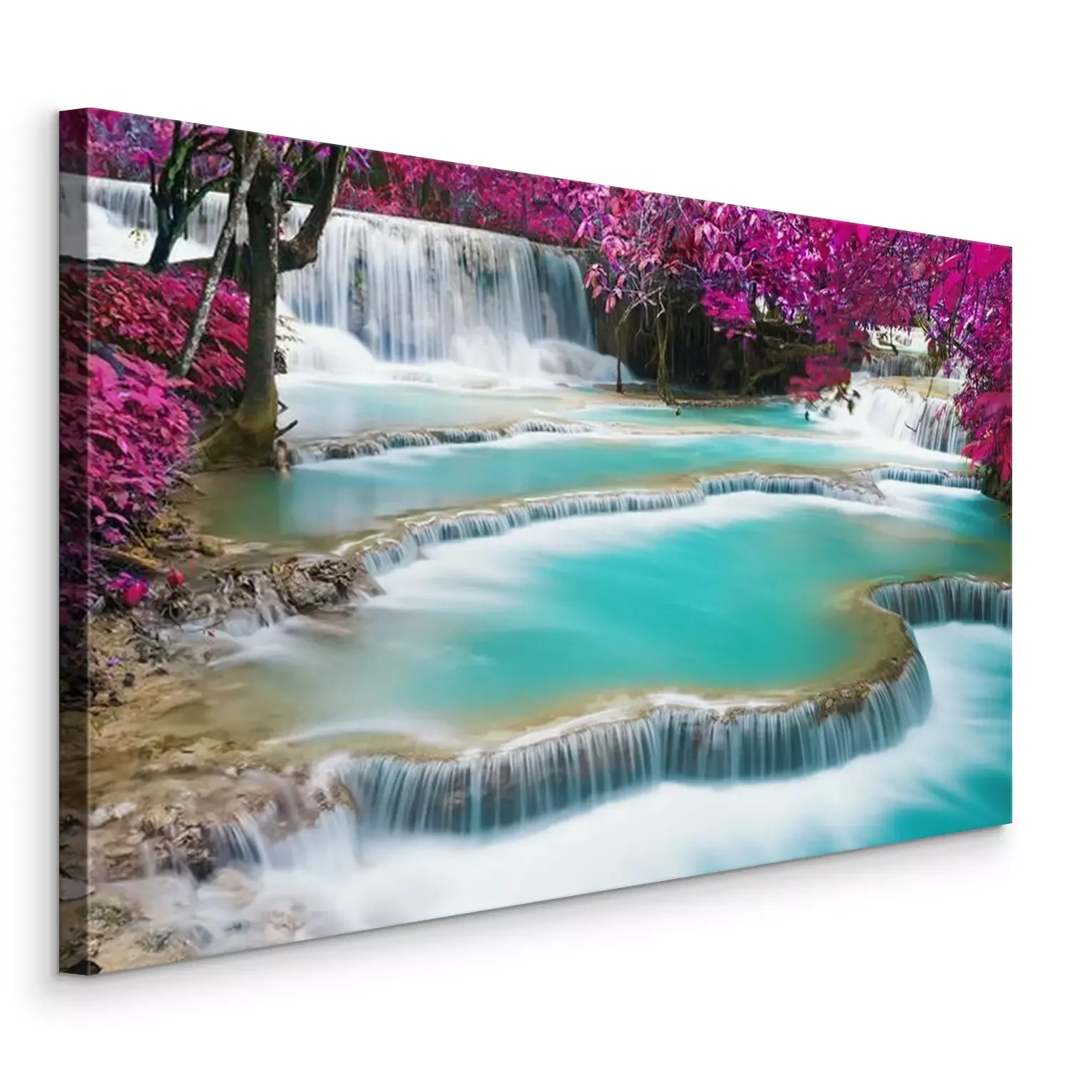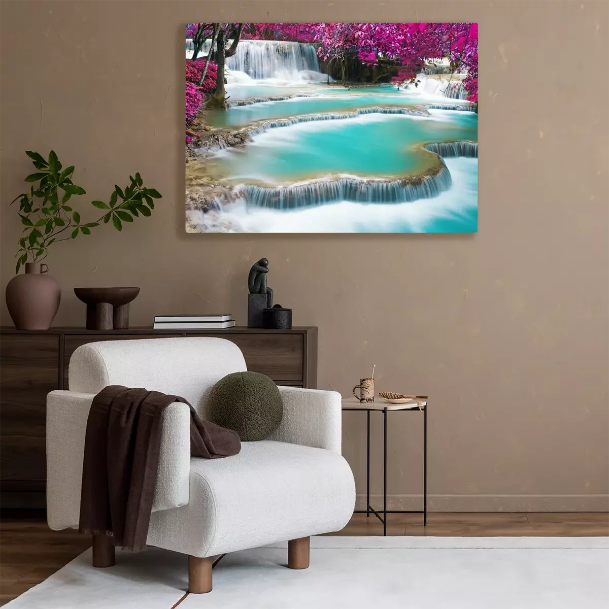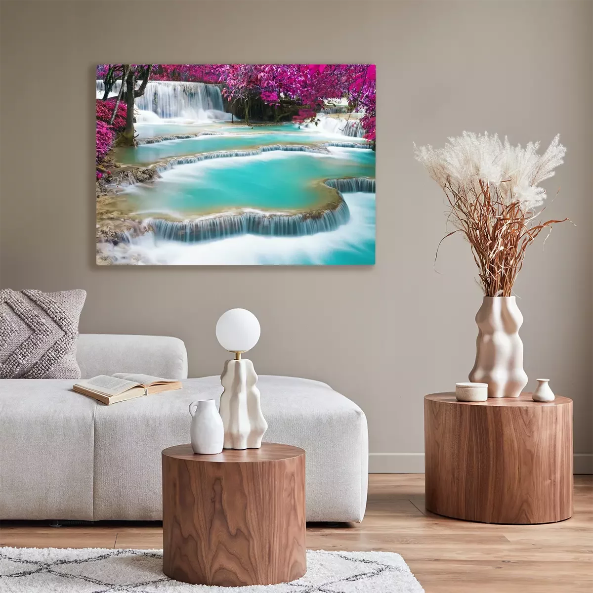 Bild Ein türkisfarbener Wasserfall und rosa Bäume
