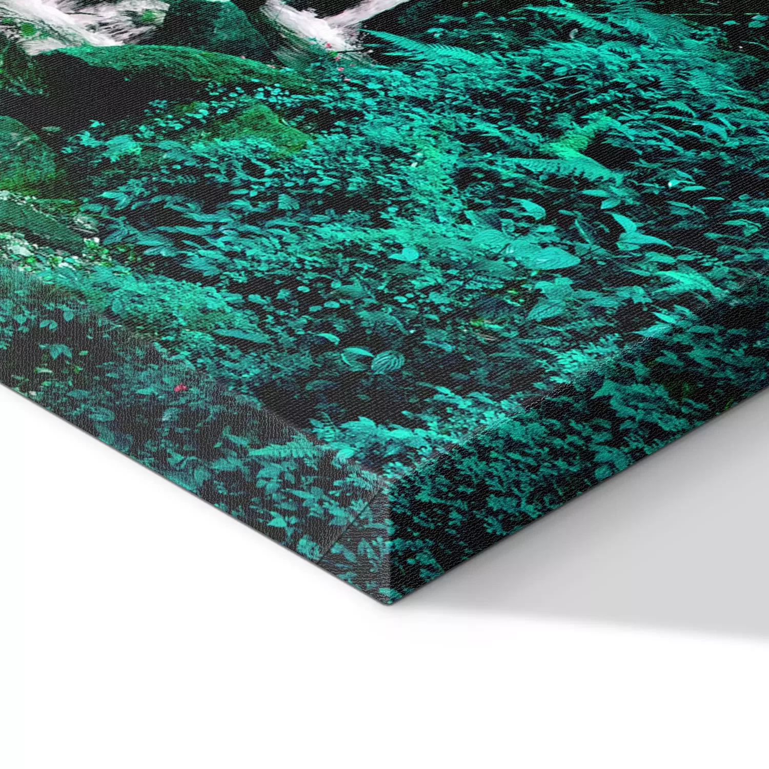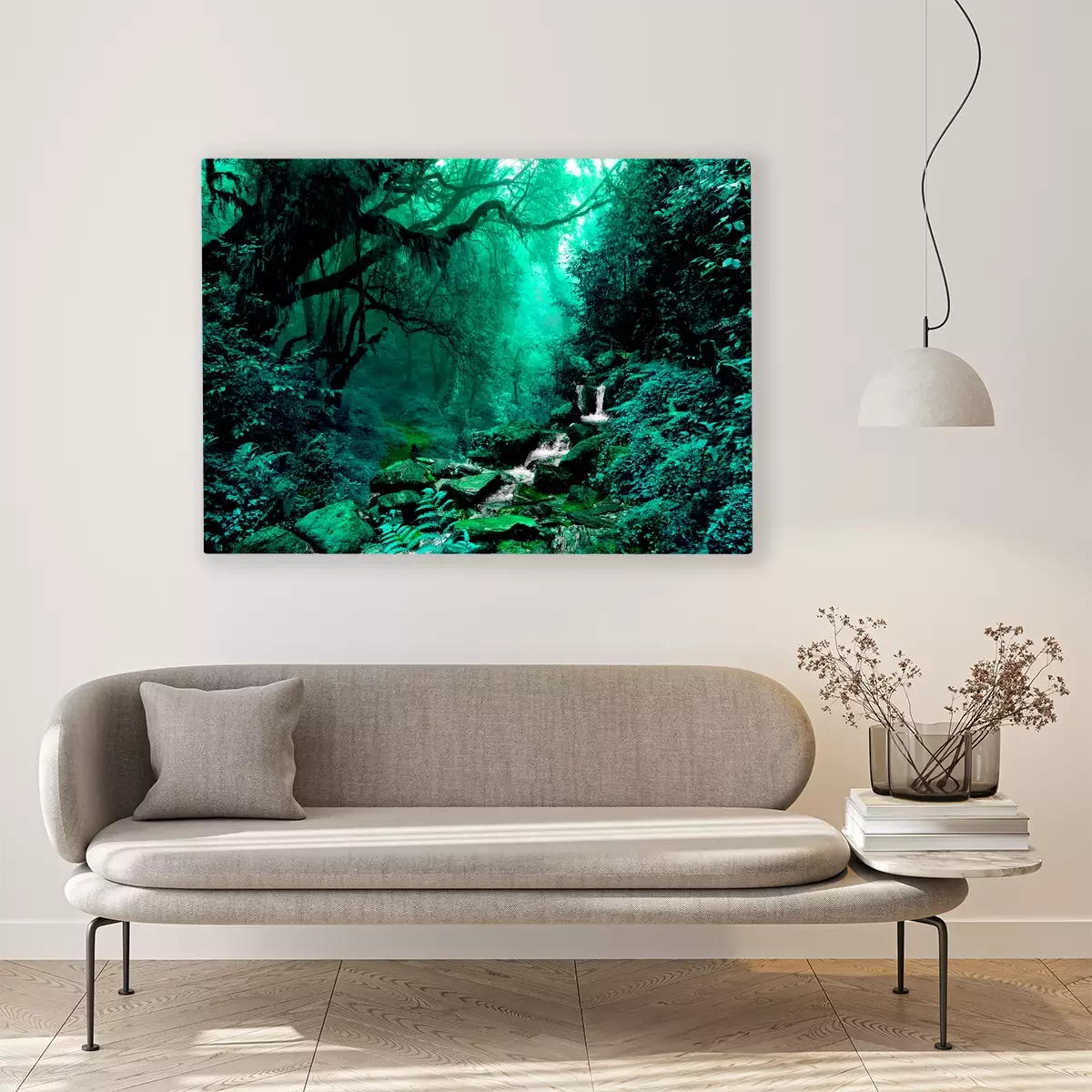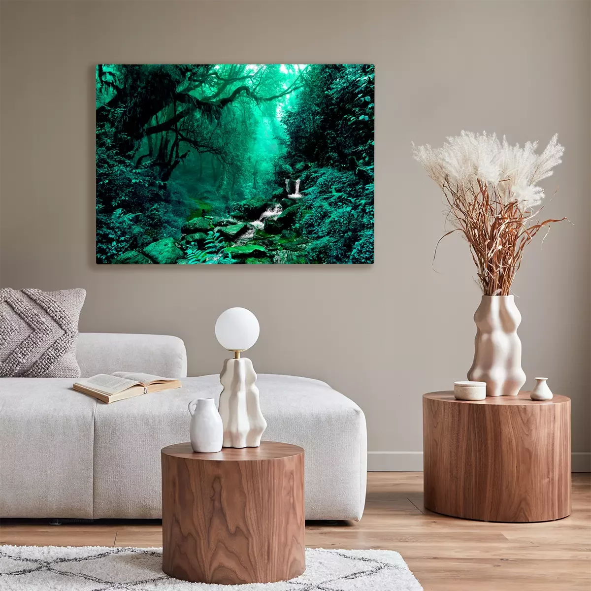 Ein wasserfall, der durch einen türkisfarbenen wald fließt