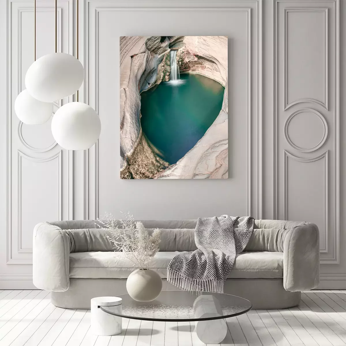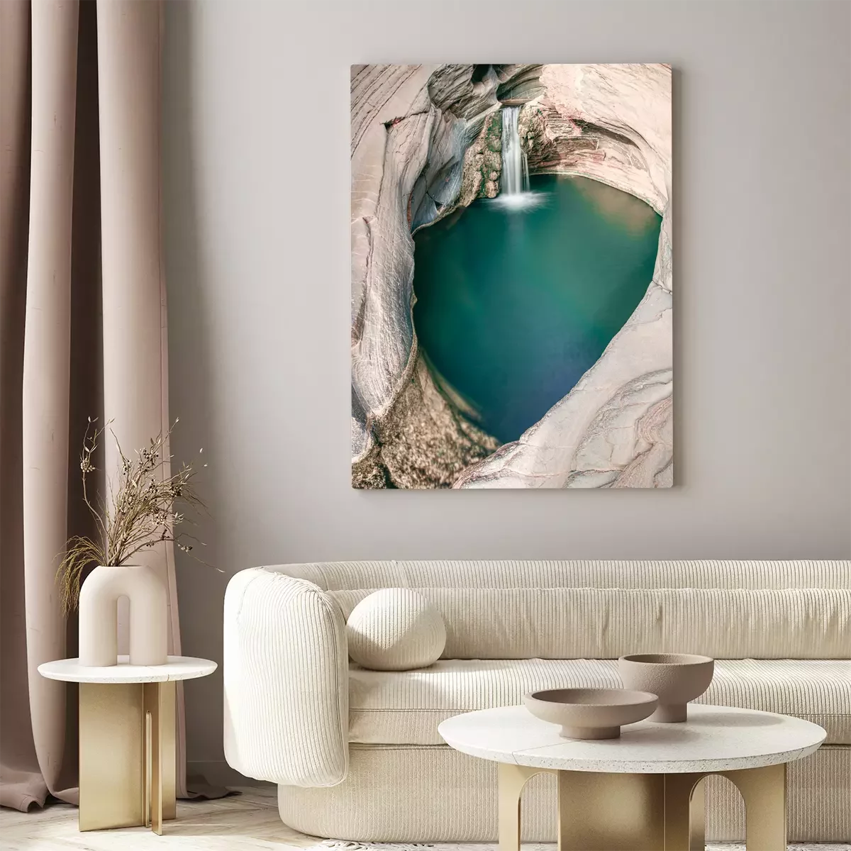 Ein wasserfall, der in ein türkisfarbenes becken zwischen den felsen stürzt.