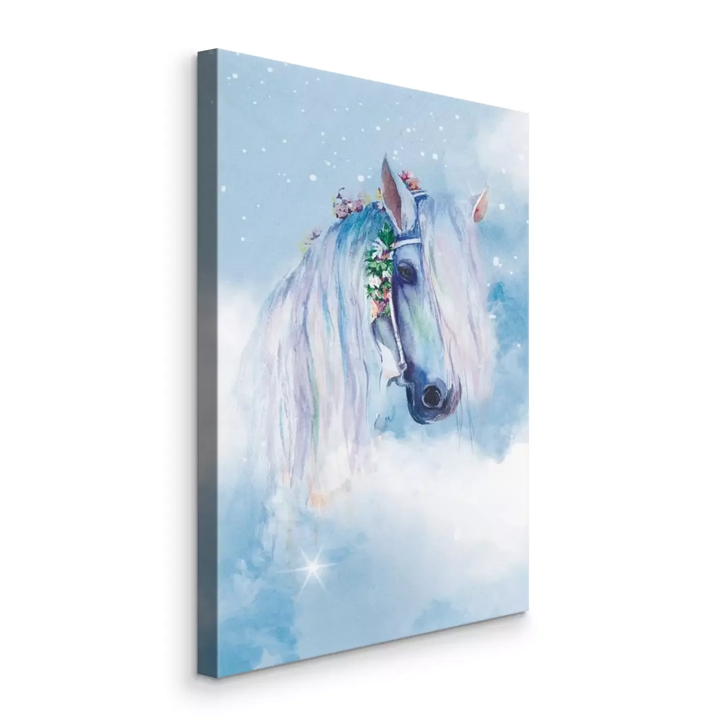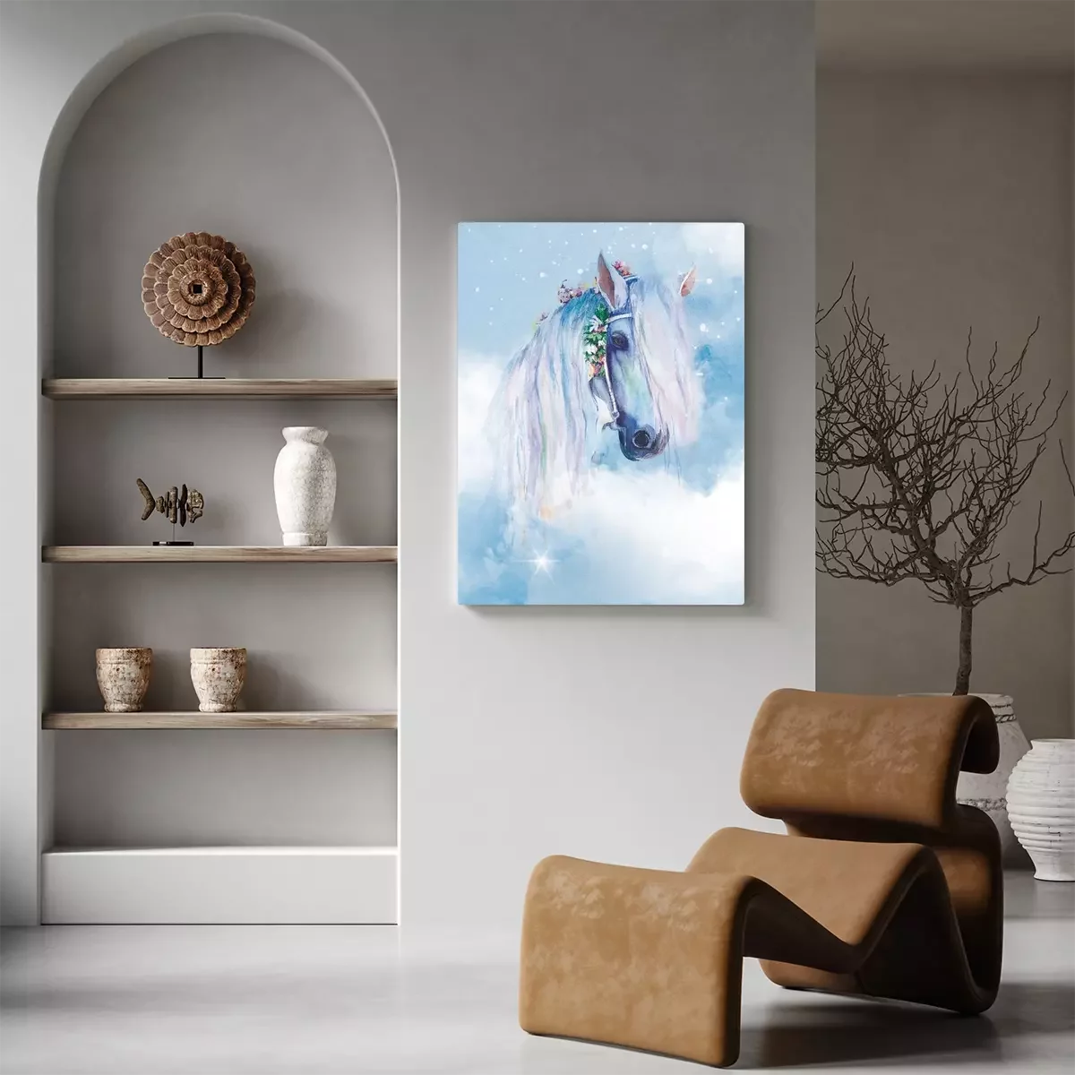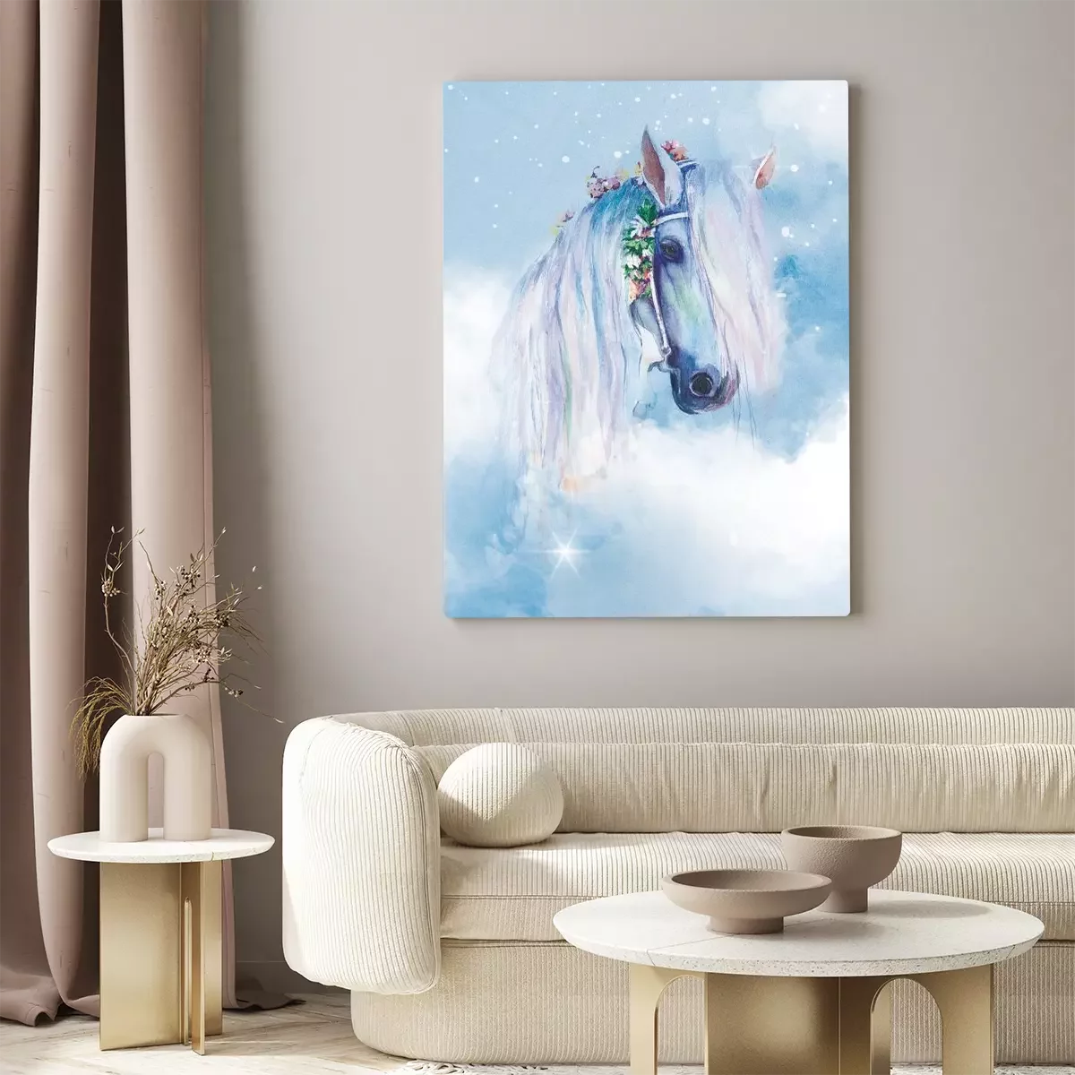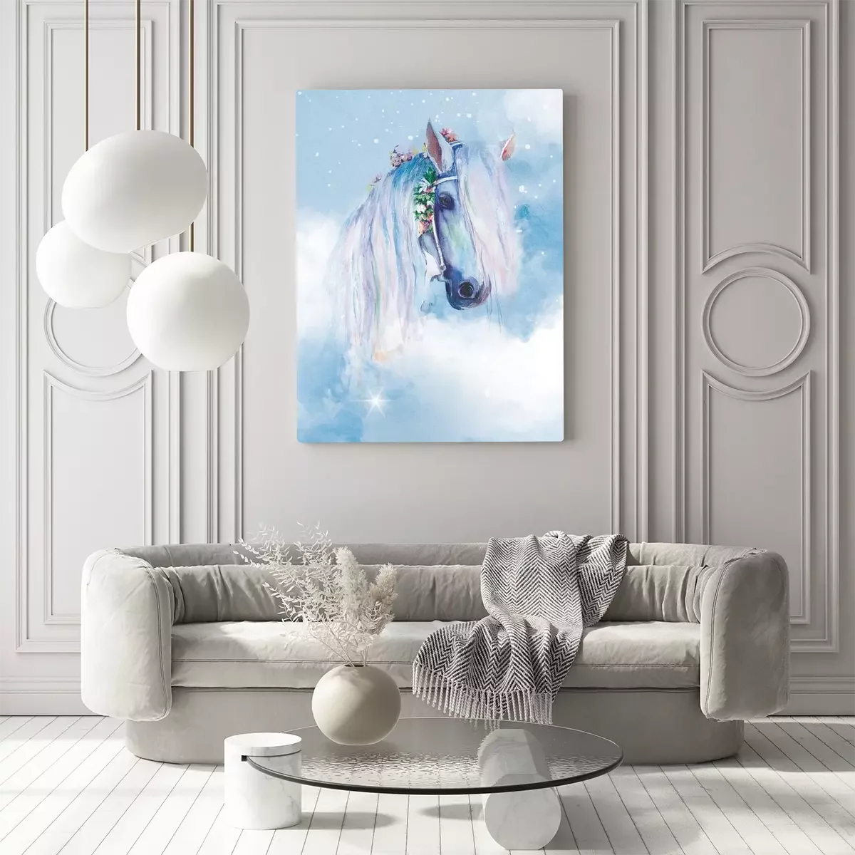 Ein weißes pferd mit einem blumenkranz vor einem hintergrund aus sanften wolken.