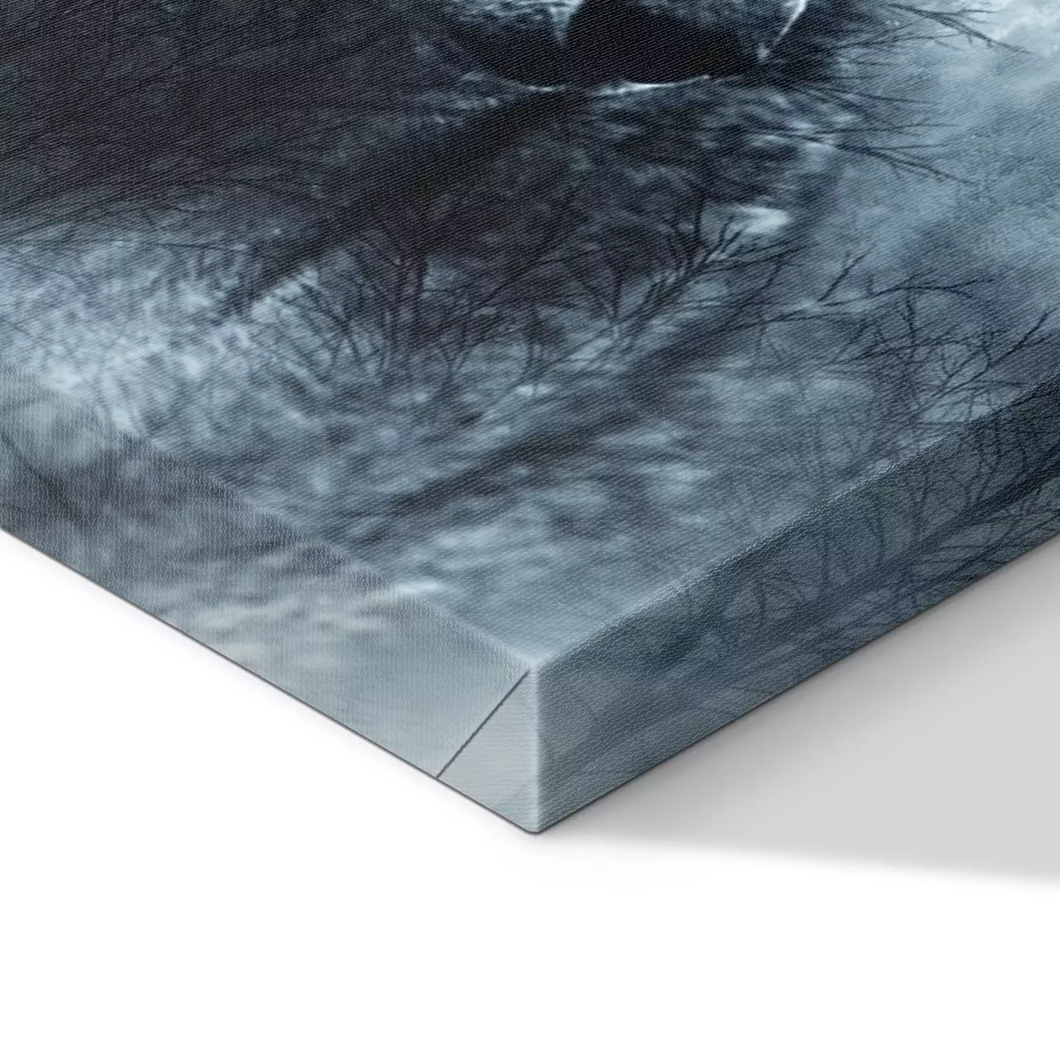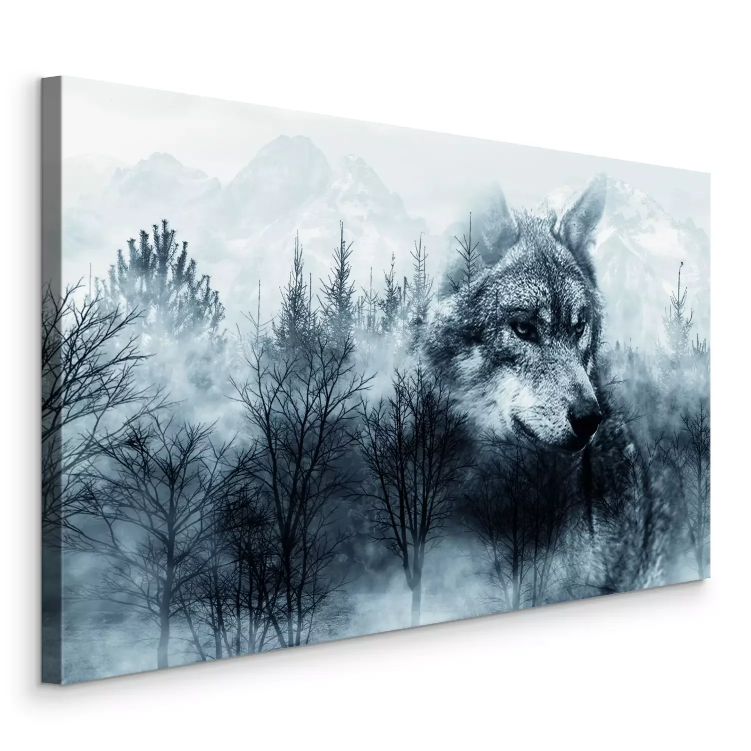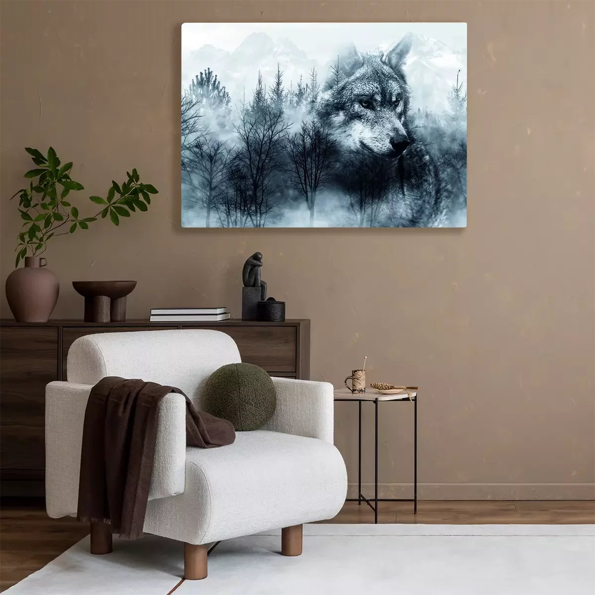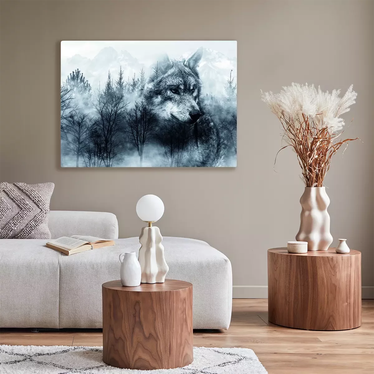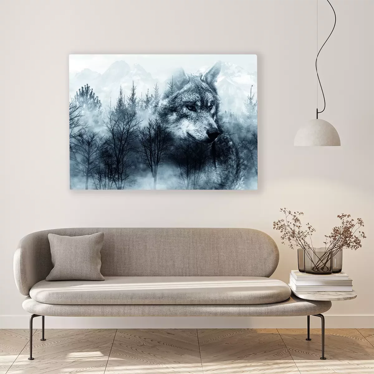 Ein wolf in einem nebligen, schwarz-weißen nadelwald
