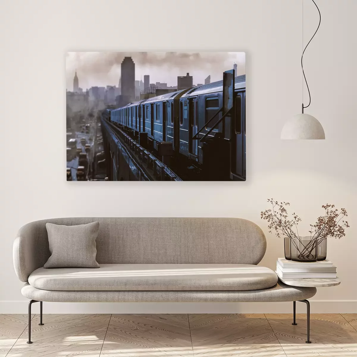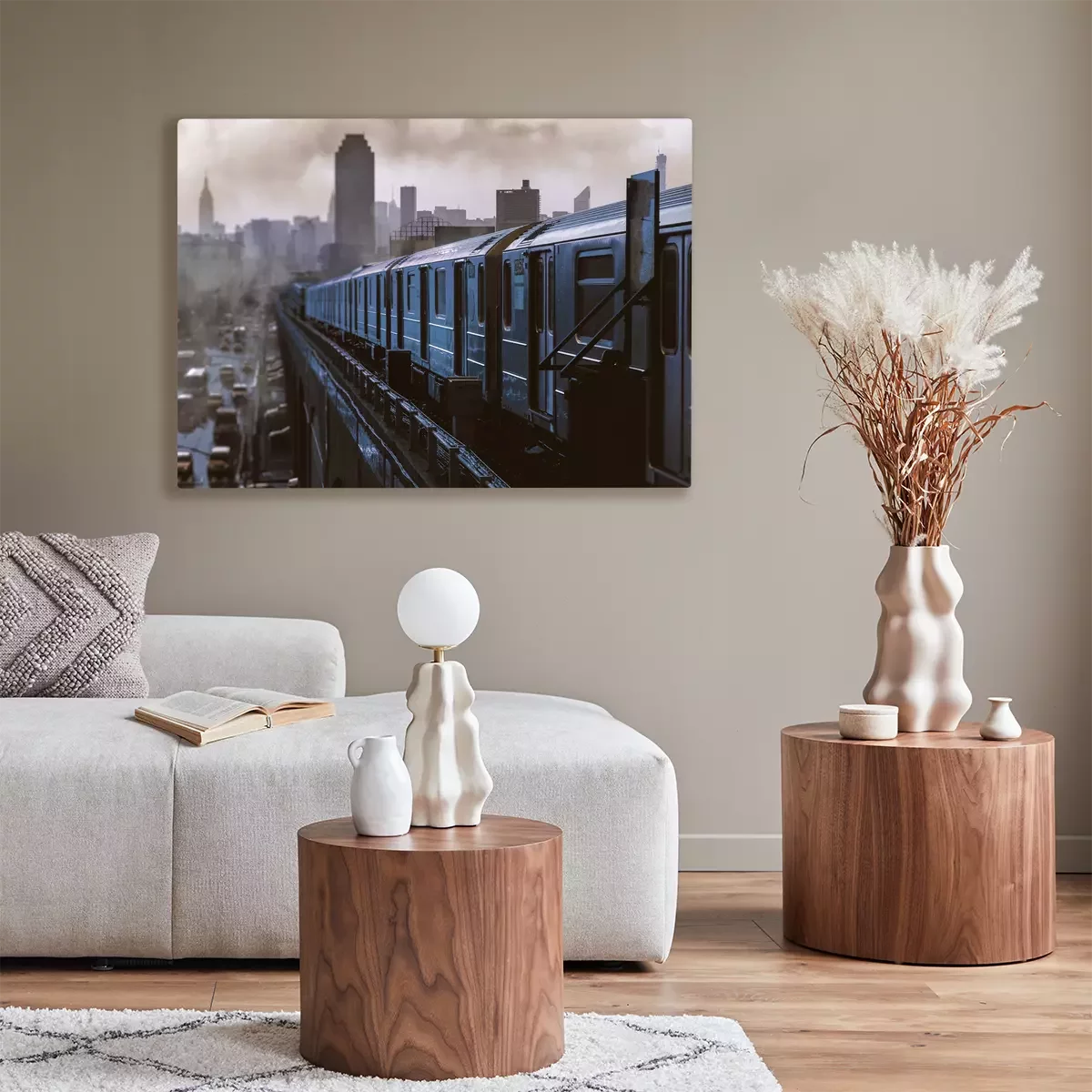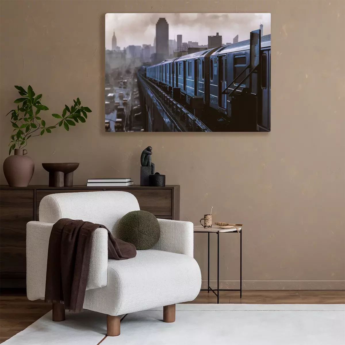 Ein zug mit einem panorama von wolkenkratzern im hintergrund