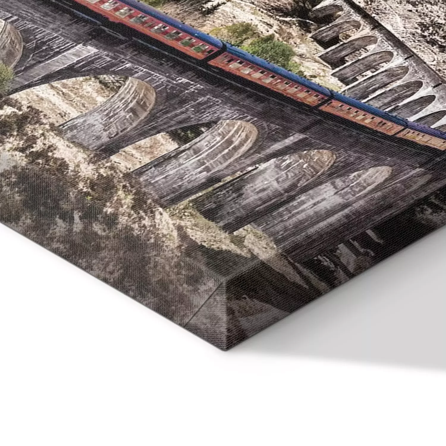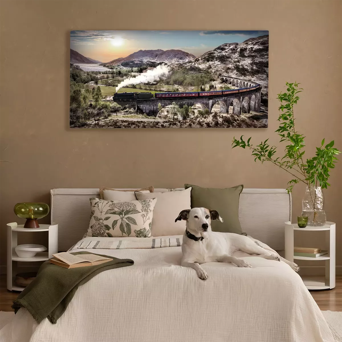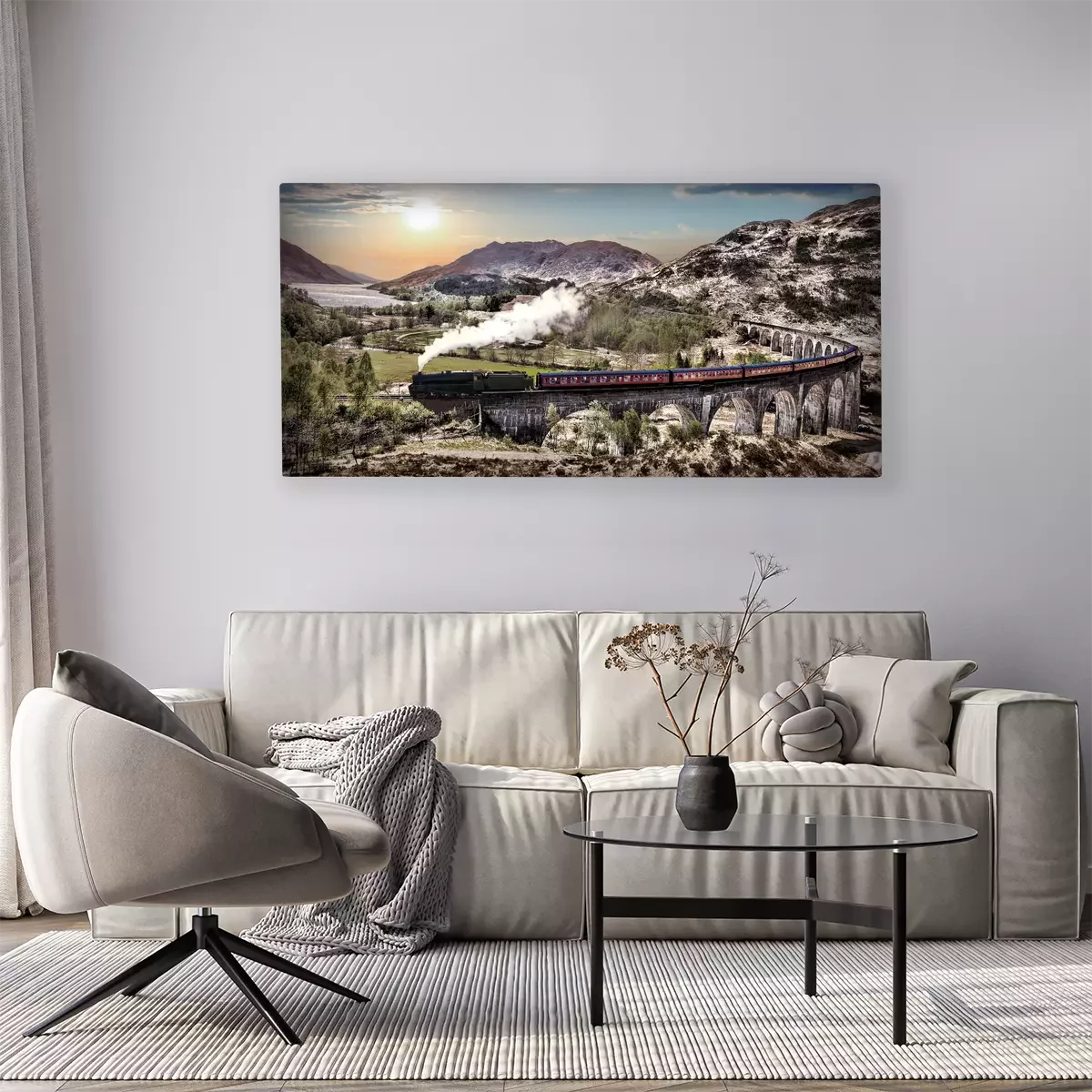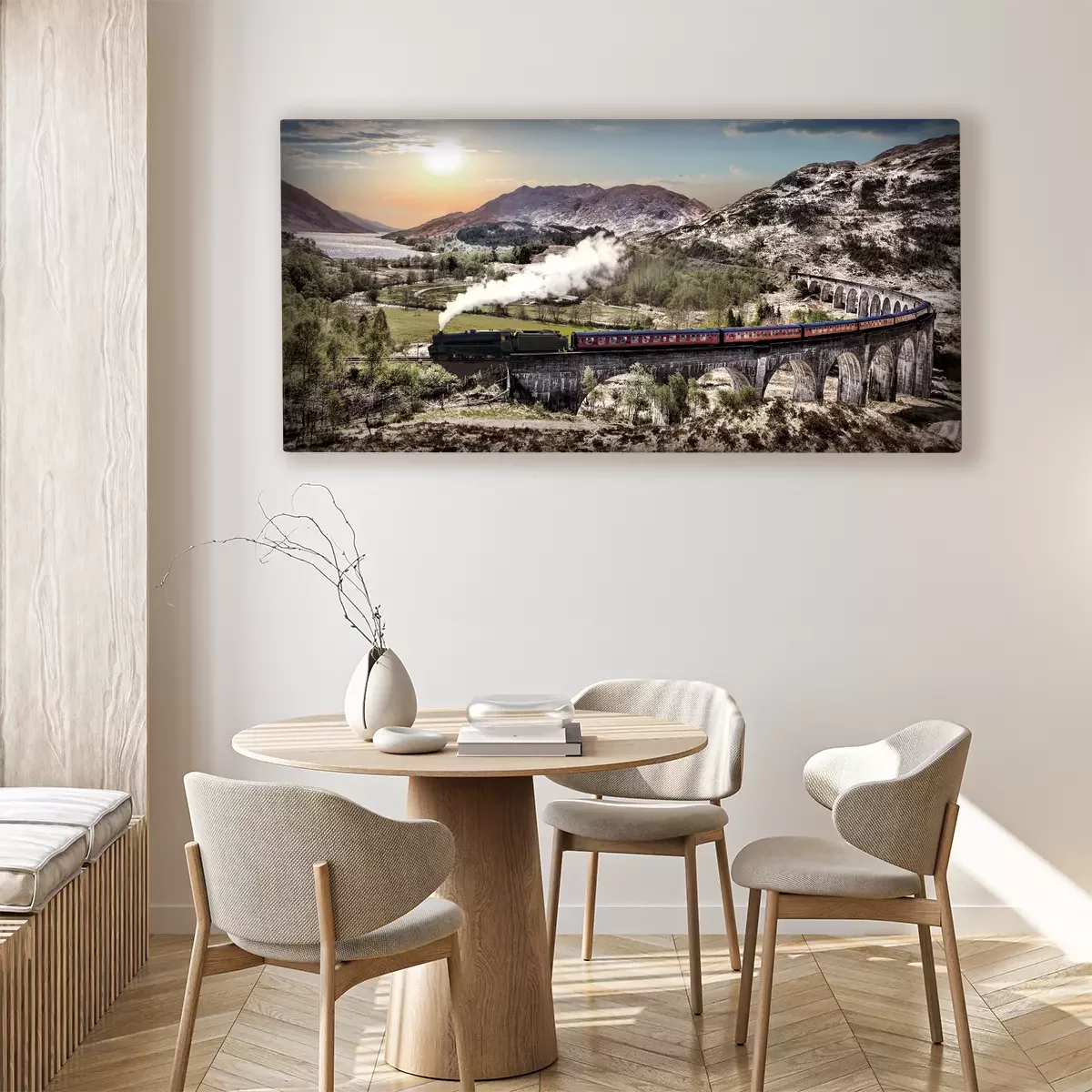 Ein zug zwischen bergen und seen bei sonnenuntergang