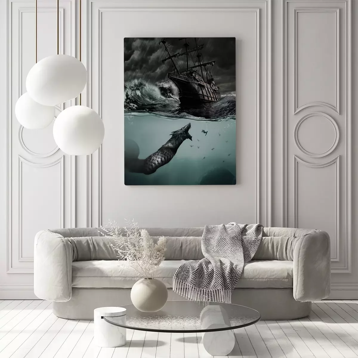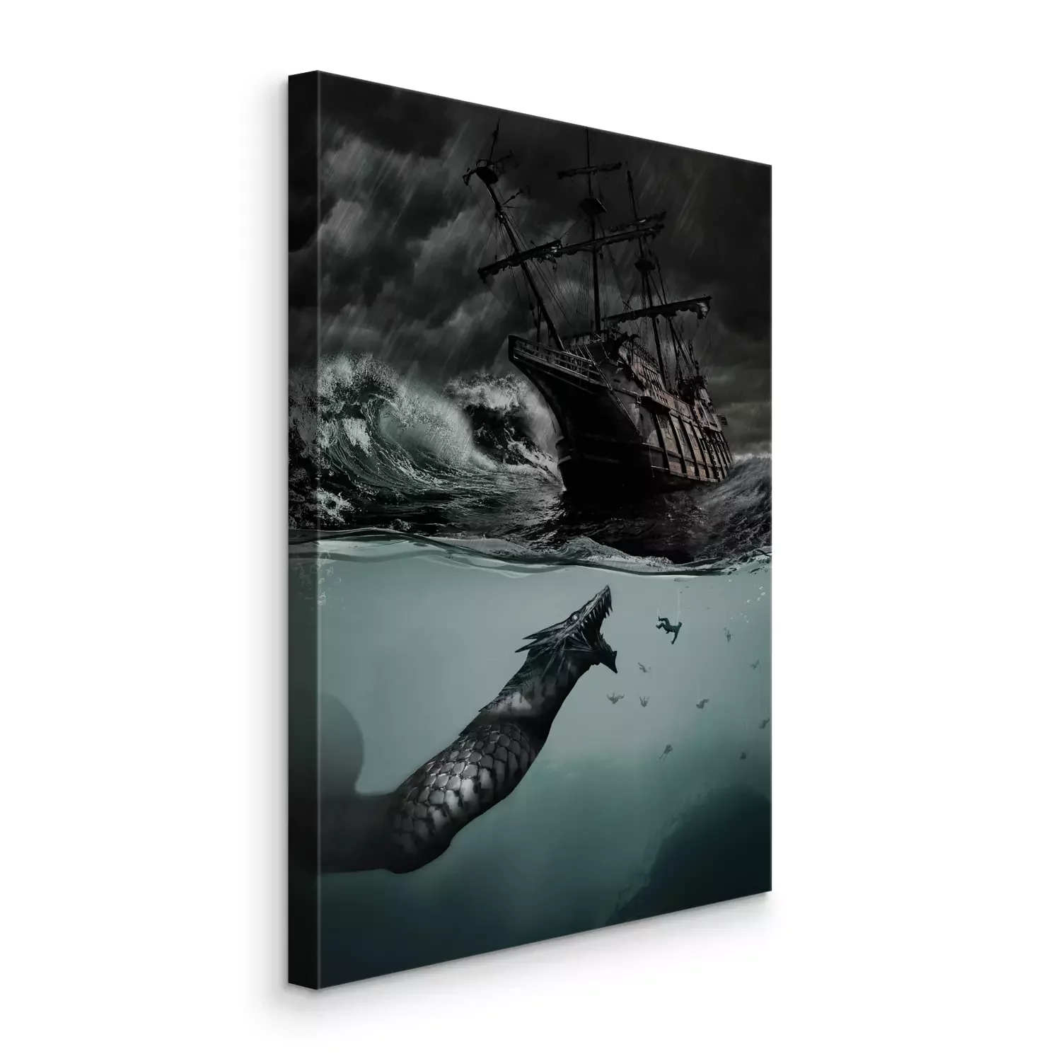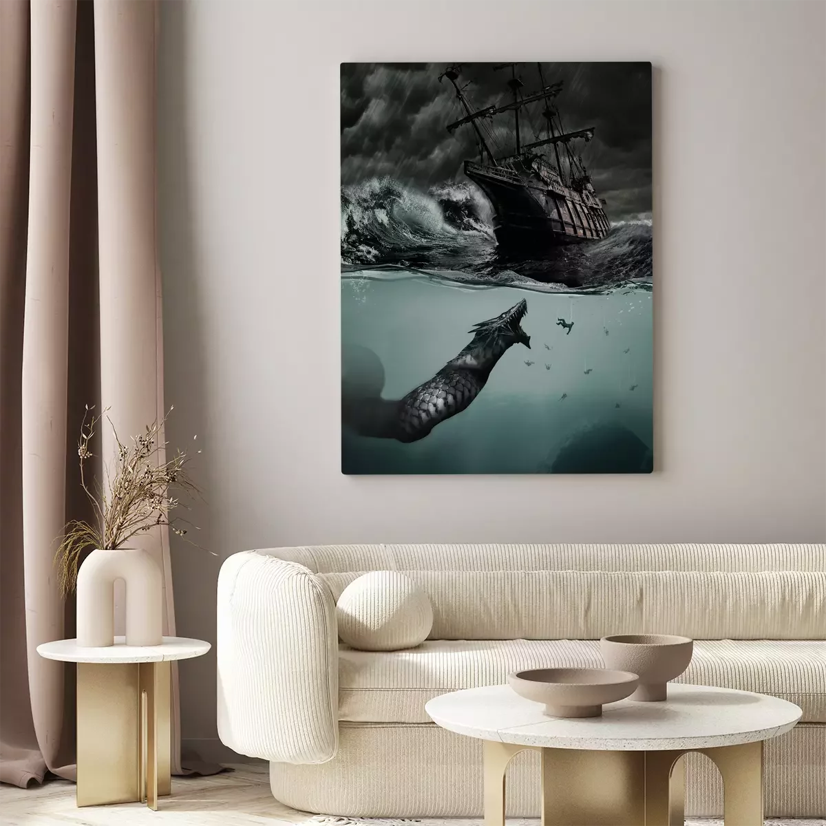 Eine dramatische szene mit einem segelschiff und einem seeungeheuer