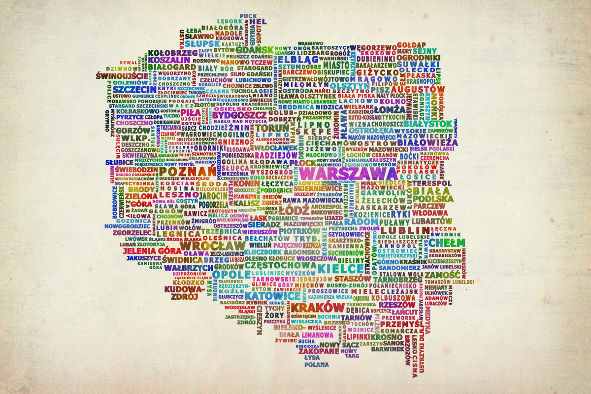 Bild: Eine farbenfrohe Karte von Polen, bestehend aus Ortsnamen.