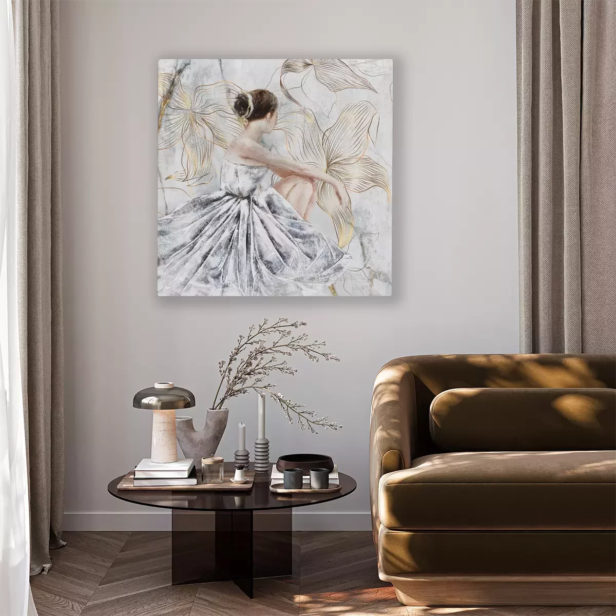 Eine frau in einem ballettkleid vor einem hintergrund goldener blüten