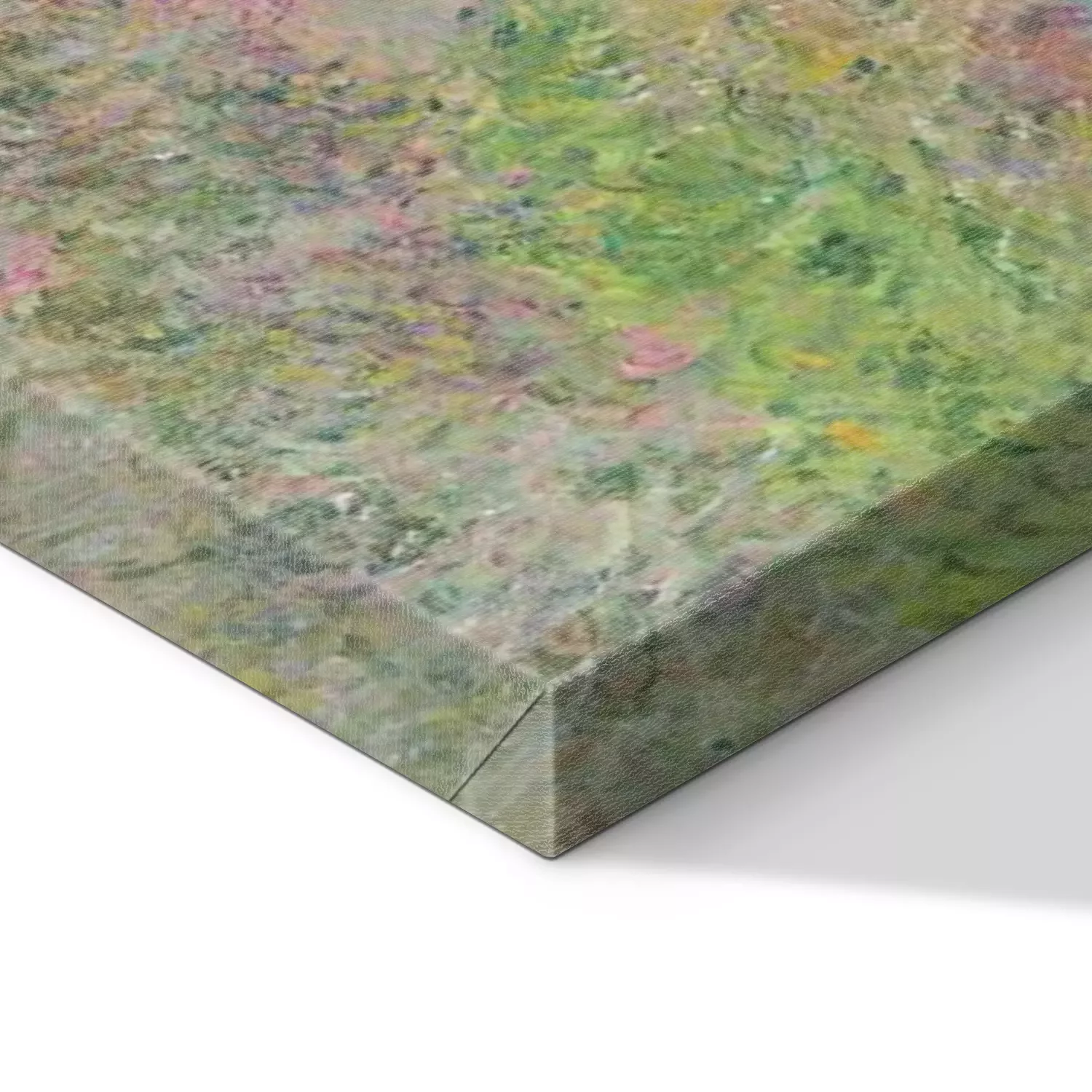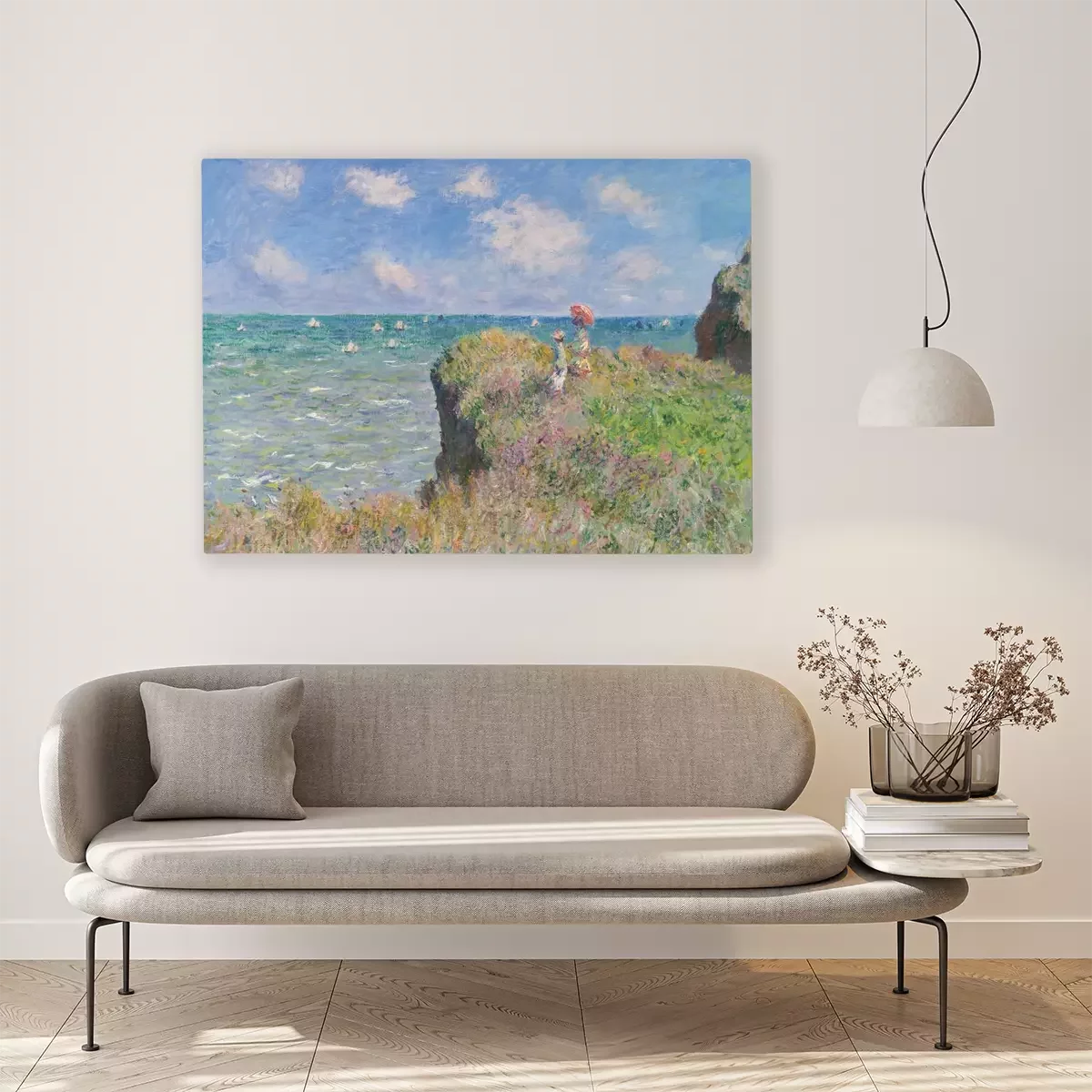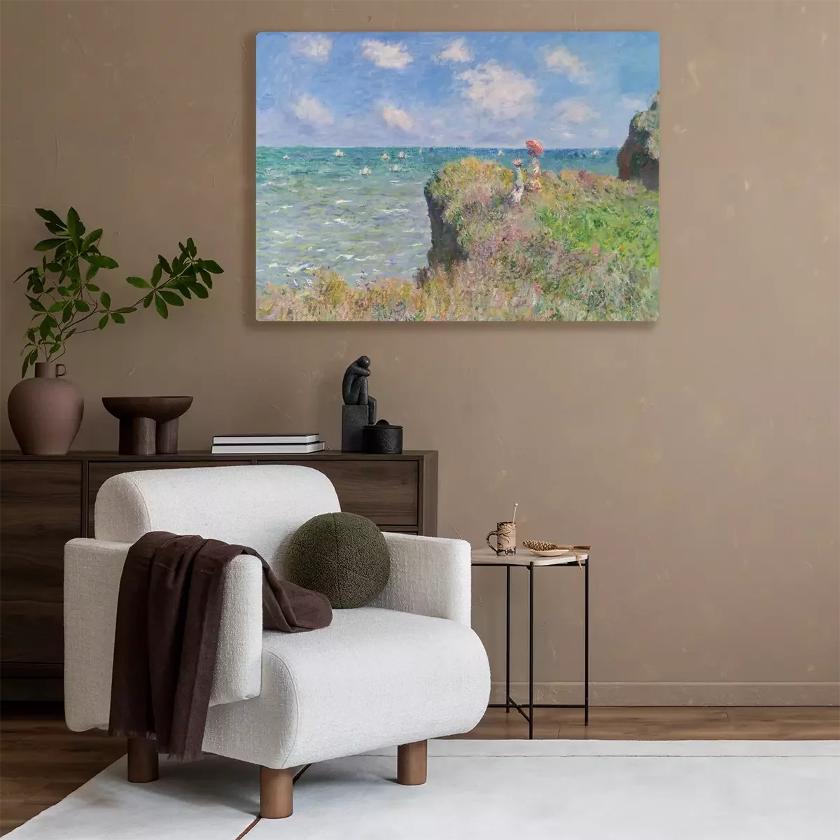 Eine frau mit einem regenschirm auf einer blumenbewachsenen klippe