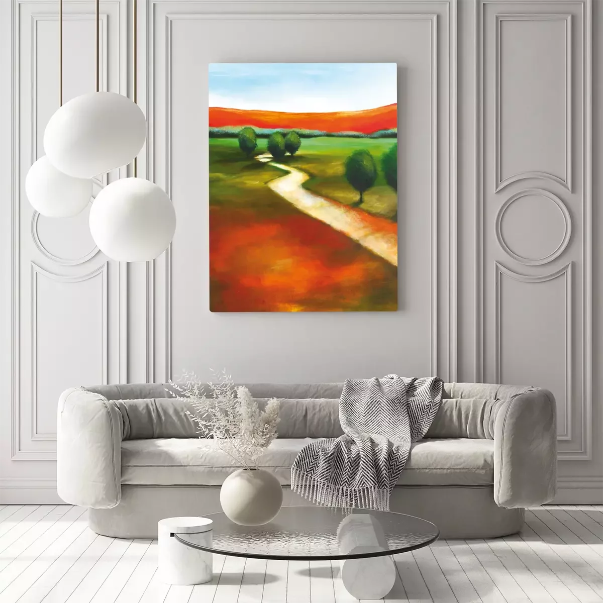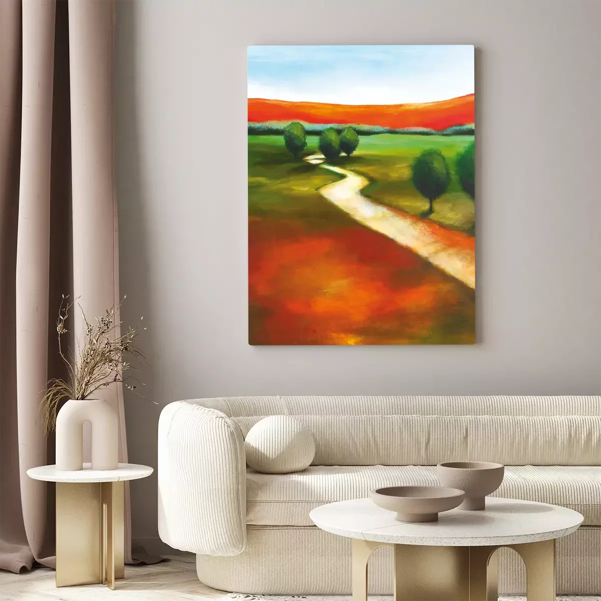 Eine gewundene straße durch eine malerische, abstrakte wiese