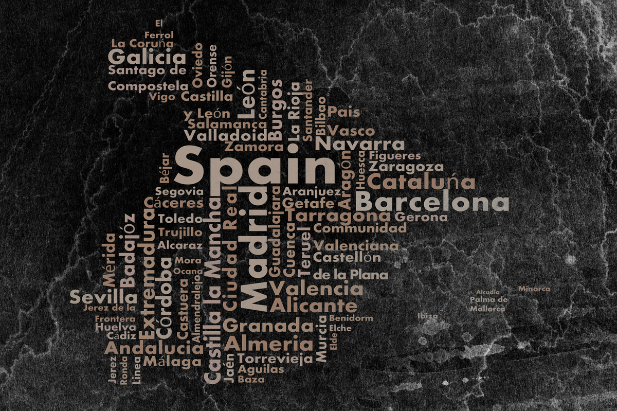 Bild: Eine Karte von Spanien, bestehend aus angeordneten Wörtern auf dunklem Hintergrund.