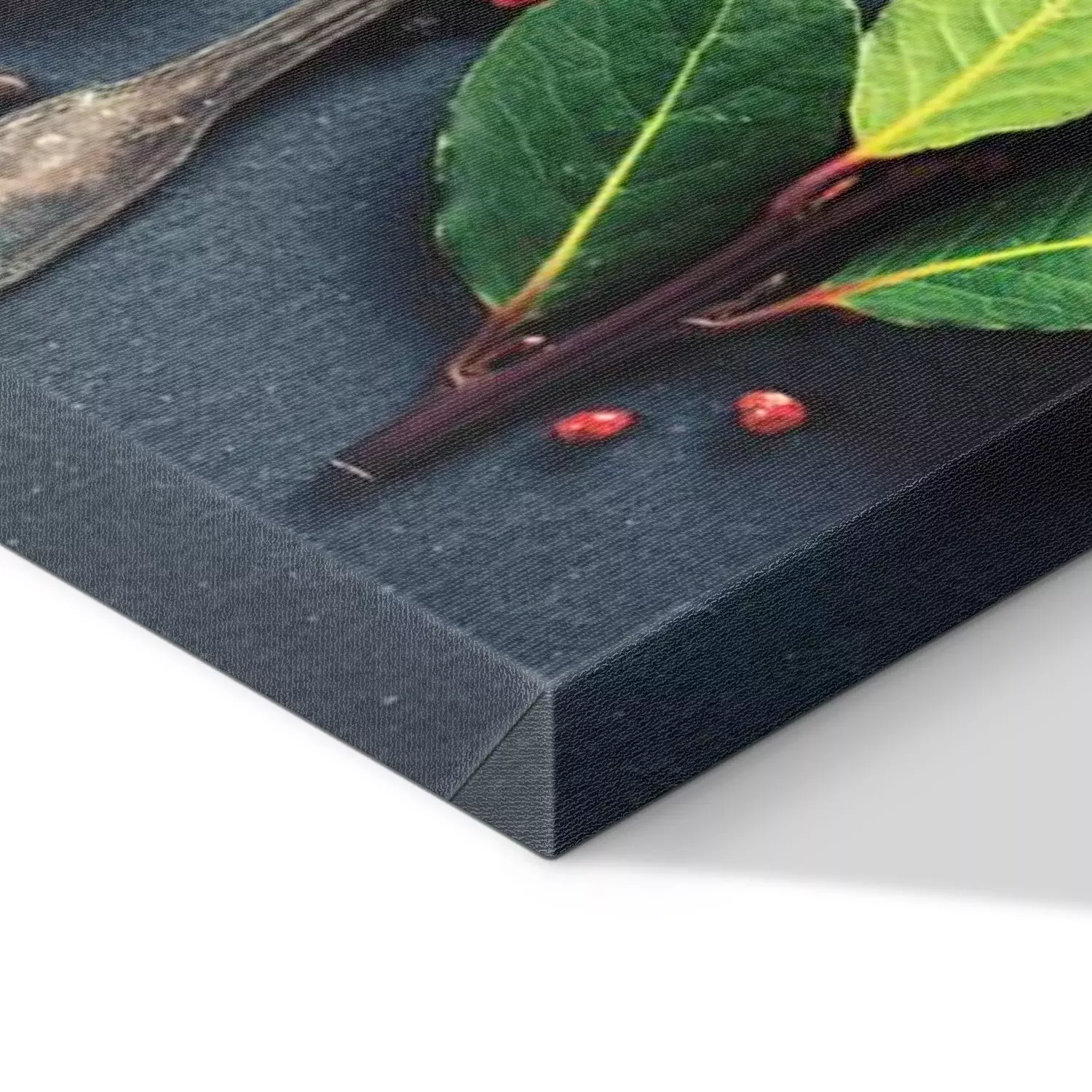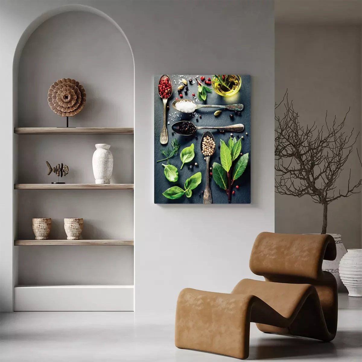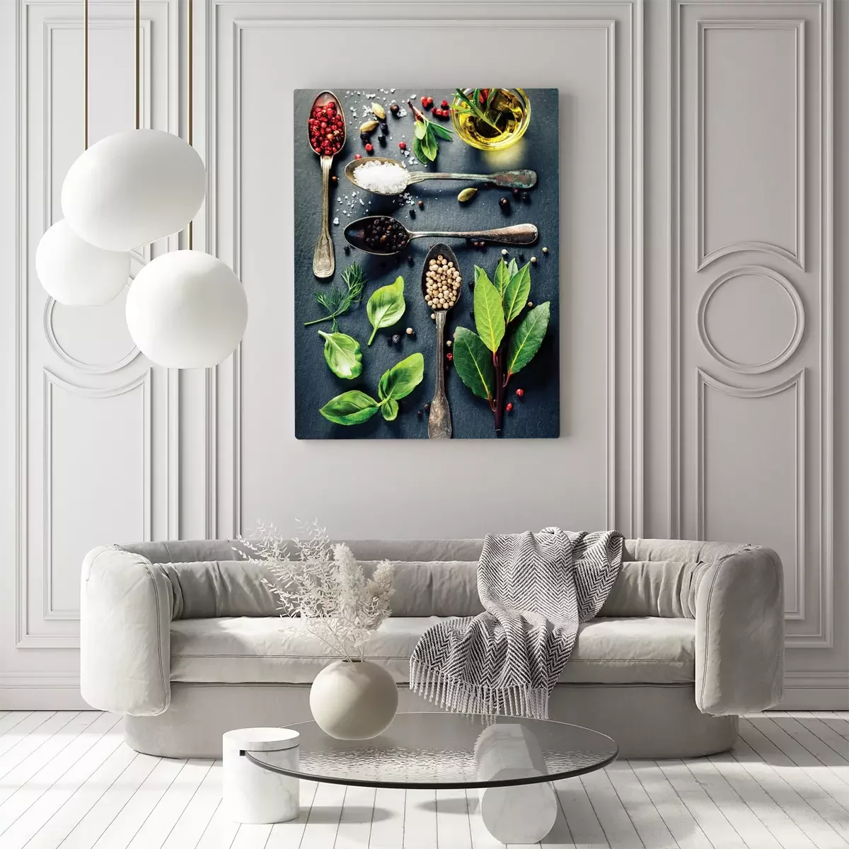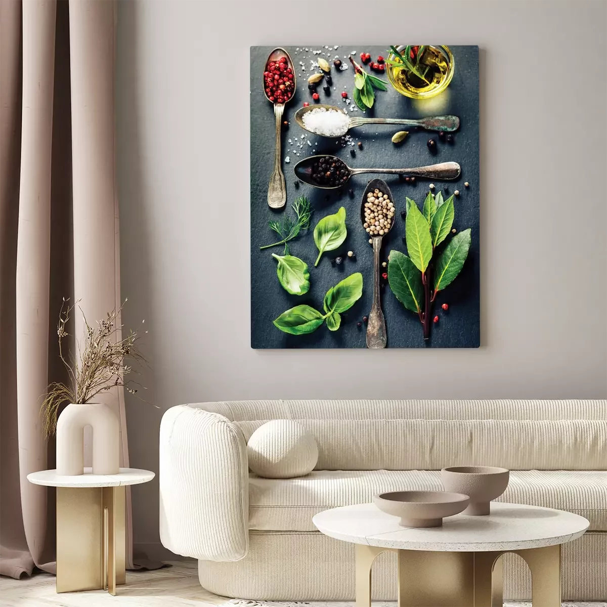 Eine komposition aus gewürzen mit olivenöl und blättern