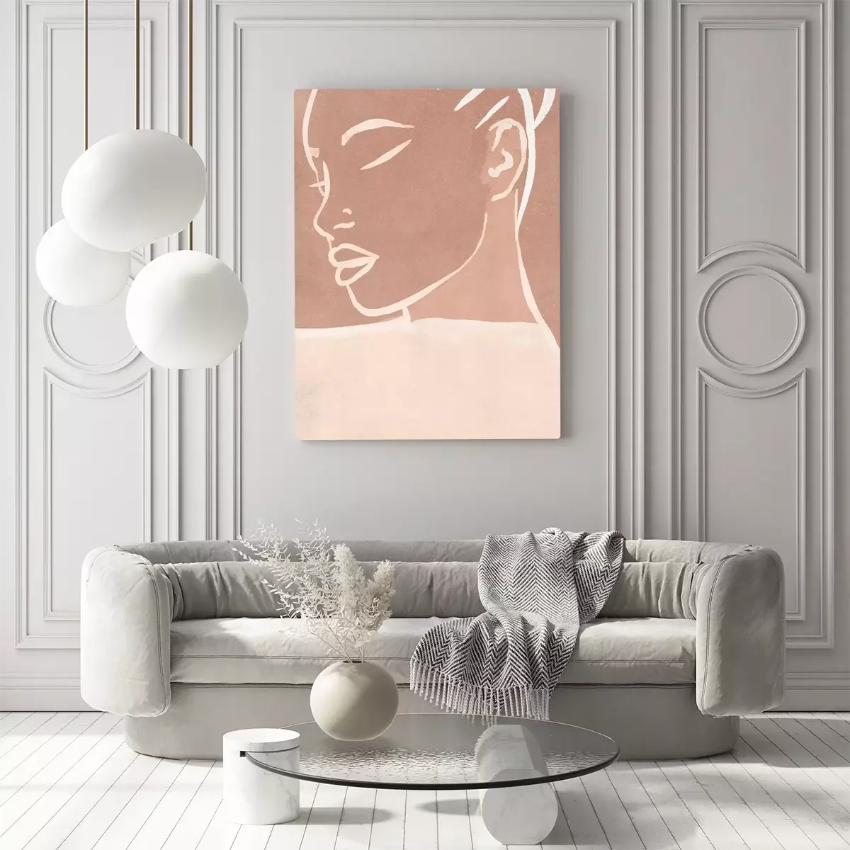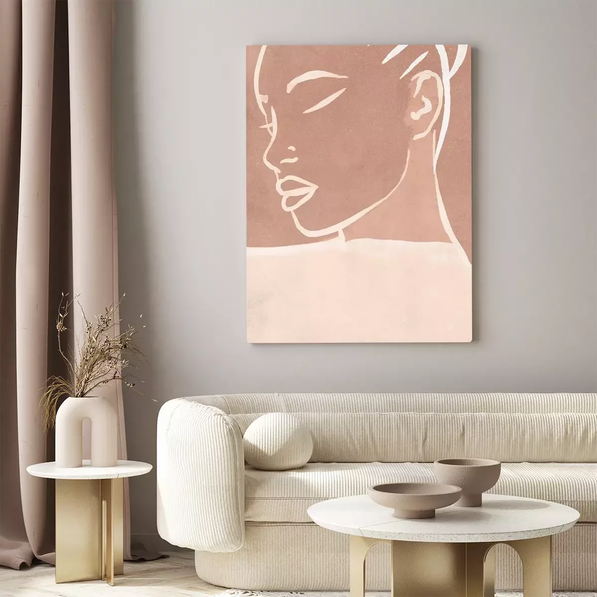 Eine minimalistische zeichnung eines frauengesichts vor warmem hintergrund.