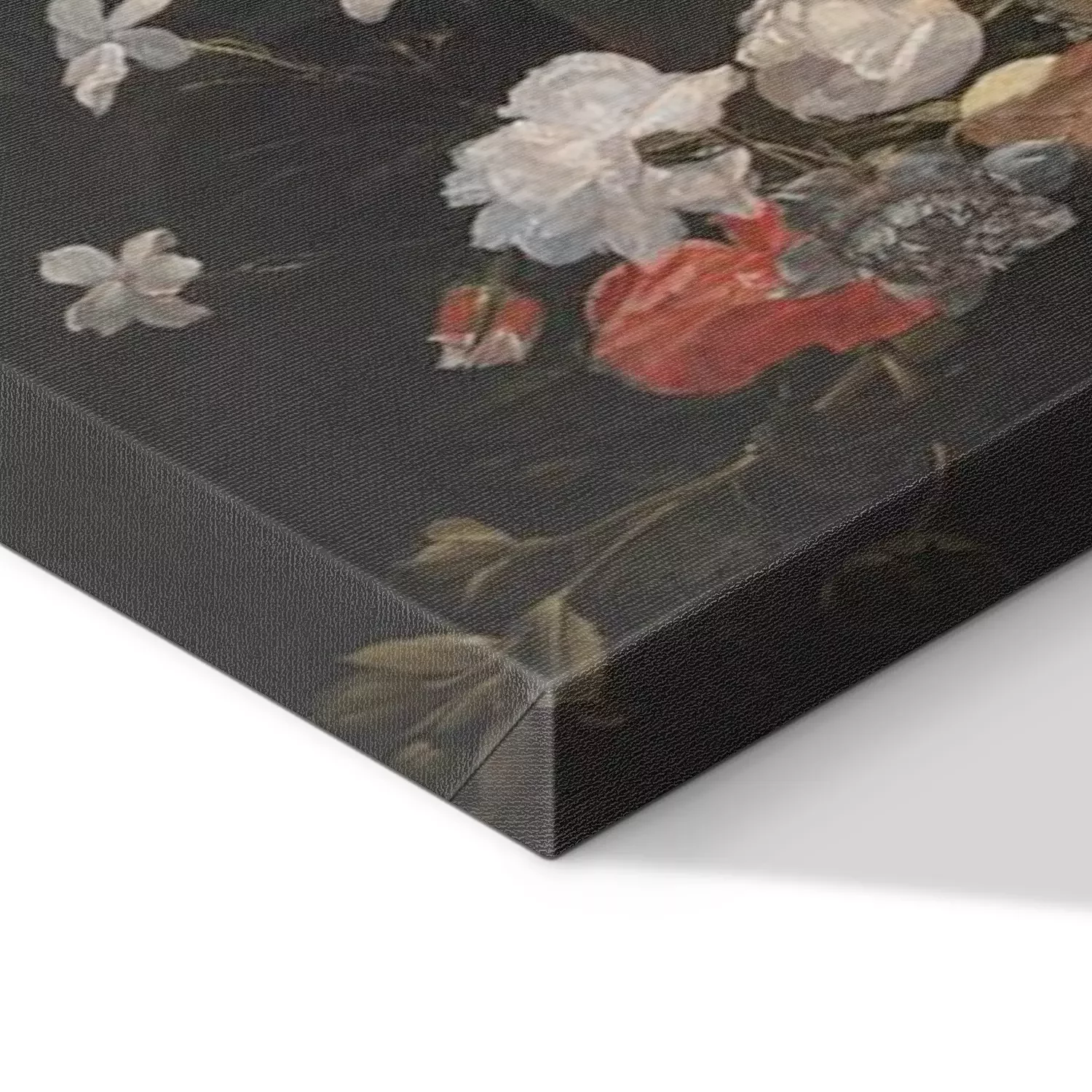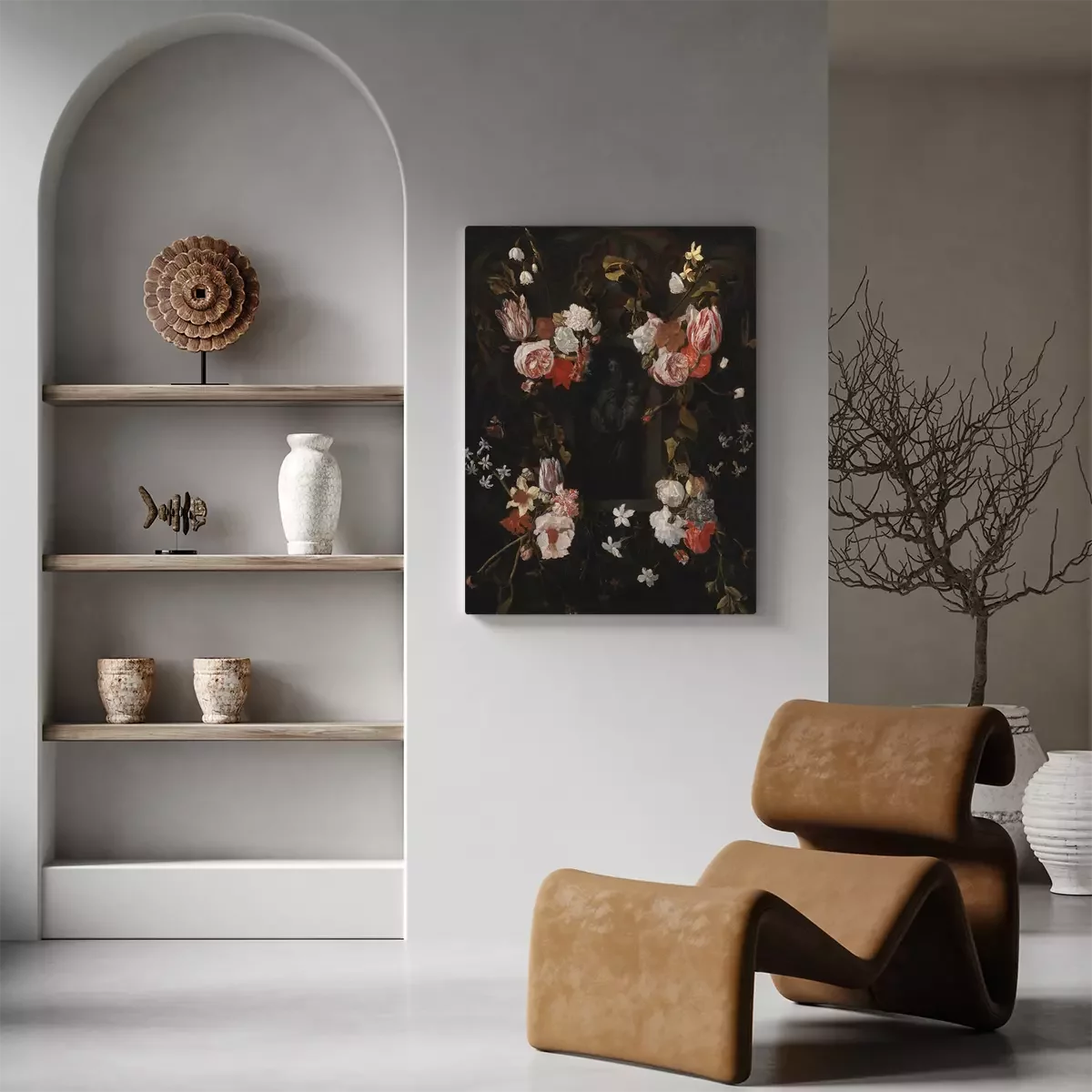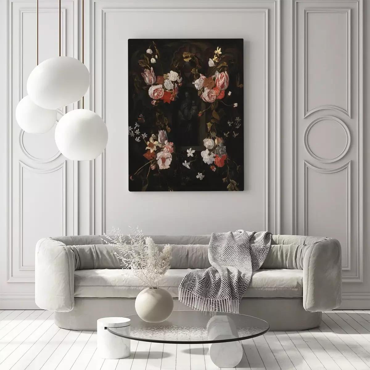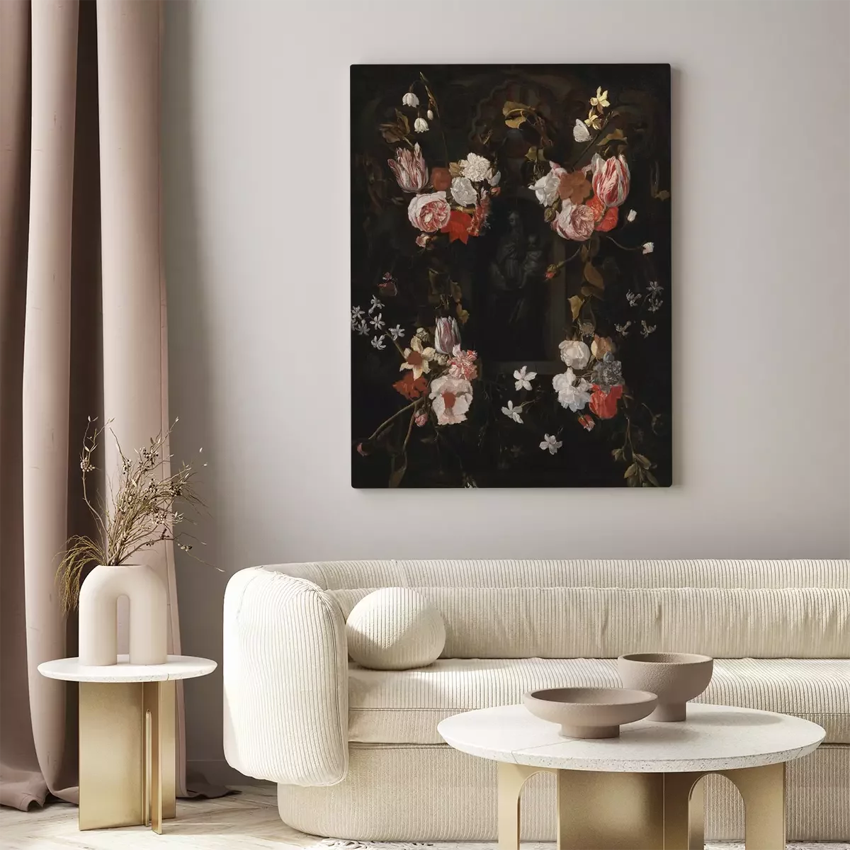 Eine mutter und ihr kind, umhüllt von einem blumengirlande