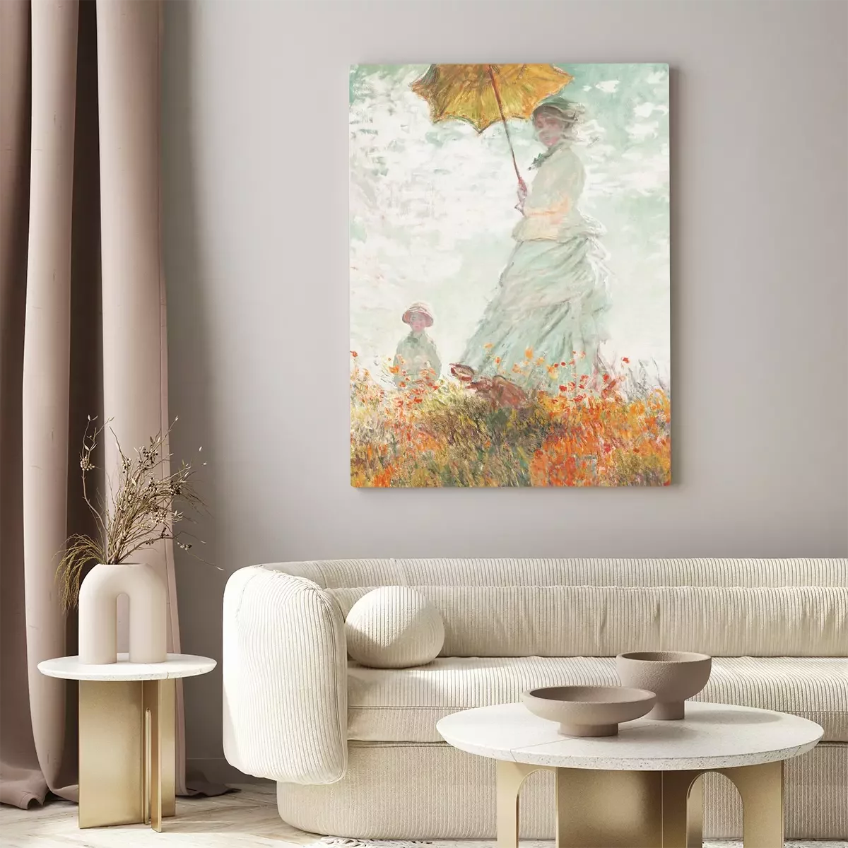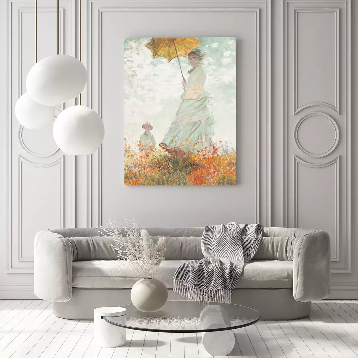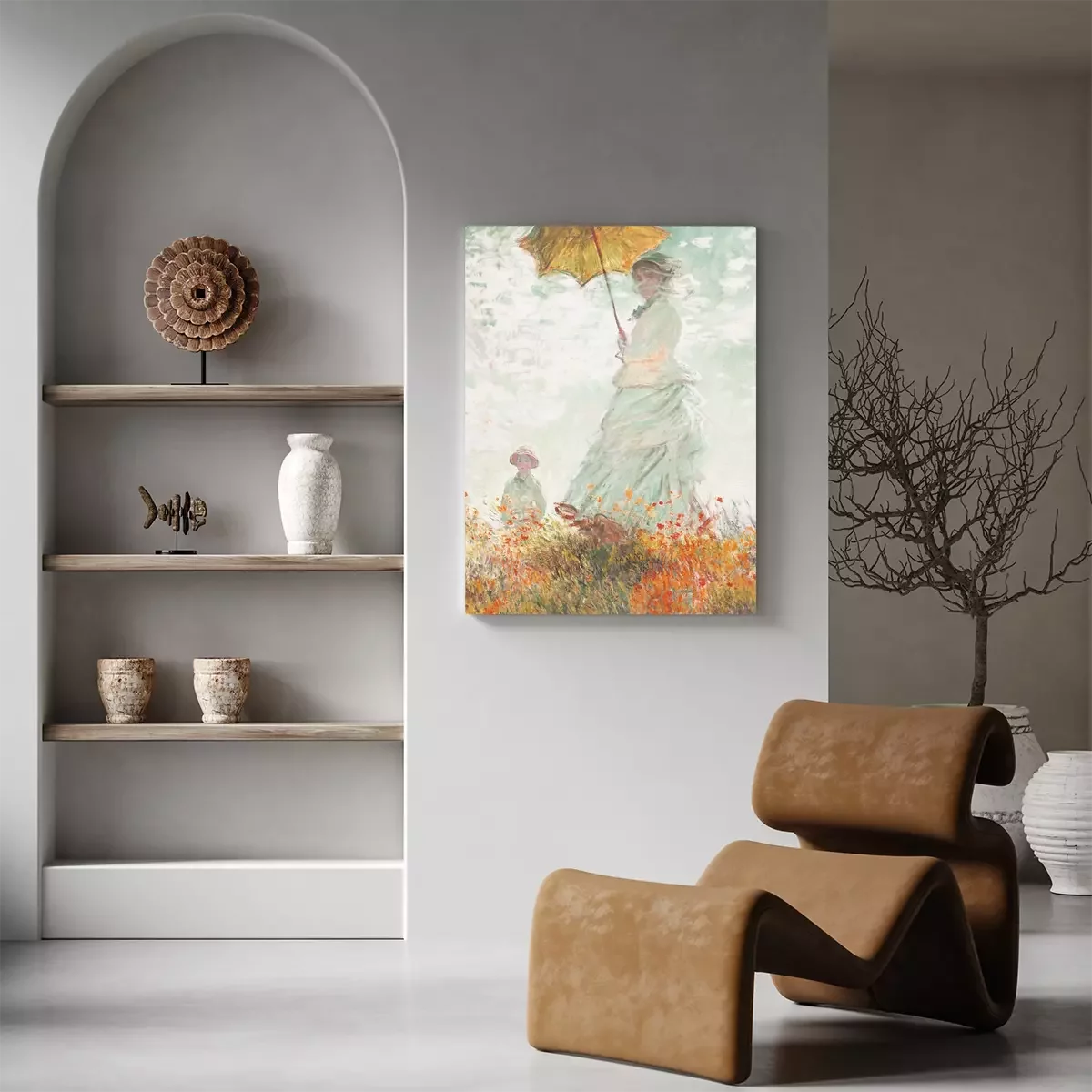 Eine mutter und ihr kind unter einem regenschirm auf einer blühenden wiese