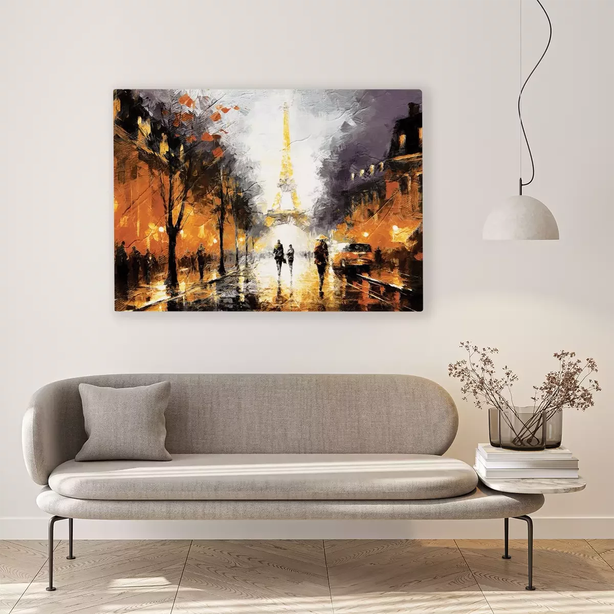 Eine pariser straße, nachts beleuchtet vom eiffelturm