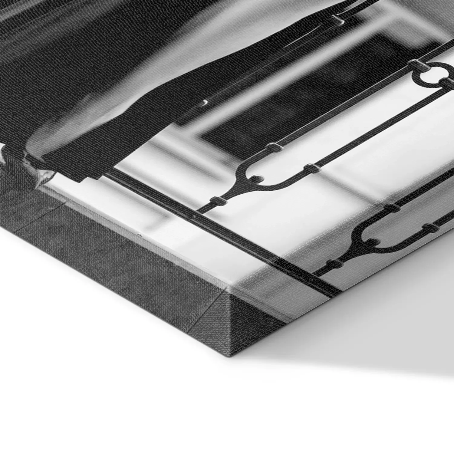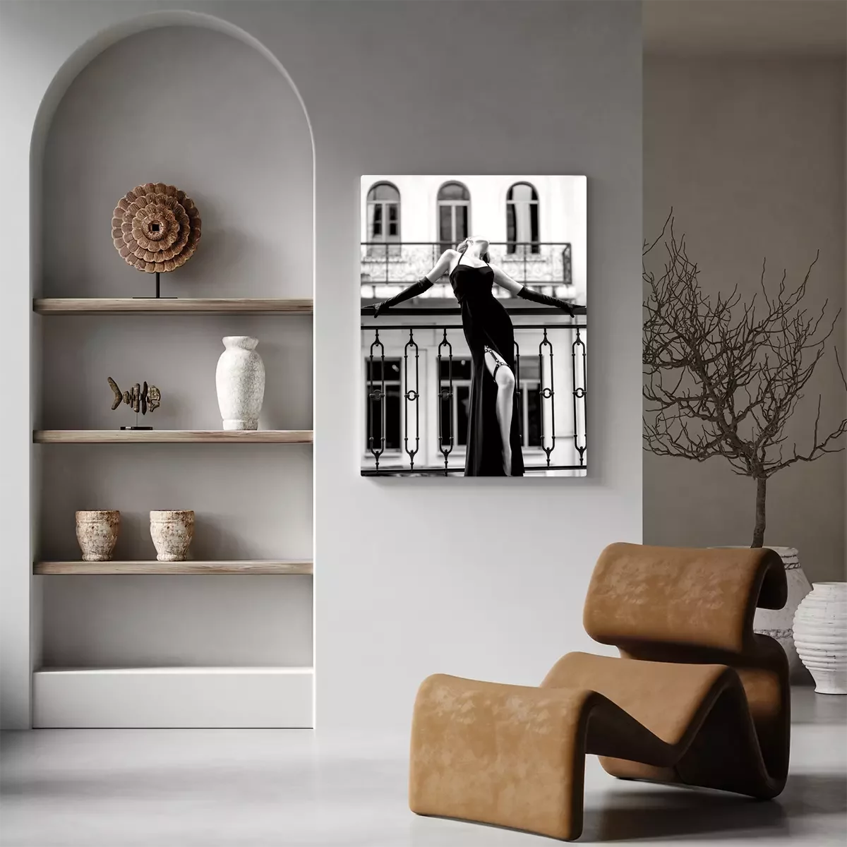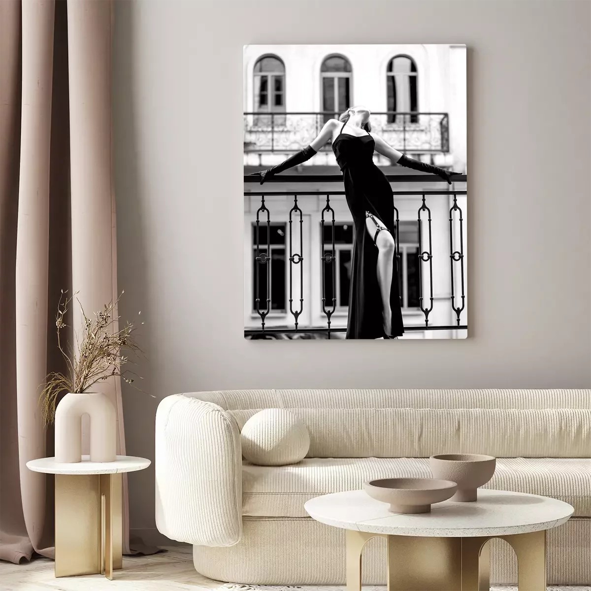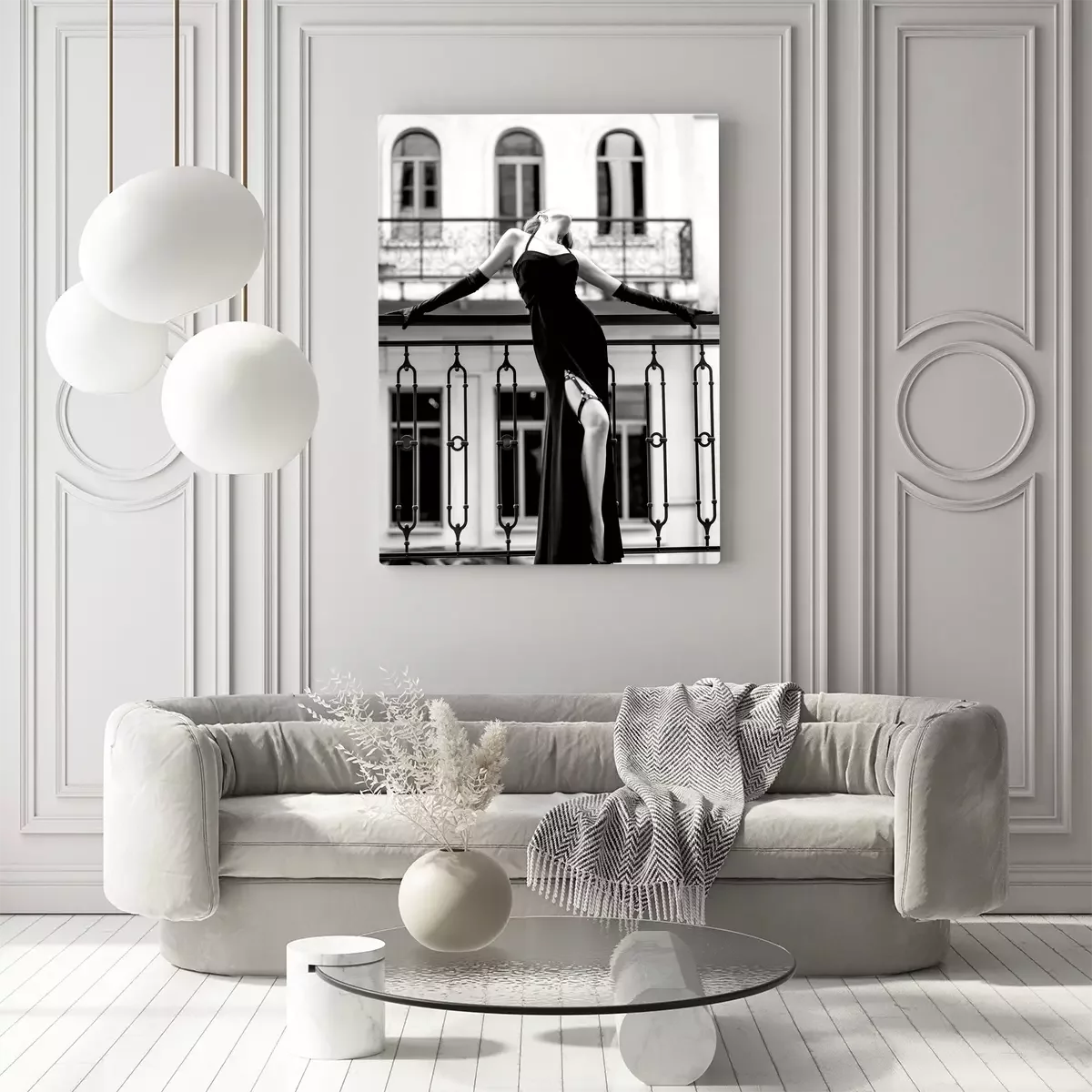 Eine schwarzweißaufnahme einer frau im abendkleid auf einem balkon.