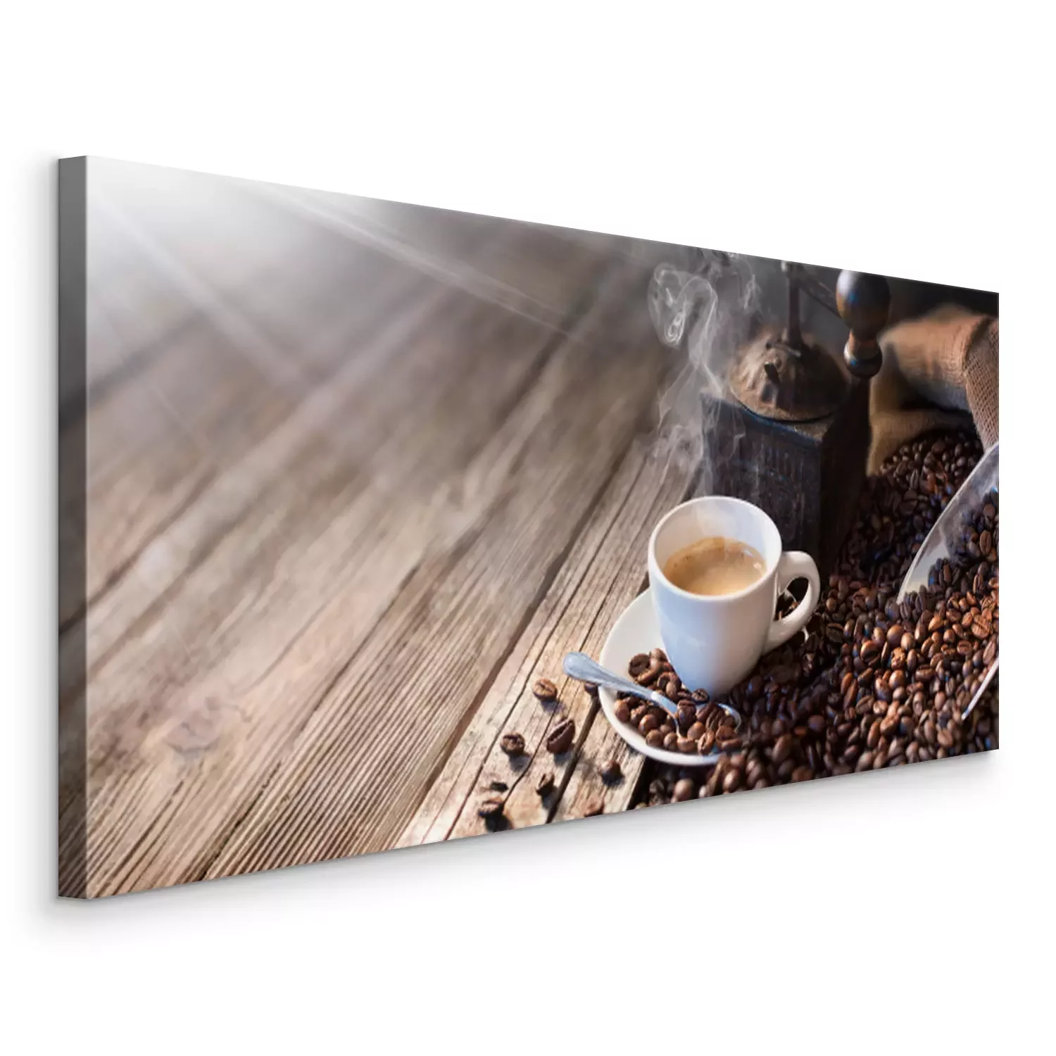Bild Eine Tasse Kaffee mit Kaffeebohnen und einer Kaffeemühle auf Holz