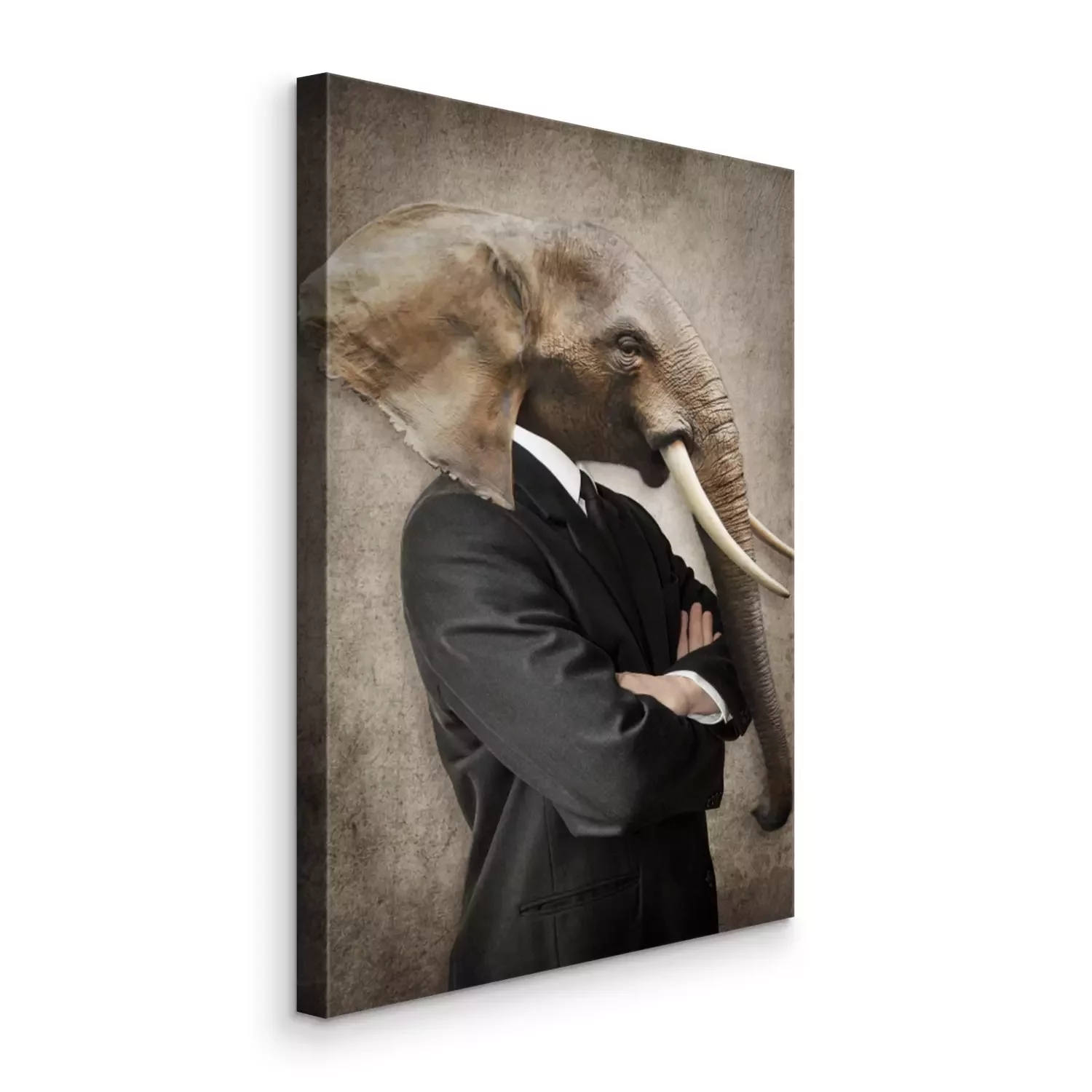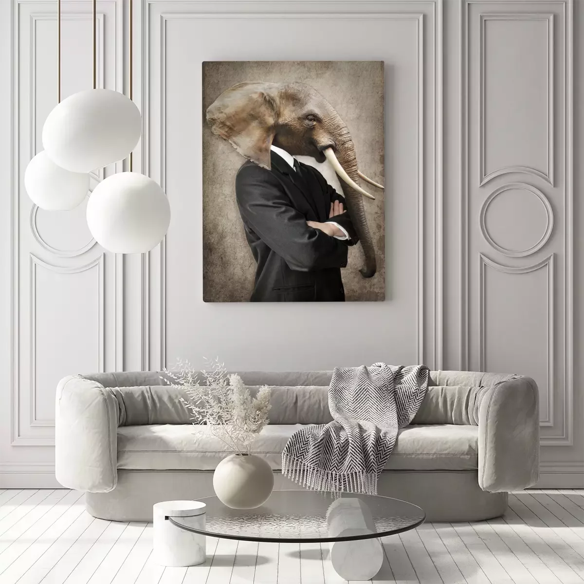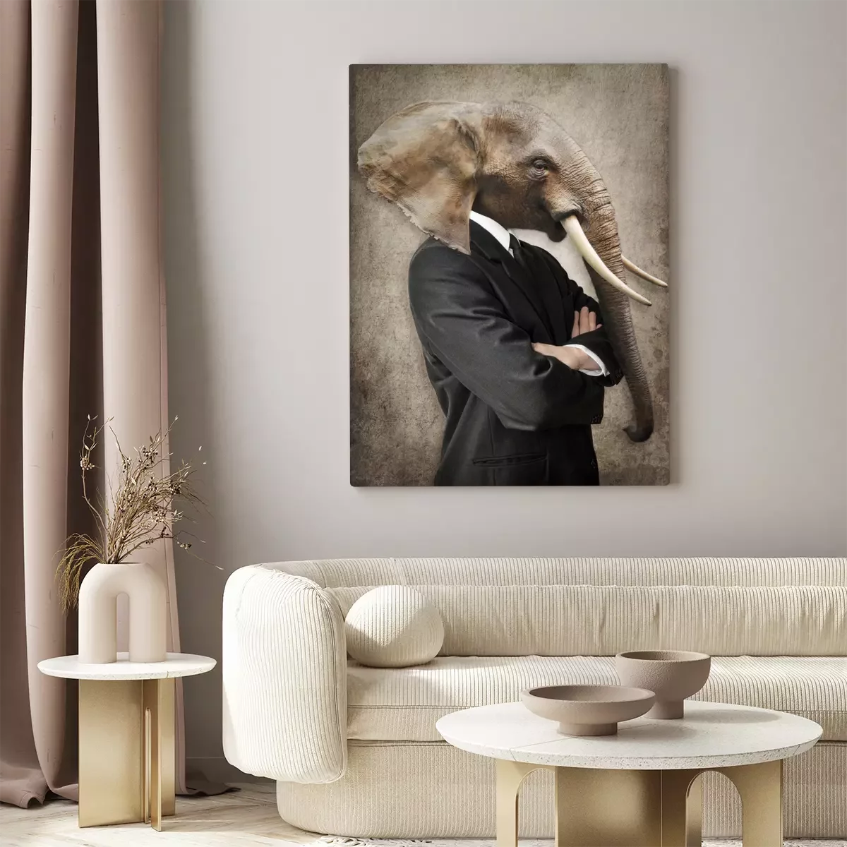 Bild: Elefant in einem Anzug. Mann mit dem Kopf eines Elefanten. Konzept Grafik im Vintage-Stil.