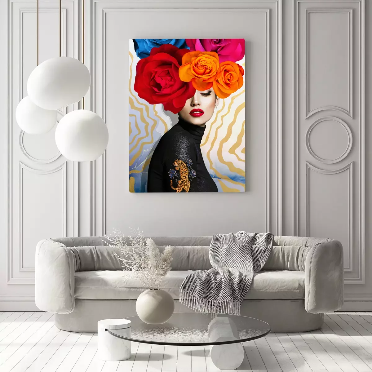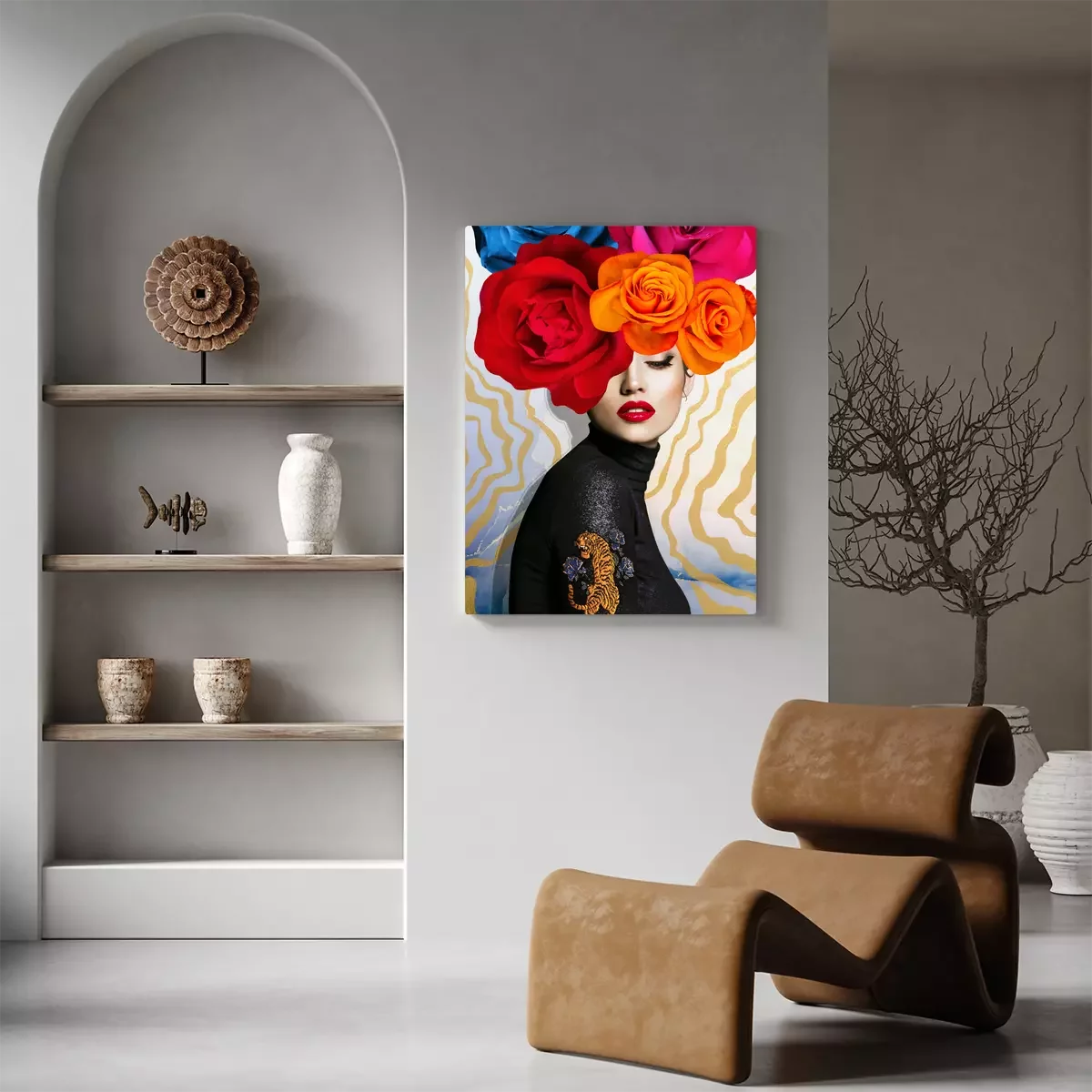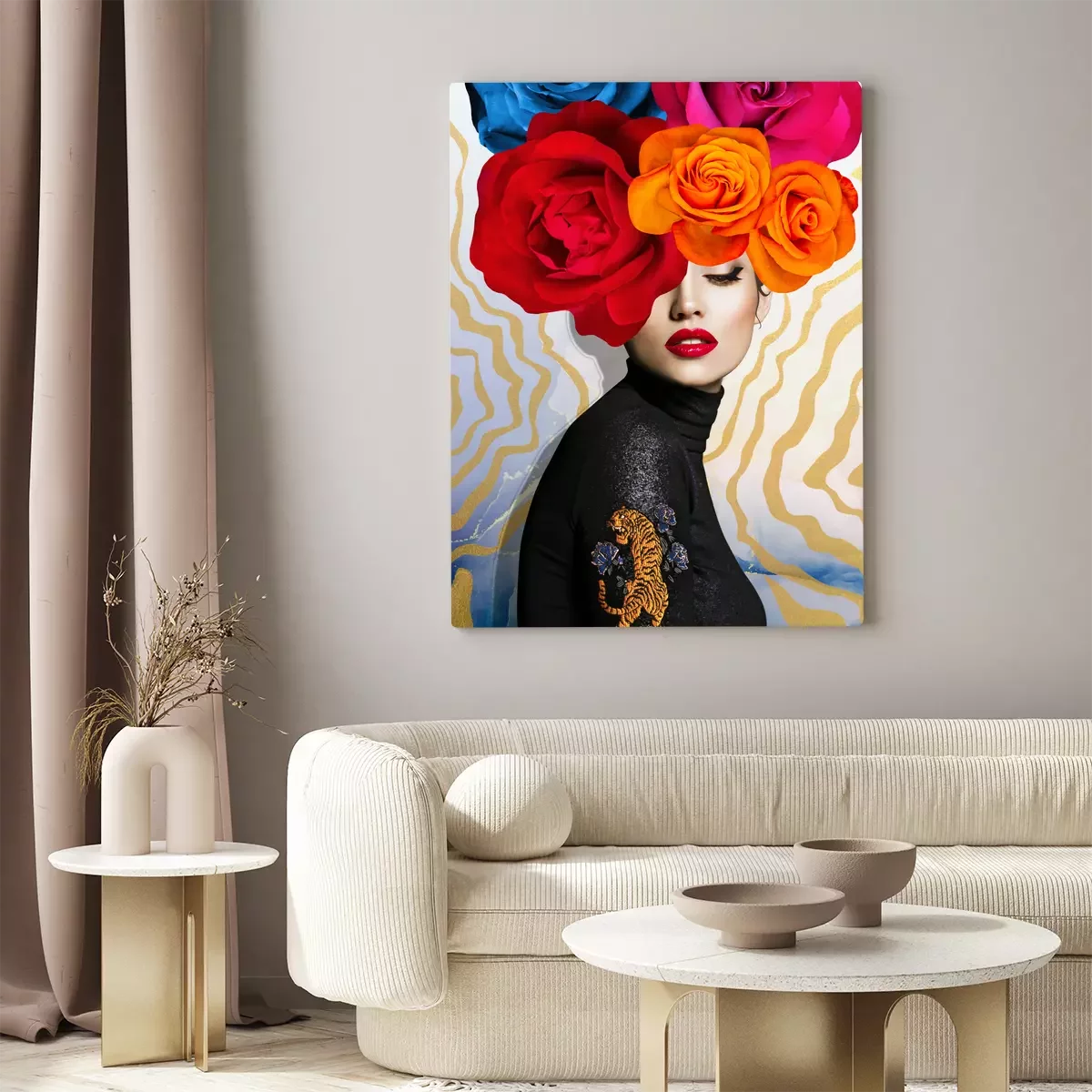 Farbenfrohes porträt einer frau mit blumen im kopf