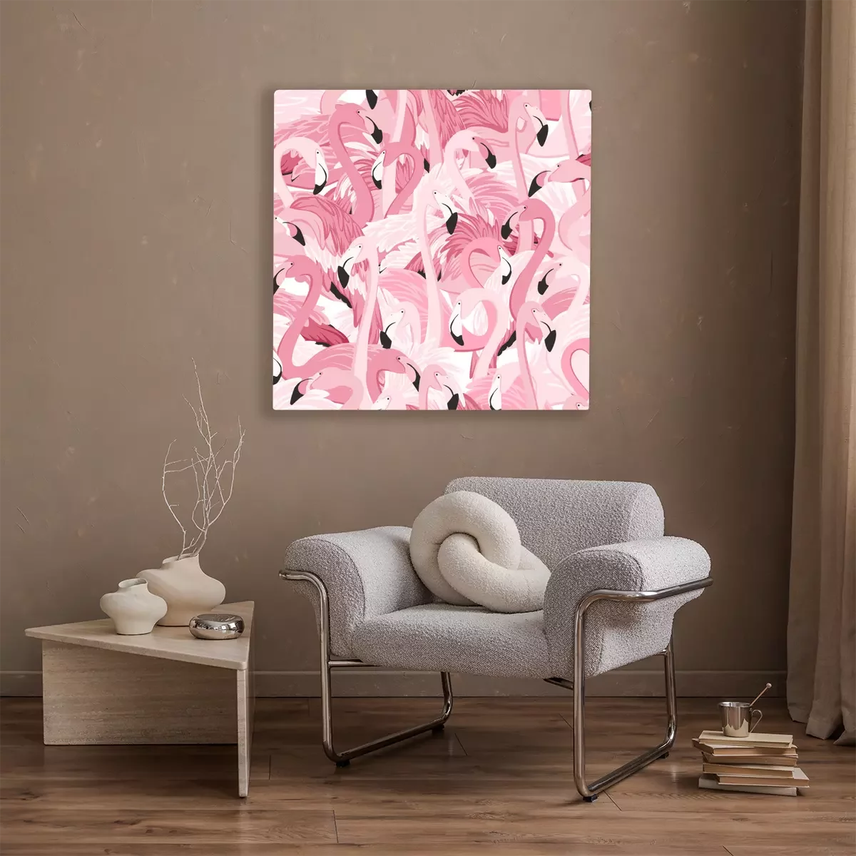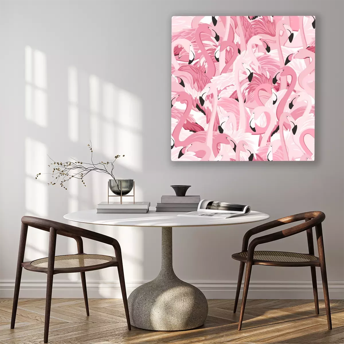 Hellrosa Flamingos auf einem Motiv mit blauem Hintergrund