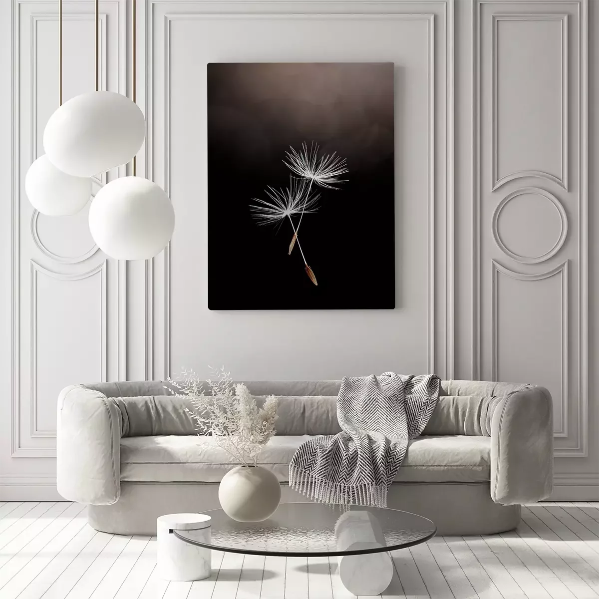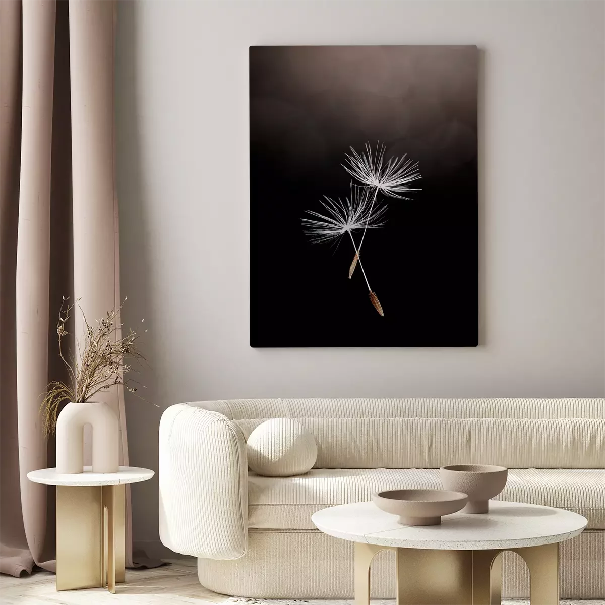 Fliegende löwenzahnsamen auf dunklem hintergrund