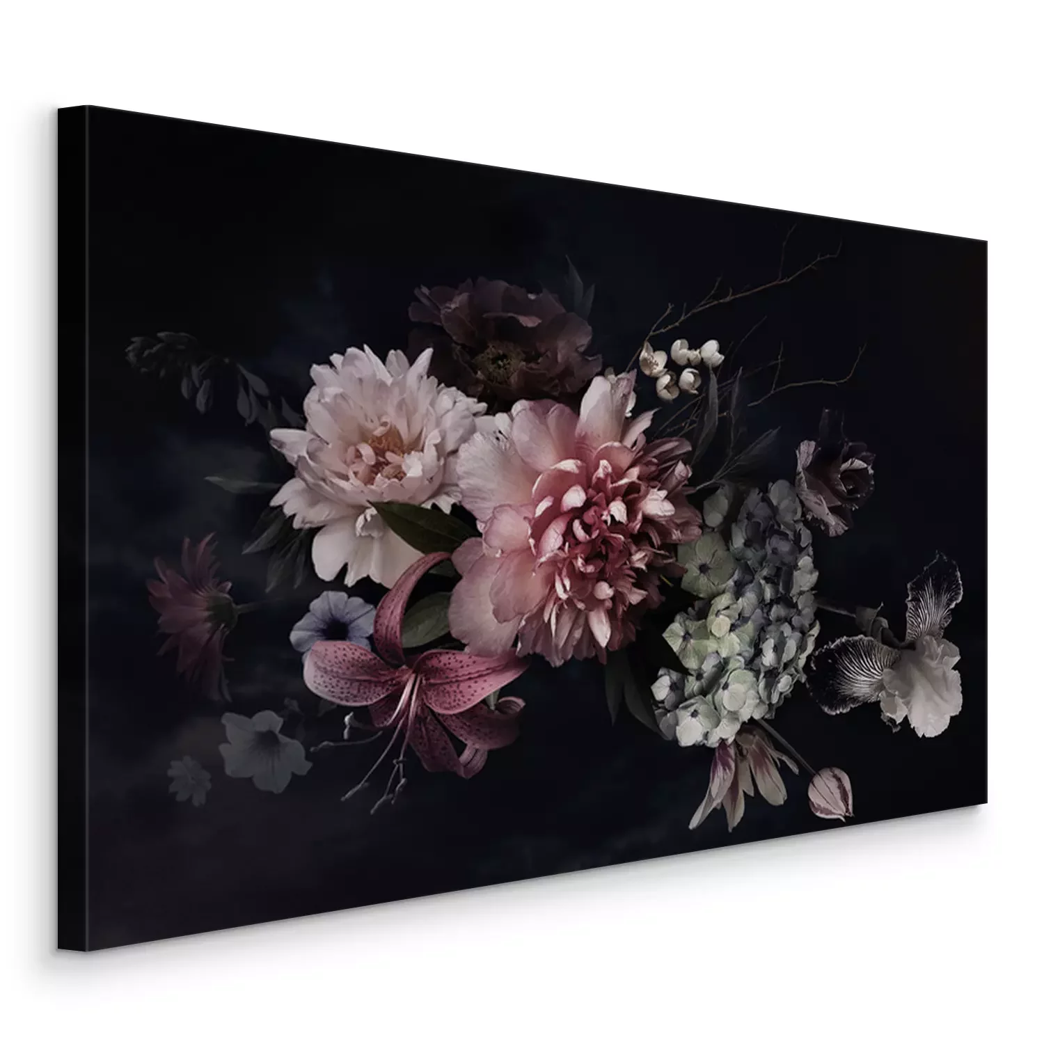 Pfingstrosen in der Dunkelheit des tiefen Schwarzes