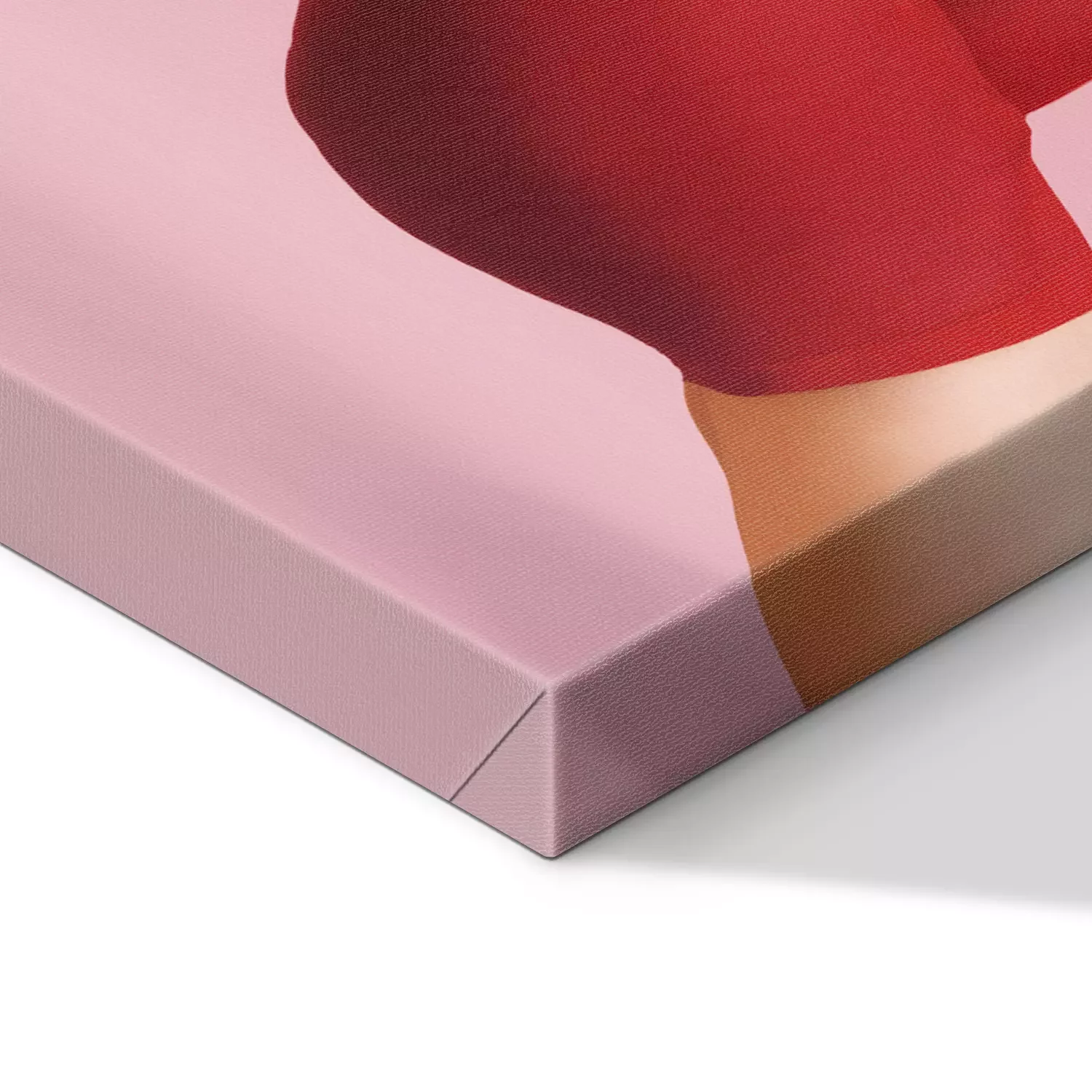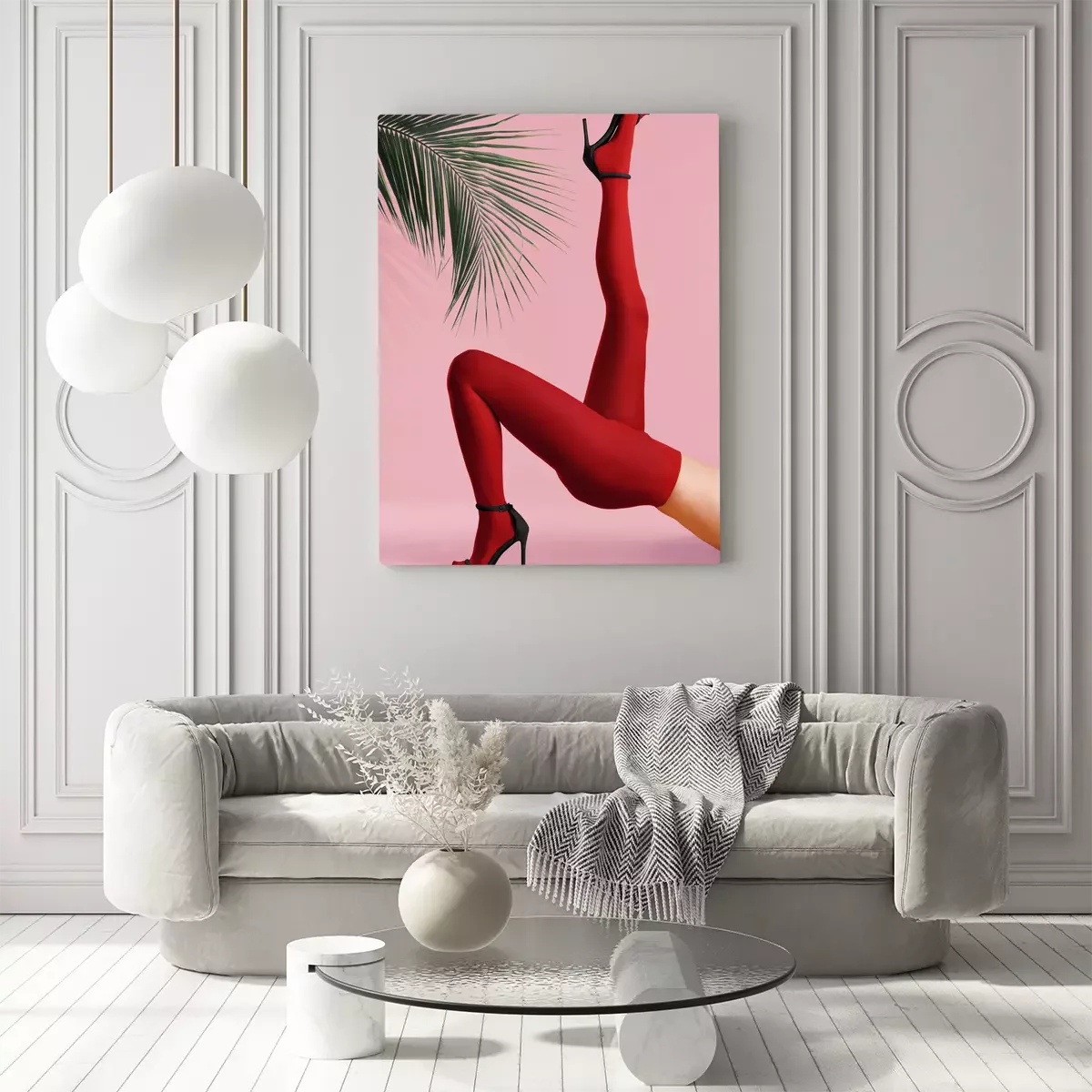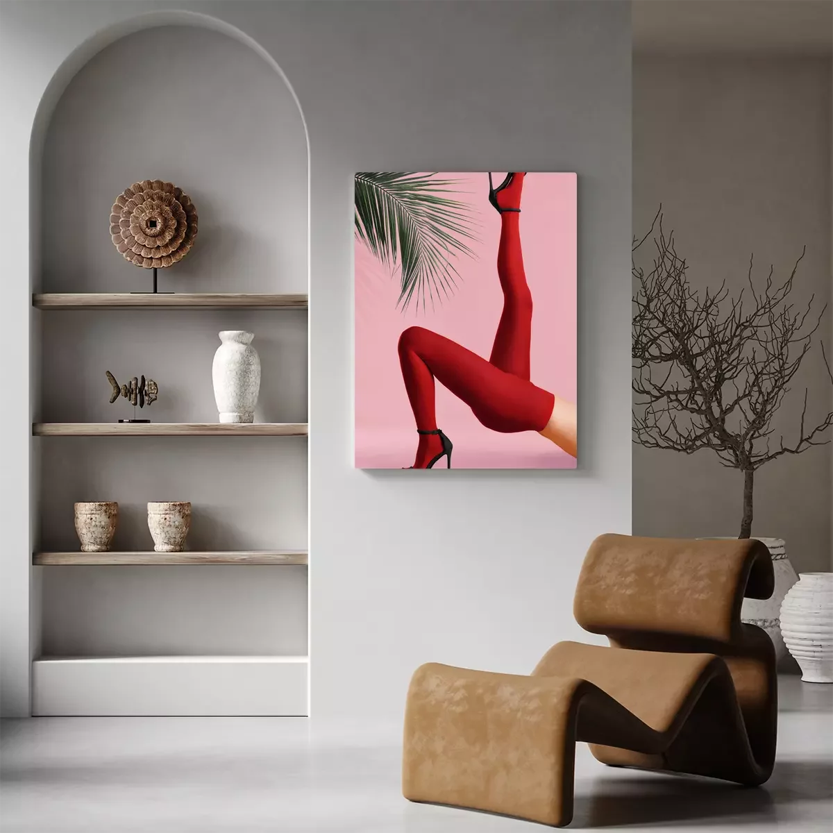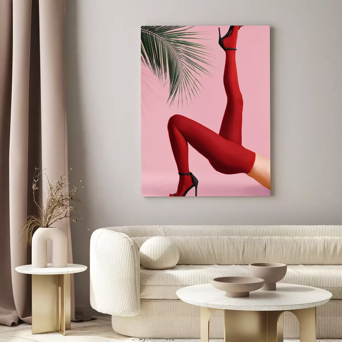 Foto einer frau in roter strumpfhose vor rosa hintergrund