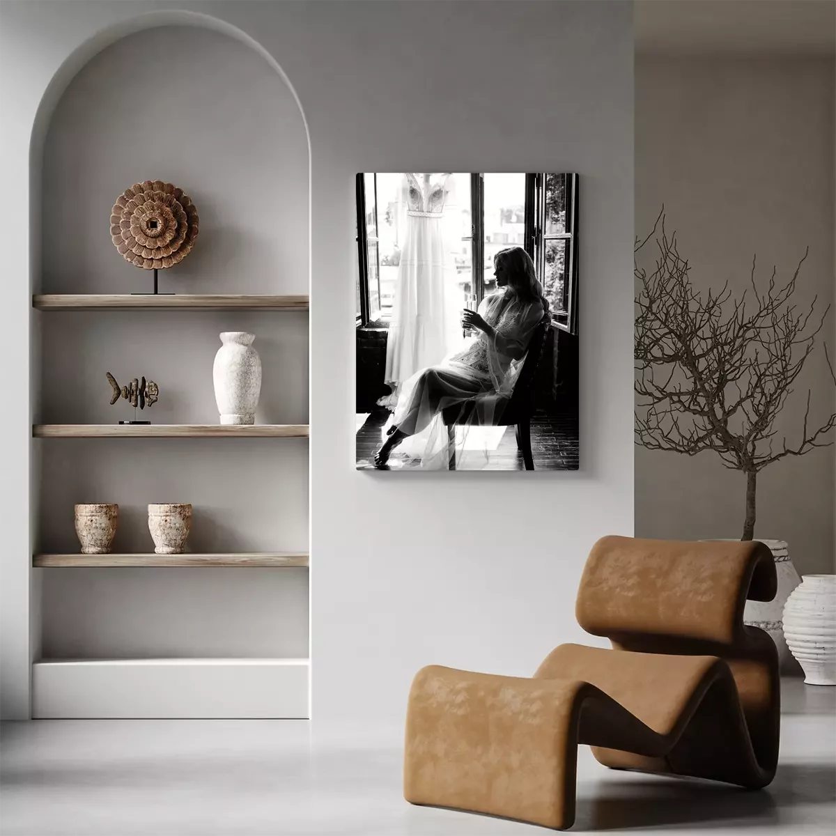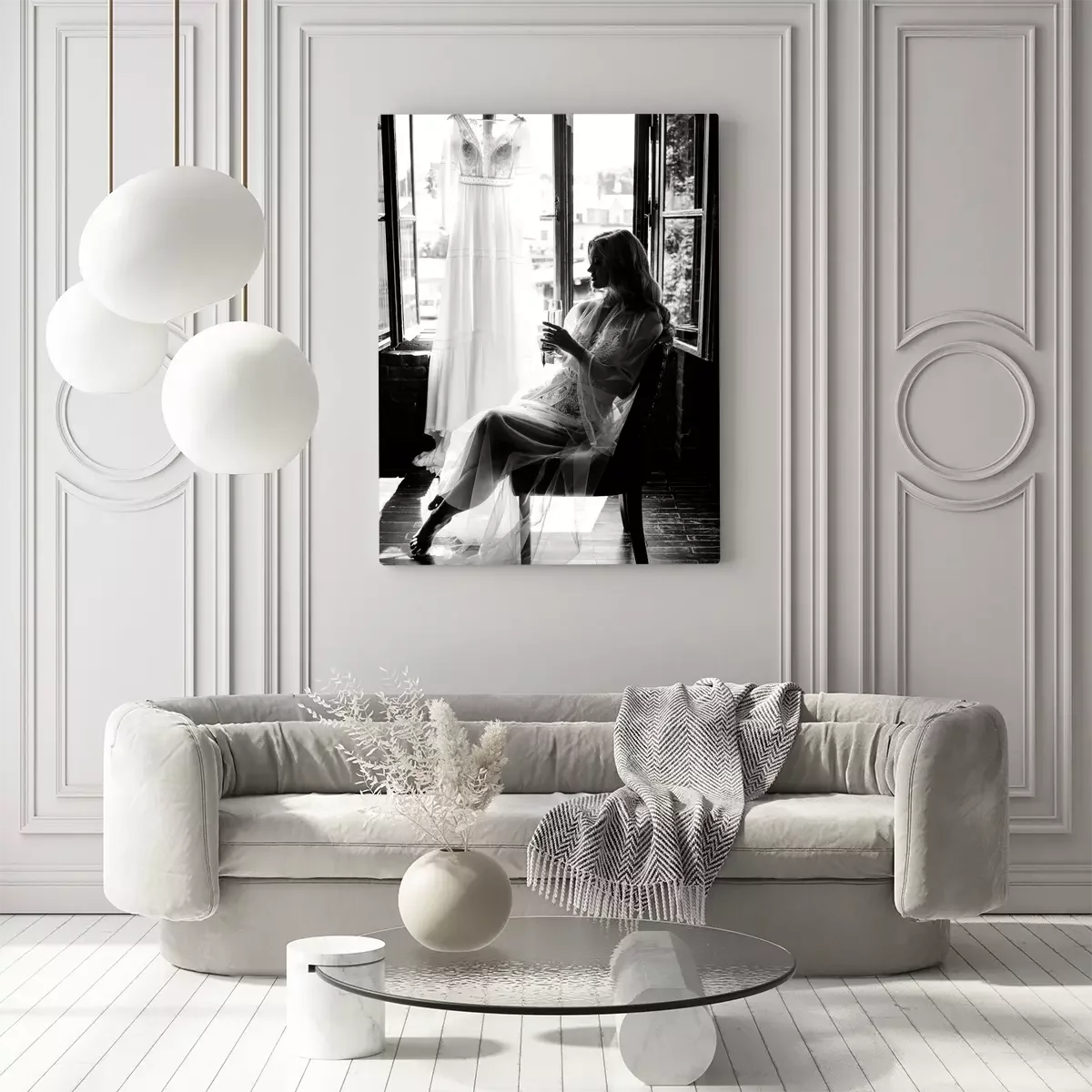 Frau am fenster, brautkleid hängt