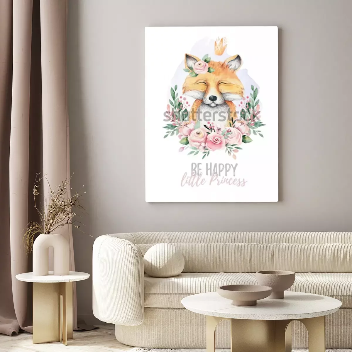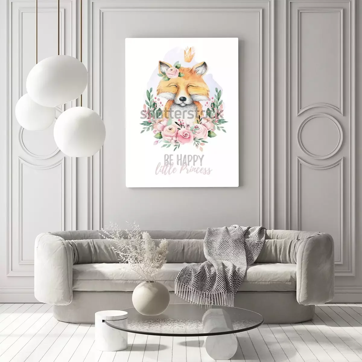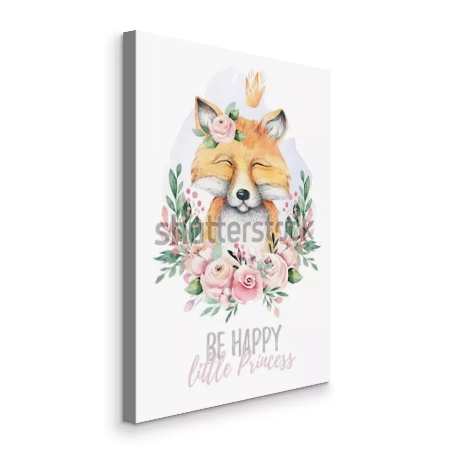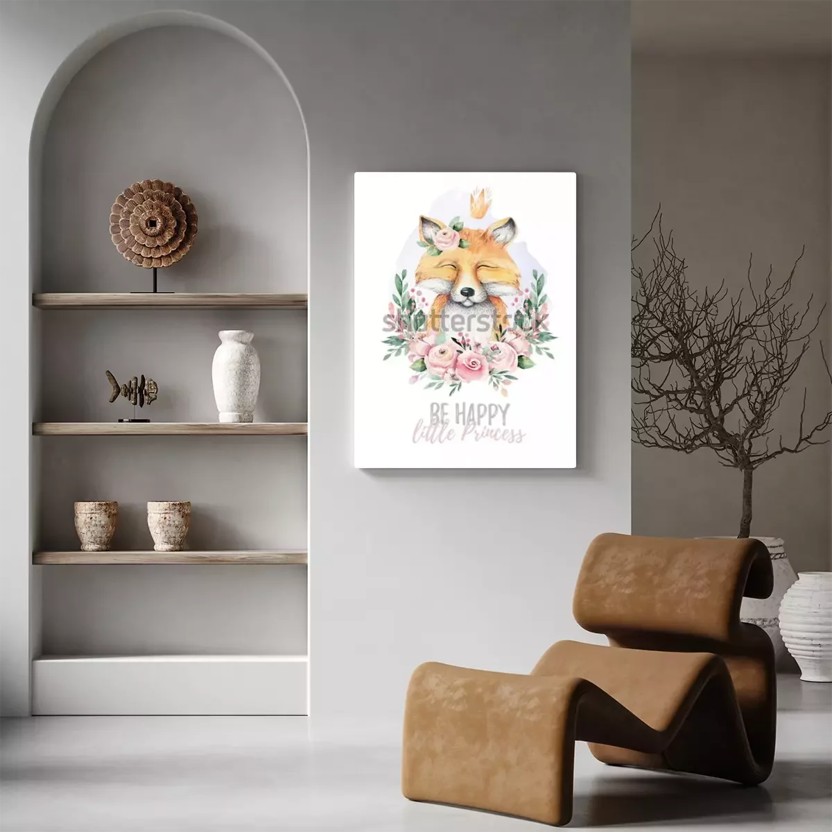 Ein typografisches Bild für Mädchen ist eine ausgezeichnete Möglichkeit, eine fröhliche dekorative Note in die Raumgestaltung zu bringen, die ein Lächeln ins Gesicht des Kindes zaubert. Den Trend zu Mustern mit Aufschriften haben wir mit der derzeitigen Mode für Waldtiere kombiniert. Alle Kinder lieben Tiere. So kannst du sicher sein, dass dies eine hervorragende Lösung ist. Wir entschieden uns für ein außergewöhnliches Bild. Fuchs sieht aus, als wäre er mit Aquarellfarben auf Leinwand gemalt. Das Muster erinnert überhaupt nicht an einen fertigen Druck, sondern an eine wunderschöne, handgefertigte Illustration. Was der Komposition zweifellos einen mädchenhaften Charakter verleiht, sind die üppigen Rosen, die einen Kranz um das Waldtier bilden. Ein weiteres Detail, das Aufmerksamkeit verdient, ist die Krone über dem Kopf des kleinen Fuchses. Sie passt perfekt zu dem Schriftzug: Be happy little princess. In welcher Einrichtung präsentiert sich gut ein solches Bild? Fuchs fügt sich perfekt in skandinavische und im Öko-Stil eingerichtete Stylings ein, die derzeit sehr beliebt sind. Wenn man sich für eine solche Gestaltung entscheidet, kann man dem Kind ein naturverbundenes Zimmer schaffen, und Wanddekorationen mit Waldtieren passen wie angegossen. Da derzeit Kinderzimmerarrangements in gedämpften Farbtönen voll im Trend liegen, ist unser Aquarell Bild die perfekte Lösung. Das Aquarell basiert auf gedeckten, leicht verschwommenen Farben, die helfen, eine Reizüberflutung zu vermeiden. Wenn du weitere Elemente, die mit der Natur und dem Wald in Verbindung gebracht werden, in das Zimmer integrieren möchtest, kannst du verschiedene Arten von Möbelaufklebern mit Motiven wie Kiefernzweigen, Tannenzapfen und Waldtieren wählen. In einer solchen Umgebung präsentiert sich wundervoll das hier vorgestellte Bild. Fuchs kann die Wand über dem Bett mit einer Blumenbettwäsche schmücken oder den Raum über der Spielecke. Hier könnte man ein Tipi-Zelt aufstellen oder eine kleine Hängematte aufhängen, damit sich das Kind wie bei einem echten Camping-Abenteuer unter freiem Himmel fühlt! Und wenn an der Wand noch mehr Platz ist, wähle ein zweites oder sogar ein drittes Bild mit Waldtieren – einem Bären, einem Reh oder einer Eule.