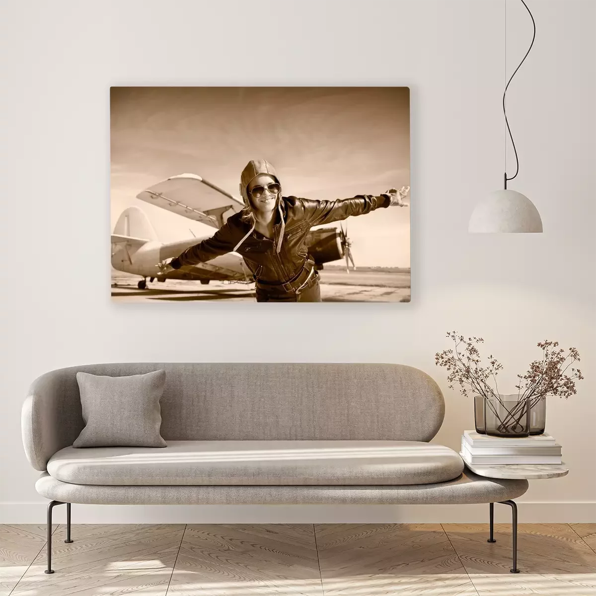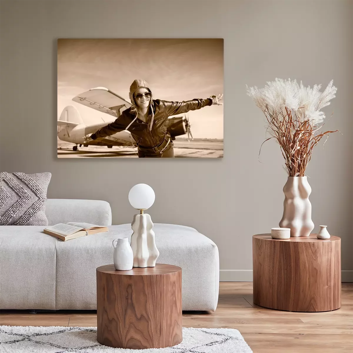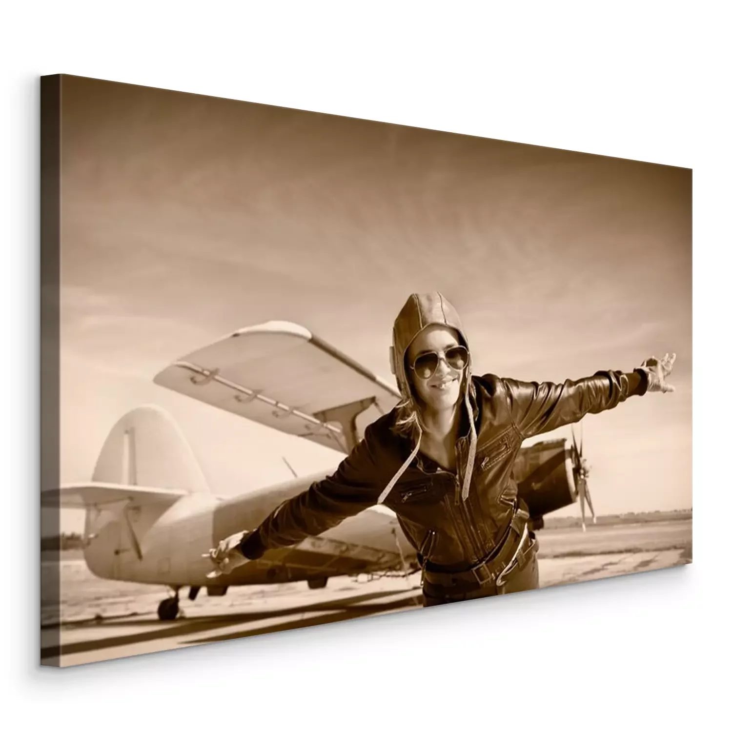Bild Fröhliche Frau und ein Retro-Flugzeug